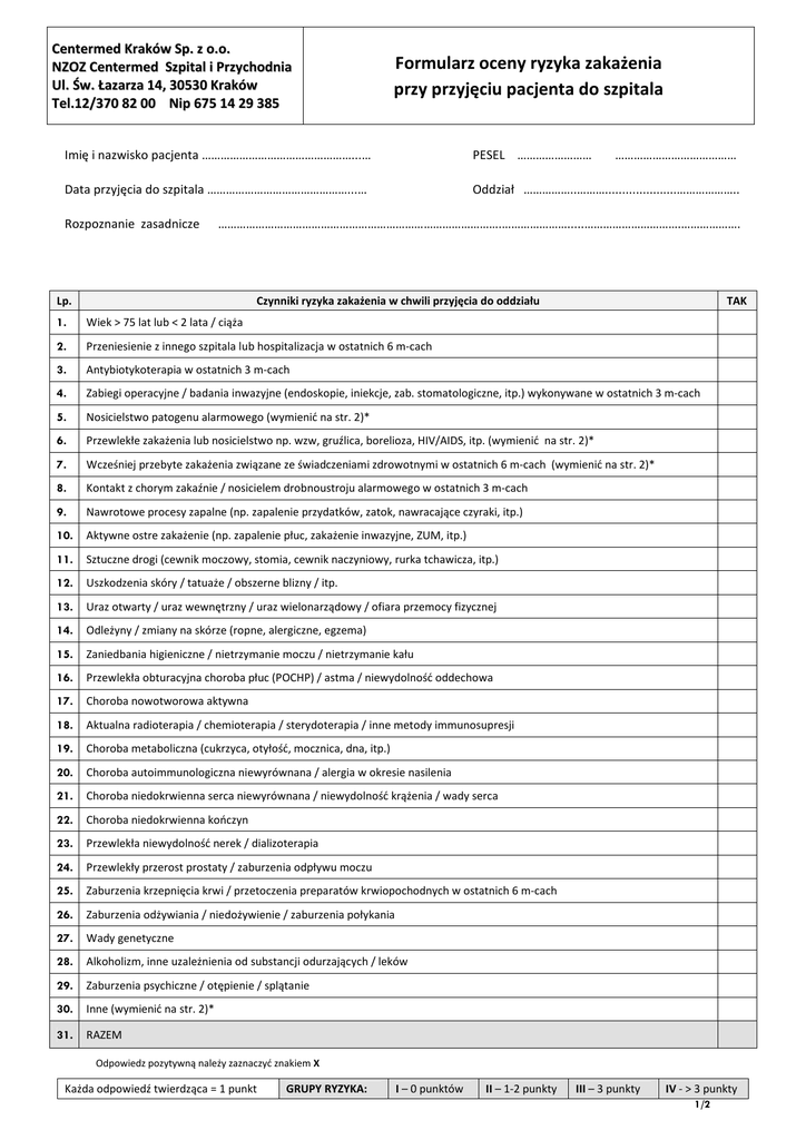 Centermed Kraków Sp. z o.o. NZOZ Centermed Szpital i Przychodnia Ul. Św. Łazarza 14, 30530 Kraków Tel.12/370 82 00 Nip 675 14 29 385 Formularz oceny ryzyka zakażenia przy przyjęciu pacjenta do szpitala Imię i nazwisko pacjenta …………………………………………...… PESEL …………………… Data przyjęcia do szpitala ………………………………………...… Oddział ……………..……….....................……………….. Rozpoznanie zasadnicze ………………………………… ……………………………………………………………………………….………………….....………………………….………………. Lp. Czynniki ryzyka zakażenia w chwili przyjęcia do oddziału TAK 1. Wiek > 75 lat lub < 2 lata / ciąża 2. Przeniesienie z innego szpitala lub hospitalizacja w ostatnich 6 m-cach 3. Antybiotykoterapia w ostatnich 3 m-cach 4. Zabiegi operacyjne / badania inwazyjne (endoskopie, iniekcje, zab. stomatologiczne, itp.) wykonywane w ostatnich 3 m-cach 5. Nosicielstwo patogenu alarmowego (wymienić na str. 2)* 6. Przewlekłe zakażenia lub nosicielstwo np. wzw, gruźlica, borelioza, HIV/AIDS, itp. (wymienić na str. 2)* 7. Wcześniej przebyte zakażenia związane ze świadczeniami zdrowotnymi w ostatnich 6 m-cach (wymienić na str. 2)* 8. Kontakt z chorym zakaźnie / nosicielem drobnoustroju alarmowego w ostatnich 3 m-cach 9. Nawrotowe procesy zapalne (np. zapalenie przydatków, zatok, nawracające czyraki, itp.) 10. Aktywne ostre zakażenie (np. zapalenie płuc, zakażenie inwazyjne, ZUM, itp.) 11. Sztuczne drogi (cewnik moczowy, stomia, cewnik naczyniowy, rurka tchawicza, itp.) 12. Uszkodzenia skóry / tatuaże / obszerne blizny / itp. 13. Uraz otwarty / uraz wewnętrzny / uraz wielonarządowy / ofiara przemocy fizycznej 14. Odleżyny / zmiany na skórze (ropne, alergiczne, egzema) 15. Zaniedbania higieniczne / nietrzymanie moczu / nietrzymanie kału 16. Przewlekła obturacyjna choroba płuc (POCHP) / astma / niewydolność oddechowa 17. Choroba nowotworowa aktywna 18. Aktualna radioterapia / chemioterapia / sterydoterapia / inne metody immunosupresji 19. Choroba metaboliczna (cukrzyca, otyłość, mocznica, dna, itp.) 20. Choroba autoimmunologiczna niewyrównana / alergia w okresie nasilenia 21. Choroba niedokrwienna serca niewyrównana / niewydolność krążenia / wady serca 22. Choroba niedokrwienna kończyn 23. Przewlekła niewydolność nerek / dializoterapia 24. Przewlekły przerost prostaty / zaburzenia odpływu moczu 25. Zaburzenia krzepnięcia krwi / przetoczenia preparatów krwiopochodnych w ostatnich 6 m-cach 26. Zaburzenia odżywiania / niedożywienie / zaburzenia połykania 27. Wady genetyczne 28. Alkoholizm, inne uzależnienia od substancji odurzających / leków 29. Zaburzenia psychiczne / otępienie / splątanie 30. Inne (wymienić na str. 2)* 31. RAZEM Odpowiedz pozytywną należy zaznaczyć znakiem X Każda odpowiedź twierdząca = 1 punkt GRUPY RYZYKA: I – 0 punktów II – 1-2 punkty III – 3 punkty IV - > 3 punkty 1/2 Centermed Kraków Sp. z o.o. NZOZ Centermed Szpital i Przychodnia Ul. Św. Łazarza 14, 30530 Kraków Tel.12/370 82 00 Nip 675 14 29 385 Chorego zakwalifikowano do …………...….. Formularz oceny ryzyka zakażenia przy przyjęciu pacjenta do szpitala grupy ryzyka z liczbą punktów ……………………..…. Uwagi na temat koniecznych procedur wskazanych dla redukcji ryzyka ……………………………………………………………………………………………….………………………………………………….………….……… ……………………………………………………………….………………………………………………………………………………….………….……… ……………………………………………………………………………………………………………………………………………..……………….……… * nazwa patogenu alarmowego, zakażenia, choroby zakaźnej …………………………………………….………………………………………………………………………………………………..…………………... …………………………………………….……………………………………………………………………………………..……………………………... Inne uwagi …………………………………………….………………………………………………………………………………………..………………………... …………………………………………….…………………………………………………………………………………..……………………………... ……………………………………. Data wypełnienia Każda odpowiedź twierdząca = 1 punkt ………………………………………………… Pieczęć i podpis osoby wypełniającej GRUPY RYZYKA: I – 0 punktów ………………………………………………… Podpis pacjenta II – 1-2 punkty III – 3 punkty IV - > 3 punkty 2/2