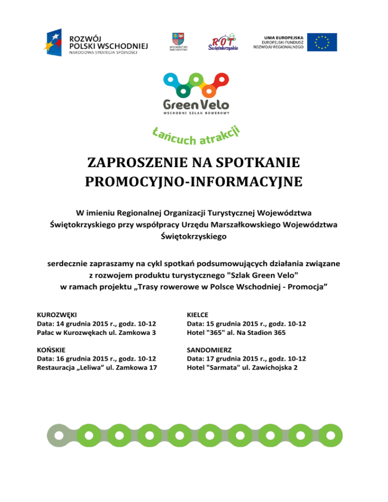 ZAPROSZENIE NA SPOTKANIE PROMOCYJNO-INFORMACYJNE W imieniu Regionalnej Organizacji Turystycznej Województwa Świętokrzyskiego przy współpracy Urzędu Marszałkowskiego Województwa Świętokrzyskiego serdecznie zapraszamy na cykl spotkań podsumowujących działania związane z rozwojem produktu turystycznego "Szlak Green Velo" w ramach projektu „Trasy rowerowe w Polsce Wschodniej - Promocja” KUROZWĘKI Data: 14 grudnia 2015 r., godz. 10-12 Pałac w Kurozwękach ul. Zamkowa 3 KIELCE Data: 15 grudnia 2015 r., godz. 10-12 Hotel "365" al. Na Stadion 365 KOŃSKIE Data: 16 grudnia 2015 r., godz. 10-12 Restauracja „Leliwa” ul. Zamkowa 17 SANDOMIERZ Data: 17 grudnia 2015 r., godz. 10-12 Hotel "Sarmata" ul. Zawichojska 2 PROGRAM SPOTKANIA godz. 10.00 Rozpoczęcie, powitanie uczestników godz. 10.00-10.30 Prezentacja działań związanych z rozwojem produktu turystycznego "Szlak Green Velo" 2014-15 system rekomendacji szlaków turystycznych MPR - Miejsca Przyjazne Rowerzystom promocja szlaku godz. 10.30-10.45 Prezentacja planów działań na lata 2016+ plany w zakresie budowy trwałego systemu zarządzania produktem turystycznym i jego rozwojem godz. 10.45-11.30 Dyskusja godz. 11.30-12.00 Wręczenie rekomendacji (certyfikatów) dla przedstawicieli MPR godz. 12.00 Zakończenie spotkania, poczęstunek Uczestnicy spotkania otrzymają materiały drukowane dotyczące zagadnień związanych z systemem rekomendacji szlaków powiązanych ze szlakiem "Green Velo" oraz systemem rekomendacji MPR - Miejsc Przyjaznych Rowerzystom, jak również założenia modelu dalszej współpracy na rzecz rozwoju produktu turystycznego. Prosimy o wybór miejsca spotkania zgodnie z dyspozycyjnością czasową oraz o potwierdzenie przybycia najpóźniej 2 dni przed spotkaniem na adres mailowy: [email protected] Osoba do kontaktu: Magdalena Szalla tel.665 34 00 06, Kamila Górecka tel. 665 34 00 05