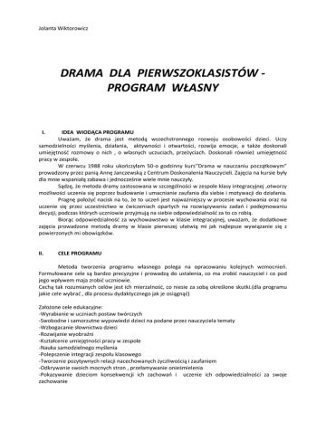 Jolanta Wiktorowicz DRAMA DLA PIERWSZOKLASISTÓW PROGRAM WŁASNY I. IDEA WIODĄCA PROGRAMU Uważam, że drama jest metodą wszechstronnego rozwoju osobowości dzieci. Uczy samodzielności myślenia, działania, aktywności i otwartości, rozwija emocje, a także doskonali umiejętność rozmowy o nich , o własnych uczuciach, przeżyciach. Doskonali również umiejętność pracy w zespole. W czerwcu 1988 roku ukończyłam 50-o godzinny kurs’’Drama w nauczaniu początkowym” prowadzony przez panią Annę Janczewską z Centrum Doskonalenia Nauczycieli. Zajęcia na kursie były dla mnie wspaniałą zabawa i jednocześnie wiele mnie nauczyły. Sądzę, że metoda dramy zastosowana w szczególności w zespole klasy integracyjnej ,otworzy możliwości uczenia się poprzez budowanie i umacnianie zaufania dla siebie i motywacji do działania. Pragnę położyć nacisk na to, że to uczeń jest najważniejszy w procesie wychowania oraz na uczenie się przez uczestnictwo w ćwiczeniach opartych na rozwiązywaniu zadań i podejmowaniu decyzji, podczas których uczniowie przyjmują na siebie odpowiedzialność za to co robią. Biorąc odpowiedzialność za wychowawstwo w klasie integracyjnej, uważam, że dodatkowe zajęcia prowadzone metodą dramy w klasie pierwszej ułatwią mi jak najlepsze wywiązanie się z powierzonych mi obowiązków. II. CELE PROGRAMU Metoda tworzenia programu własnego polega na opracowaniu kolejnych wzmocnień. Formułowane cele są bardzo precyzyjne i prowadzą do ustalenia, co ma zrobić nauczyciel i co pod jego wpływem maja zrobić uczniowie. Cechą tak rozumianych celów jest ich mierzalność, co niesie za sobą określone skutki.(dla programu jakie cele wybrać , dla procesu dydaktycznego jak je osiągnąć) Założone cele edukacyjne: -Wyrabianie w uczniach postaw twórczych -Swobodne i samorzutne wypowiedzi dzieci na podane przez nauczyciela tematy -Wzbogacanie słownictwa dzieci -Rozwijanie wyobraźni -Kształcenie umiejętności pracy w zespole -Nauka samodzielnego myślenia -Polepszenie integracji zespołu klasowego -Tworzenie pozytywnych relacji nacechowanych życzliwością i zaufaniem -Odkrywanie swoich mocnych stron , przełamywanie onieśmielenia -Pokazywanie dzieciom konsekwencji ich zachowań i uczenie ich odpowiedzialności za swoje zachowanie -Rozpoznawanie uczuć i ćwiczenie umiejętności ich wyrażania w sposób społecznie akceptowany -Uświadomienie mechanizmu konfliktu, uczenie alternatywnych sposobów jego rozwiązywania -Kształtowanie rozumienia mowy niewerbalnej III. PRZEWIDYWANE EFEKTY PODJĘTYCH ZADAŃ EDUKACYJNYCH - integracja klasy - umiejętność pracy w zespole - rozwiązywanie problemów w sposób twórczy - współodpowiedzialność za pracę całego zespołu - motywacja do osiągnięcia przez ucznia osobistego -zainteresowania treściami nauczania, emocjonalnego - zaangażowania oraz uczenie się w oparciu o własne doświadczenie IV. TREŚCI PROGRAMU Treści programu „Drama dla pierwszoklasistów’’ koncentrują się wokół :- umiejętności wyrażania swoich przeżyć , emocji i nastrojów za pomocą słów , ruchu, mimiki twarzy i gestów uważnego słuchania treści przekazywanych przez nauczyciela i ich uczniów -przygotowanie do umiejętności pracy w zespole-rozmowy na temat ilustracji, zdarzeń tekstów-swobodne i samorzutne wypowiedzi dzieci na podane przez nauczyciela lub uczniów temat-czytanie fragmentów lekturpogłębianie znajomości ortografii-stosowanie w mowie zdań złożonych-opieka i tryb życia ssaków domowych-organizacja życia w rodzinie-ilustrowanie zjawisk wydarzeń realnych z uwzględnieniem postaci ludzi , zwierząt i roślin-projektowanie i wykonywanie płaskich form użytkowych V. WARUNKI REALIZACJI PROGRAMU Program „ Drama dla pierwszoklasistów” jak sama nazwa wskazuje skierowany jest do uczniów klas pierwszych. Ilość osób uczestniczących w zajęciach nie powinna przekroczyć 15 uczniów, ze względu na specyfikę zajęć dramowych. W związku z tym program nie jest skierowany do całej klasy, lecz dla dzieci chętnych i zainteresowanych taką formą spędzenia wolnego czasu. Przewiduję prowadzenie tą metodą jednej godziny lekcyjnej w tygodniu. Dramę w gruncie rzeczy można przeprowadzać w najbardziej nawet skromnych warunkach w każdej szkole. Przede wszystkim to , co jest potrzebne to „ miejsce , w którym się wszystko może zdarzyć ‘’. Wychodząc z takiego założenia zamierzam zajęcia dramy przeprowadzać w sali lekcyjnej , na boisku szkolnym , na sali gimnastycznej – w zależności od potrzeb i możliwości. VI. METODY, ŚRODKI I FORMY PRACY W REALIZACJI PROGRAMU „DRAMA DLA PIERWSZOKLASISTÓW” Typ i jakość obustronnego oddziaływania między uczniem a nowymi informacjami w dużym stopniu zależy od zastosowanych przez nauczyciela metod i form pracy. Metoda dramy pozwala nauczycielom ustrzec się spełniania funkcji kierowniczej i pojawić się wśród uczniów w roli partnera. Tak zbudowana płaszczyzna oddziaływań edukacyjnych pozwala na to , iż : -dochodzi do wymiany informacji między nauczycielem i uczniem -rozwiązuje się problemy, przezwycięża trudne sytuacje - uzdrawia się wzajemne stosunki panujące w grupie -daje się okazję do przećwiczenia kilku sposobów zachowań ocenienia ich i znalezienia najbardziej odpowiedniego rozwiązania W zajęciach dramowych najczęściej stosuje się formę pracy grupowej. Uczniowie mają jasno sprecyzowany cel pracy nauczyciel dostarcza im dostateczna ilość informacji potrzebnych do rozwiązania problemu uczeń ma dogodny dostęp do materiałów potrzebnych do wykonania zadania oraz zapewniona ilość czasu na wykonanie pracy. Współpracując w małych grupach uczniowie maja więcej pomysłów , mogą uczyć się jeden od drugiego oraz przekonać się ,iż w procesie uczenia się ich własne doświadczenia i myśli mają wymierną wartość. Rozwijają w ten sposób wiarę we własne siły i możliw