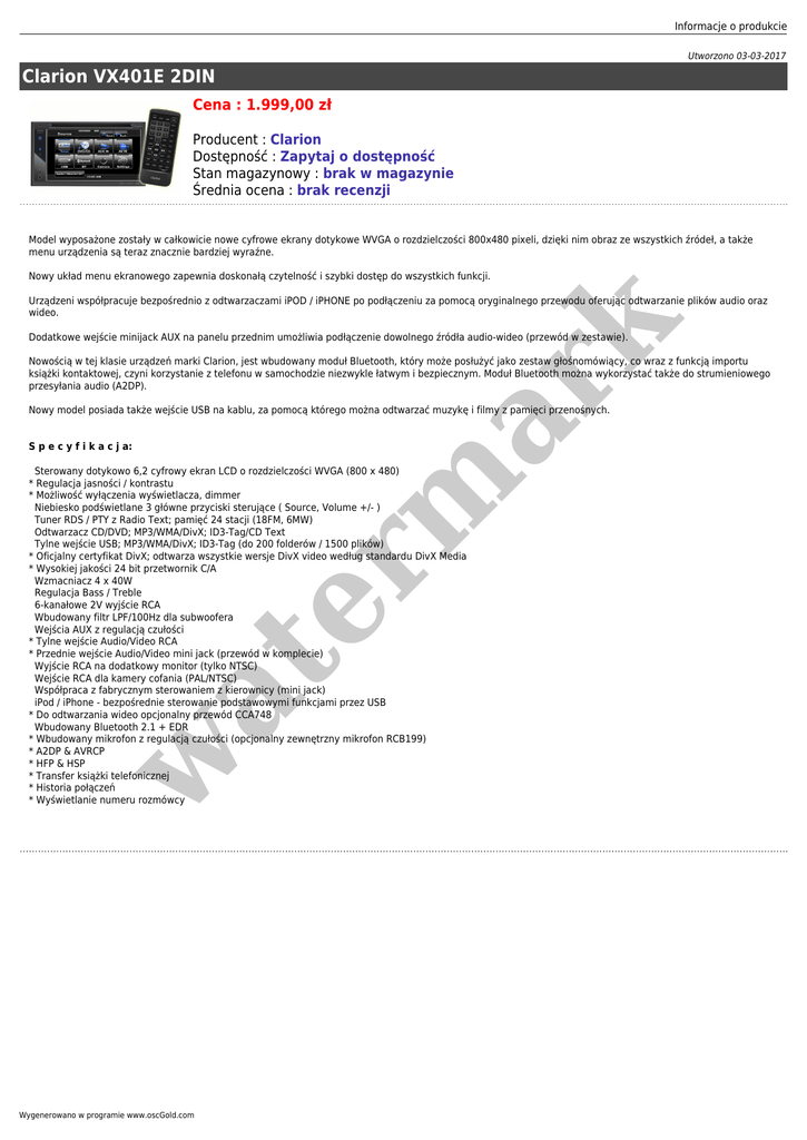 Informacje o produkcie Utworzono 03-03-2017 Clarion VX401E 2DIN Cena : 1.999,00 zł Producent : Clarion Dostępność : Zapytaj o dostępność Stan magazynowy : brak w magazynie Średnia ocena : brak recenzji Model wyposażone zostały w całkowicie nowe cyfrowe ekrany dotykowe WVGA o rozdzielczości 800x480 pixeli, dzięki nim obraz ze wszystkich źródeł, a także menu urządzenia są teraz znacznie bardziej wyraźne. Nowy układ menu ekranowego zapewnia doskonałą czytelność i szybki dostęp do wszystkich funkcji. er m ar k Urządzeni współpracuje bezpośrednio z odtwarzaczami iPOD / iPHONE po podłączeniu za pomocą oryginalnego przewodu oferując odtwarzanie plików audio oraz wideo. Dodatkowe wejście minijack AUX na panelu przednim umożliwia podłączenie dowolnego źródła audio-wideo (przewód w zestawie). Nowością w tej klasie urządzeń marki Clarion, jest wbudowany moduł Bluetooth, który może posłużyć jako zestaw głośnomówiący, co wraz z funkcją importu książki kontaktowej, czyni korzystanie z telefonu w samochodzie niezwykle łatwym i bezpiecznym. Moduł Bluetooth można wykorzystać także do strumieniowego przesyłania audio (A2DP). Nowy model posiada także wejście USB na kablu, za pomocą którego można odtwarzać muzykę i filmy z pamięci przenośnych. S p e c y f i k a c j a: w at Sterowany dotykowo 6,2 cyfrowy ekran LCD o rozdzielczości WVGA (800 x 480) * Regulacja jasności / kontrastu * Możliwość wyłączenia wyświetlacza, dimmer Niebiesko podświetlane 3 główne przyciski sterujące ( Source, Volume +/- ) Tuner RDS / PTY z Radio Text; pamięć 24 stacji (18FM, 6MW) Odtwarzacz CD/DVD; MP3/WMA/DivX; ID3-Tag/CD Text Tylne wejście USB; MP3/WMA/DivX; ID3-Tag (do 200 folderów / 1500 plików) * Oficjalny certyfikat DivX; odtwarza wszystkie wersje DivX video według standardu DivX Media * Wysokiej jakości 24 bit przetwornik C/A Wzmacniacz 4 x 40W Regulacja Bass / Treble 6-kanałowe 2V wyjście RCA Wbudowany filtr LPF/100Hz dla subwoofera Wejścia AUX z regulacją czułości * Tylne wejście Audio/Video RCA * Przednie wejście Audio/Video mini jack (przewód w komplecie) Wyjście RCA na dodatkowy monitor (tylko NTSC) Wejście RCA dla kamery cofania (PAL/NTSC) Współpraca z fabrycznym sterowaniem z kierownicy (mini jack) iPod / iPhone - bezpośrednie sterowanie podstawowymi funkcjami przez USB * Do odtwarzania wideo opcjonalny przewód CCA748 Wbudowany Bluetooth 2.1 + EDR * Wbudowany mikrofon z regulacją czułości (opcjonalny zewnętrzny mikrofon RCB199) * A2DP & AVRCP * HFP & HSP * Transfer książki telefonicznej * Historia połączeń * Wyświetlanie numeru rozmówcy Wygenerowano w programie www.oscGold.com