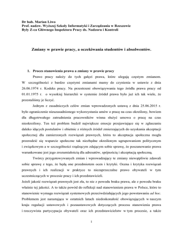 Dr hab. Marian Liwo Prof. nadzw. Wyższej Szkoły Informatyki i Zarządzania w Rzeszowie Były Z-ca Głównego Inspektora Pracy ds. Nadzoru i Kontroli Zmiany w prawie pracy, a oczekiwania studentów i absolwentów. 1. Proces stanowienia prawa a zmiany w prawie pracy Prawo pracy należy do tych gałęzi prawa, które ulegają częstym zmianom. W szczególności z bardzo częstymi zmianami mamy do czynienia w ustawie z dnia 26.06.1974 r. Kodeks pracy. Na przestrzeni obowiązywania tego źródła prawa pracy od 01.01.1975 r. o wysokiej hierarchii w systemie źródeł prawa było już ich tak wiele, że przestaliśmy je liczyć. Jednym z zasadniczych celów zmian wprowadzonych ustawą z dnia 25.06.2015 r. było ograniczenie nieuzasadnionego wykorzystania umów o pracę na czas określony, bowiem dla długotrwałego zatrudnienia pracowników winna służyć umowa o pracę na czas nieokreślony. Ten też problem budził największe emocje przejawiające się w zgłaszaniu daleko idących postulatów i obietnic z różnych źródeł zmierzających do uzyskania akceptacji społecznej dla zamierzonych rozwiązań prawnych, która to akceptacja społeczna mogła przerodzić się wsparcie społeczne tak niezbędne określonym ugrupowaniom politycznym i związkowym a w szczególności rządzącym zdającym sobie sprawę, że poszanowanie prawa warunkowane jest jego zrozumiałością dla adresatów, spójnością i akceptacją społeczną. Twórcy przygotowywanych zmian i wprowadzający te zmiany niewątpliwie zdawali sobie sprawę z tego, że będą one przedmiotem ocen i krytyki. Ocena i krytyka rozwiązań prawnych i ich realizacji w praktyce to niezaprzeczalne prawo obywateli w tym uczestniczących w procesie pracy i ich przedstawicieli. Jeżeli jakość rozwiązań prawnych jest zła, to nie z powodu braku prawa, ale z powodu braku właśnie tej jakości. A to także powód do refleksji nad stanowieniem prawa w Polsce, które to stanowienie wymaga rozwiązań systemowych przeciwdziałających jego powstawaniu ad hoc. Problemem jest narastająca w ostatnich latach niedoskonałość obowiązujących w naszym kraju regulacji ustawowych i pozaustawowych dotyczących procesu stanowienia prawa i rzeczywista partycypacja obywateli oraz ich przedstawicielstw w tym procesie, a także 1 wadliwa i niepełna ocena skutków regulacji prawnych. Nie pozostaje to bez wpływu na treść tych regulacji w różnych kryteriach ocen i częste zmiany przepisów. Zauważają to również studenci i absolwenci także wobec prawa pracy. Powołanie Rady Dialogu Społecznego zastępującą Komisję Trójstronną z innym spojrzeniem na cel jej funkcjonowania i sposób realizacji zadań wydaje się być dobrym prognostykiem na przyszłość w zakresie ustawodawstwa pracy związanego ze świadczeniem pracy. Obserwując konsultacje społeczne związane ze zamianami w prawie pracy należy przyjąć, że były one w ostatnim okresie procesem dającym złudne przekonanie o wypełnianiu przez pracodawcę obowiązków w tym przedmiocie, nie stanowiąc partycypacji zgodnej z zasadą demokratycznego państwa prawnego i społeczeństwa obywatelskiego. Prawo pracy, jak każde inne prawo obowiązujące w państwie jest jednak dobrem wspólnym, dlatego też refleksje nad praktyką legislacyjną i racjonalnością rozwiązań prawnych uważam za w pełni uzasadnioną. W prawie tym ze względu na adresatów o różnym poziomie wykształcenia niezbędne są bowiem regulacje prawne pisane poprawnym zrozumiałym językiem, w miarę wolne od wątpliwości interpretacyjnych, spójne satysfakcjonujące wszystkie strony stosunku pracy z uwzględnieniem możliwości państwa i poszanowaniem gospodarki rynkowej. 2. Studenci i absolwenci jako specyficzna grupa zawodowa w świadczeniu pracy w oparciu o różne podstawy Nie ulega wątpliwości, że wiedza, którą uzyskują studenci podczas studiów, aw szczególności na kierunkach prawniczych czy administracyjnych powoduje ich szczególną świadomość prawną przejawiająca się nie tylko w znajomości regulacji prawnych będących przedmiotem studiów, ale i umiejętności oceny tych regulacji pod kątem jakości i potrzeb zmian. Na tą umiejętność zwracana jest systematyczna uwaga w ramach kształcenia praktycznego, któremu nadawane jest i słusznie coraz większe znaczenie. Uchwalona przez Sejm dnia 26.06.2015 r. kolejna zmiana Kodeksu pracy była przedmiotem dającego się zauważyć zainteresowania studentów świadczących pracę w oparciu o różne podstawy oraz absolwentów WSIiZ w Rzeszowie, którzy po ukończeniu studiów licencjackich podjęli bądź nie podjęli na tej uczelni studia magisterskie, a których dalsze losy śledzi Biuro Karier Uczelni udzielając im różnej pomocy, w tym i w podjęciu zatrudnienia czy rozwiązywaniu problemów, które się z tym zatrudnieniem wiążą. Jakkolwiek wprowadzone zmiany oceniane były na ogół pozytywnie w szczególności odnośnie ograniczenia umów terminowych jako dobry krok do poprawy stabilności zatrudnienia, to 2 jednak podnoszono również złożoność niektórych sformułowań dotyczących uprawnień pracowników związanych z rodzicielstwem pełnych odniesień do różnych przepisów kodeksu. W wypowiedziach dotyczących umów terminowych powszechnie zauważano, że jakkolwiek wprowadzone zmiany w określonym stopniu ograniczają czasowe zatrudnienie, to jednak nie ograniczają go w stopniu oczekiwanym odpowiadającym zapewnieniom polityków „w przedmiocie likwidacji umów śmieciowych”. Wskazywano przy tym, że w obowiązującym stanie prawnym nic nie będzie stało na przeszkodzie w zrezygnowaniu zatrudnienia po upływie 33 miesięcy trwania umów i zastąpieniu dotychczasowego pracownika innym? Zapobiegnięcie tym praktykom rzutującym w istocie na trwałość stosunku pracy zdaniem wypowiadających się wymagałoby wprowadzenia przez ustawodawcę rozwiązań prawnych o charakterze określonych zachęt preferujących z