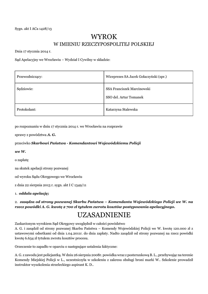 Sygn. akt I ACa 1428/13 WYROK W IMIENIU RZECZYPOSPOLITEJ POLSKIEJ Dnia 17 stycznia 2014 r. Sąd Apelacyjny we Wrocławiu – Wydział I Cywilny w składzie: Przewodniczący: Wiceprezes SA Jacek Gołaczyński (spr.) Sędziowie: SSA Franciszek Marcinowski SSO del. Artur Tomanek Protokolant: Katarzyna Stalewska po rozpoznaniu w dniu 17 stycznia 2014 r. we Wrocławiu na rozprawie sprawy z powództwa A. G. przeciwko Skarbowi Państwa - Komendantowi Wojewódzkiemu Policji we W. o zapłatę na skutek apelacji strony pozwanej od wyroku Sądu Okręgowego we Wrocławiu z dnia 22 sierpnia 2013 r. sygn. akt I C 1349/11 1. oddala apelację; 2. zasądza od strony pozwanej Skarbu Państwa – Komendanta Wojewódzkiego Policji we W. na rzecz powódki A. G. kwotę 2 700 zł tytułem zwrotu kosztów postępowania apelacyjnego. UZASADNIENIE Zaskarżonym wyrokiem Sąd Okręgowy uwzględnił w całości powództwo A. G. i zasądził od strony pozwanej Skarbu Państwa – Komendy Wojewódzkiej Policji we W. kwotę 120.000 zł z ustawowymi odsetkami od dnia 1.04.2011r. do dnia zapłaty. Nadto zasądził od strony pozwanej na rzecz powódki kwotę 6.634 zł tytułem zwrotu kosztów procesu. Orzeczenie to zapadło w oparciu o następujące ustalenia faktyczne: A. G. z zawodu jest policjantką. W dniu 26 sierpnia 2008r. powódka wraz z posterunkową B. L., przebywając na terenie Komendy Miejskiej Policji w L., uczestniczyła w szkoleniu z zakresu obsługi broni marki W.. Szkolenie prowadził instruktor wyszkolenia strzeleckiego aspirant K. D.. Szkolenie odbywało się w pokoju instruktora. Tego dnia K. D. pełnił również dyżur w grupie operacyjno – procesowej. Instruktor omówił budowę, zasady działania i zabezpieczenia broni W.. Broń wykorzystywana w czasie szkolenia nie była uzbrojona. Funkcjonariuszki rozłożyły i złożyły broń, a następnie wywiązała się dyskusja na temat broni typu G.. Instruktor omówił różnice w budowie i działaniu pistoletu marki W. i G.. W tym celu wyjął z kabury własną broń służbową − pistolet G.. Wyjął z niego magazynek, rozładował i oddał strzał na sucho. Następnie włożył do niego magazynek i w tym samym czasie zadzwonił do niego dyżurny. Instruktor odebrał telefon, porozmawiał chwilę i po skończonej rozmowie przeładował G. z włożonym do niego magazynkiem. Pistolet trzymał luźno w prawej dłoni, myśląc, że nie jest do niego załadowany magazynek. Kierując rękę na prawo od powódki chciał oddać strzał „na sucho”. W momencie naciśnięcia na spust, jego ręka odskoczyła w lewo i strzał, który ugodził powódkę w lewe udo i prawą dłoń. Pocisk przeszedł przez palec i wszedł w udo. K. D. z rozkazu personalnego KWP we W. pełni służbę w KMP w L. jako referent oraz wykonuje on również obowiązki instruktora wyszkolenia strzeleckiego. W przypadku wymiany broni palnej na inny model w jednostkach Policji stosowana jest praktyka polegająca na prowadzeniu takich szkoleń przez policjanta – instruktora wyszkolenia strzeleckiego. Brak jest przepisów wewnętrznych regulujących zasady i sposób przeprowadzenia takiego szkolenia. Szkolenie poprzedzające przydzielenie nowej broni palnej polega na omówieniu mechanizmów zabezpieczających, rozłożeniu danej jednostki broni, a następnie jej złożeniu, oddaniu tzw. „strzału na sucho” w bezpiecznym kierunku. W każdym przypadku odbywa się ono z wypiętym magazynkiem. Szkolenie trwa około pół godziny. Po jego przeprowadzeniu, instruktor wystawia funkcjonariuszowi zaświadczenie, na podstawie którego wydawana jest broń z magazynu broni Komendy Wojewódzkiej Policji we W.. W Komendzie Miejskiej Policji w L. nie ma oddzielnego pomieszczenia przeznaczonego do prowadzenia szkoleń w zakresie obsługi broni. Instruktor wyszkolenia strzeleckiego prowadzi szkolenia w swoim pokoju, w którym wykonuje również inne czynności służbowe będące w zakresie jego obowiązków. Po wypadku powódka została przewieziona do szpitala, gdzie rozpoznano ranę postrzałowa uda lewego, złamanie trzonu kości udowej lewej, złamanie paliczka środkowego palca II ręki prawej i poddano ją operacji zespolenia kości udowej gwoździem śródszpikowyrn ryglowanym. W dniu 5 września 2008r. powódka została wypisana do domu z zaleceniem chodzenia o kulach bez obciążania operowanej kończyny, stosowania szyny Z.na palec II ręki prawej przez okres 3 tygodni. W związku z wypadkiem powódka przeszła kolejne zabiegi operacyjne: w dniu 10 listopada 2008r. w celu restabilizacji złamania i korekcji osi kości udowej, w dniu 12 marca 2010r. usunięcia zespolenia w kości udowej oraz w dniu 19 kwietnia 2011r. usunięcia trzech ciał obcych metalicznych Nadto w związku z wypadkiem powódka podawana została zabiegom rehabilitacyjnym: w okresie od 11 września do 3 października 2008r. na Oddziale Rehabilitacyjnym w Zespole (...) w Z., w okresie od 11 lutego do 25 marca 2009r. w (...) Centrum (...) w K., od 3 do 23 kwietnia 2009r. w (...) w L., gdzie prowadziła dalszą rehabilitację. Po wypadku powódka była u psychiatry i korzystała z pomocy psychologa. Rozpoznawano u niej reakcję depresyjną i przewlekły zespół stresu pourazowego znacznie upośledzający funkcjonowanie emocjonalno – społeczne. W chwili zdarzenia powódka miała 24 lata. W Policji pracowała jako dzielnicowa. Była osobą aktywną, towarzyską i sprawną. Uprawiała sport. W szczególności lubiła grać w siatkówkę, pływać. Jeździła na wycieczki rowerowe i wyjeżdżała w góry. Po zdarzeniu przez pewien czas powódka nie wstawała z łóżka i nie mogła chodzić. Zarówno w czasie pierwszego pobytu w szpitalu, jak i po wypisaniu do domu, opiekowała się nią matka i siostra. Pomagały jej one przy wszystkich czynnościach, w tym także robiły jej toaletę. Dopiero po pierwszej rehabilitacji powódka zaczęła poruszać się przy pomocy kul. Także wówczas trzeba było jej pomagać, chociażb