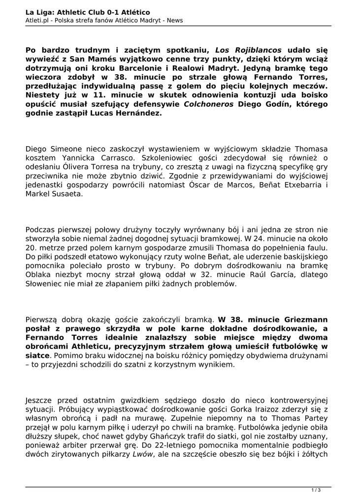 La Liga: Athletic Club 0-1 Atlético Atleti.pl - Polska strefa fanów Atlético Madryt - News Po bardzo trudnym i zaciętym spotkaniu, Los Rojiblancos udało się wywieźć z San Mamés wyjątkowo cenne trzy punkty, dzięki którym wciąż dotrzymują oni kroku Barcelonie i Realowi Madryt. Jedyną bramkę tego wieczora zdobył w 38. minucie po strzale głową Fernando Torres, przedłużając indywidualną passę z golem do pięciu kolejnych meczów. Niestety już w 11. minucie w skutek odnowienia kontuzji uda boisko opuścić musiał szefujący defensywie Colchoneros Diego Godín, którego godnie zastąpił Lucas Hernández. Diego Simeone nieco zaskoczył wystawieniem w wyjściowym składzie Thomasa kosztem Yannicka Carrasco. Szkoleniowiec gości zdecydował się również o odesłaniu Ólivera Torresa na trybuny, co zresztą z uwagi na fizyczną specyfikę gry przeciwnika nie może zbytnio dziwić. Zgodnie z przewidywaniami do wyjściowej jedenastki gospodarzy powrócili natomiast Óscar de Marcos, Beñat Etxebarria i Markel Susaeta. Podczas pierwszej połowy drużyny toczyły wyrównany bój i ani jedna ze stron nie stworzyła sobie niemal żadnej dogodnej sytuacji bramkowej. W 24. minucie na około 20. metrze przed polem karnym gospodarze zmusili Thomasa do popełnienia faulu. Do piłki podszedł etatowo wykonujący rzuty wolne Beñat, ale uderzenie baskijskiego pomocnika poleciało prosto w trybuny. Po dobrym dośrodkowaniu na bramkę Oblaka niezbyt mocny strzał głową oddał w 32. minucie Raúl García, dlatego Słoweniec nie miał ze złapaniem piłki żadnych problemów. Pierwszą dobrą okazję goście zakończyli bramką. W 38. minucie Griezmann posłał z prawego skrzydła w pole karne dokładne dośrodkowanie, a Fernando Torres idealnie znalazłszy sobie miejsce między dwoma obrońcami Athleticu, precyzyjnym strzałem głową umieścił futbolówkę w siatce. Pomimo braku widocznej na boisku różnicy pomiędzy obydwiema drużynami – to przyjezdni schodzili do szatni z korzystnym wynikiem. Jeszcze przed ostatnim gwizdkiem sędziego doszło do nieco kontrowersyjnej sytuacji. Próbujący wypiąstkować dośrodkowanie gości Gorka Iraizoz zderzył się z własnym obrońcą i padł na murawę. Zupełnie niepomny na to Thomas Partey przejął w polu karnym piłkę i uderzył po chwili na bramkę. Futbolówka jedynie obiła dłuższy słupek, choć nawet gdyby Ghańczyk trafił do siatki, gol nie zostałby uznany, ponieważ arbiter przerwał grę. Do 22-letniego pomocnika momentalnie podbiegło dwóch zirytowanych piłkarzy Lwów, ale na szczęście obeszło się bez bójki i żółtych 1/3 La Liga: Athletic Club 0-1 Atlético Atleti.pl - Polska strefa fanów Atlético Madryt - News kartek. Już po zamianie stron boiskowe nastawienie obu ekip uległo drastycznej zmianie. Gospodarze zupełnie zdominowali posiadanie piłki, kilkakrotnie zmuszając golkipera madrytczyków do interweniowania. Los Colchoneros cofnęli się niemal pod własną bramkę i długimi okresami nie opuszczali nawet własnej połowy. Świetnej okazji nie wykorzystał w 53. minucie Beñat. 29-latek z dwudziestu paru metrów posłał na bramkę Oblaka mocny podkręcony strzał, ale słoweński bramkarz z problemami poradził sobie z uderzeniem. W 85. minucie szansa do podwojenia wyniku trafiła się Yannickowi Carrasco. Defensywa gospodarzy nie zajęła się odpowiednio dośrodkowaniem Filipe Luísa, a wspomniany Belg po skontrolowaniu piłki posłał z około 12 metrów strzał na długi słupek. Iraizoz popisał się jednak dobrym refleksem i wybronił uderzenie byłego zawodnika Monaco. Parę minut później pod polem karnym do dośrodkowanej piłki doskoczył przed polem karnym Raúl García, który golkipera przyjezdnych spróbował pokonać z sposób podobny, jak miało to miejsce w meczu z Valencią dwa sezony temu, ale uderzenie Hiszpana było zbyt słabe, by realnie zagrozić prowadzeniu gości. Już w doliczonym czasie bramkę samobójczą niemal zdobył próbujący nieco za mocno odegrać do bramkarza piłkę Stefan Savić, ale Oblak nie dał się zaskoczyć i pewnie ją złapał. Kilka chwil później Carrasco zmarnował kolejną okazję, uderzenie z kilku metrów po przejęciu piłki od Fernando Torresa niewytłumaczalnie posyłając nad poprzeczką. Rezultat meczu oznacza, że sytuacja na szczycie tabeli jest identyczna, jak przed rozpoczęciem kolejki. Swoje spotkania zwyciężyły także drużyny Barcelony (8-0 z Deportivo) i Realu Madryt (3-0 z Villarrealem), dlatego absolutnie kluczowym okazało się wywiezienie z San Mamés kompletu „oczek”. Maraton hiszpańskiej ekstraklasy ani na chwilę się jednak nie zatrzymuje, a następna seria gier zostanie rozegrana już w najbliższy weekend. Lwy z Bilbao w niedzielne południe podejmą na wyjeździe walczące o utrzymanie Levante, natomiast Los Colchoneros na własnym stadionie zagrają sobotnim wieczorem z Málagą. Bramki: 2/3 La Liga: Athletic Club 0-1 Atlético Atleti.pl - Polska strefa fanów Atlético Madryt - News [0-1] Fernando Torres (asysta: Antoine Griezmann) 38' Skład Athleticu: Gorka Iraizoz - Óscar de Marcos, Eneko Bóveda, Xabier Etxeita (Ander Iturraspe 66'), Mikel Balenziaga – Mikel San José, Beñat Etxebarria – Markel Susaeta (Iñigo Lekue 73'), Raúl García, Iker Muniain (Iñaki Williams 59') – Borja Viguera Niewykorzystani zmiennicy: Iago Herrerín, Carlos Gurpegi, Gorka Elustondo, Mikel Rico Skład Atlético: Jan Oblak – Juanfran, Stefan Savić, Diego Godín (Lucas Hernández 11'), Filipe Luís – Koke, Thomas Partey (Yannick Carrasco 62'), Augusto Fernández, Saúl Ñíguez – Antoine Griezmann, Fernando Torres Niewykorzystani zmiennicy: Miguel Kranevitter, Ángel Correa, Luciano Vietto Ángel Moyá, Jesús Gámez, Matías Żółte kartki: – Frekwencja: 44 474 widzów Arbiter: Juan Martínez Munuera (Walencja) Oficjalny skrót meczu i inne materiały wideo dostępne są pod tym linkiem. Autor: exempt 3/3 P