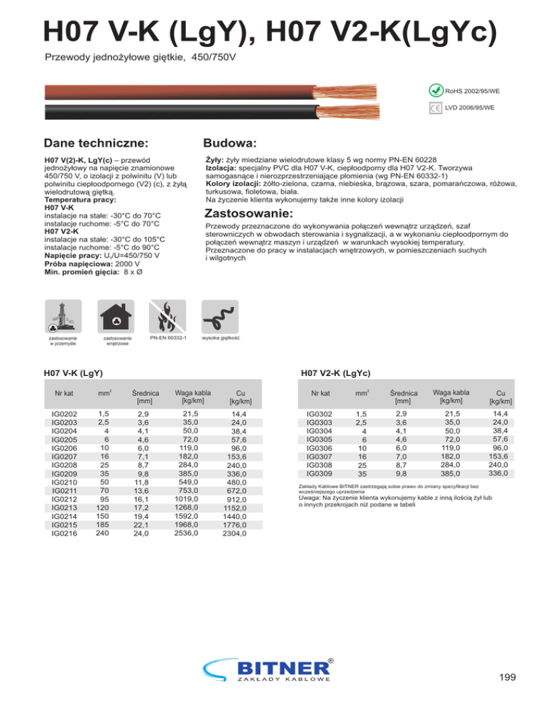 H07 V-K (LgY), H07 V2-K(LgYc) Przewody jednożyłowe giętkie, 450/750V RoHS RoHS 2002/95/WE LVD 2006/95/WE Budowa: Dane techniczne: H07 V(2)-K, LgY(c) – przewód jednożyłowy na napięcie znamionowe 450/750 V, o izolacji z polwinitu (V) lub polwinitu ciepłoodpornego (V2) (c), z żyłą wielodrutową giętką. Temperatura pracy: H07 V-K instalacje na stałe: -30°C do 70°C instalacje ruchome: -5°C do 70°C H07 V2-K instalacje na stałe: -30°C do 105°C instalacje ruchome: -5°C do 90°C Napięcie pracy: U0/U=450/750 V Próba napięciowa: 2000 V Min. promień gięcia: 8 x Ø zastosowanie w przemyśle PN-EN 60332-1 zastosowanie wnętrzowe Żyły: żyły miedziane wielodrutowe klasy 5 wg normy PN-EN 60228 Izolacja: specjalny PVC dla H07 V-K, ciepłoodporny dla H07 V2-K. Tworzywa samogasnące i nierozprzestrzeniające płomienia (wg PN-EN 60332-1) Kolory izolacji: żółto-zielona, czarna, niebieska, brązowa, szara, pomarańczowa, różowa, turkusowa, fioletowa, biała. Na życzenie klienta wykonujemy także inne kolory izolacji Zastosowanie: Przewody przeznaczone do wykonywania połączeń wewnątrz urządzeń, szaf sterowniczych w obwodach sterowania i sygnalizacji, a w wykonaniu ciepłoodpornym do połączeń wewnątrz maszyn i urządzeń w warunkach wysokiej temperatury. Przeznaczone do pracy w instalacjach wnętrzowych, w pomieszczeniach suchych i wilgotnych wysoka giętkość H07 V-K (LgY) Nr kat IG0202 IG0203 IG0204 IG0205 IG0206 IG0207 IG0208 IG0209 IG0210 IG0211 IG0212 IG0213 IG0214 IG0215 IG0216 H07 V2-K (LgYc) mm2 Średnica [mm] Waga kabla [kg/km] 1,5 2,5 4 6 10 16 25 35 50 70 95 120 150 185 240 2,9 3,6 4,1 4,6 6,0 7,1 8,7 9,8 11,8 13,6 16,1 17,2 19,4 22,1 24,0 21,5 35,0 50,0 72,0 119,0 182,0 284,0 385,0 549,0 753,0 1019,0 1268,0 1592,0 1968,0 2536,0 Cu [kg/km] 14,4 24,0 38,4 57,6 96,0 153,6 240,0 336,0 480,0 672,0 912,0 1152,0 1440,0 1776,0 2304,0 Nr kat mm2 IG0302 IG0303 IG0304 IG0305 IG0306 IG0307 IG0308 IG0309 1,5 2,5 4 6 10 16 25 35 Średnica [mm] 2,9 3,6 4,1 4,6 6,0 7,0 8,7 9,8 Waga kabla [kg/km] 21,5 35,0 50,0 72,0 119,0 182,0 284,0 385,0 Cu [kg/km] 14,4 24,0 38,4 57,6 96,0 153,6 240,0 336,0 Zakłady Kablowe BITNER zastrzegają sobie prawo do zmiany specyfikacji bez wcześniejszego uprzedzenia Uwaga: Na życzenie klienta wykonujemy kable z inną ilością żył lub o innych przekrojach niż podane w tabeli ® 199