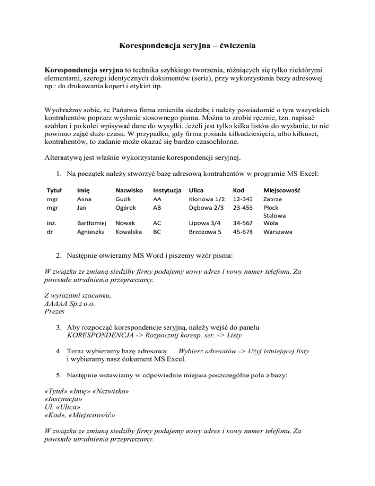 Korespondencja seryjna – ćwiczenia Korespondencja seryjna to technika szybkiego tworzenia, różniących się tylko niektórymi elementami, szeregu identycznych dokumentów (seria), przy wykorzystania bazy adresowej np.: do drukowania kopert i etykiet itp. Wyobraźmy sobie, że Państwa firma zmieniła siedzibę i należy powiadomić o tym wszystkich kontrahentów poprzez wysłanie stosownego pisma. Można to zrobić ręcznie, tzn. napisać szablon i po kolei wpisywać dane do wysyłki. Jeżeli jest tylko kilka listów do wysłanie, to nie powinno zająć dużo czasu. W przypadku, gdy firma posiada kilkudziesięciu, albo kilkuset, kontrahentów, to zadanie może okazać się bardzo czasochłonne. Alternatywą jest właśnie wykorzystanie korespondencji seryjnej. 1. Na początek należy stworzyć bazę adresową kontrahentów w programie MS Excel: Tytuł mgr mgr Imię Anna Jan Nazwisko Guzik Ogórek Instytucja AA AB Ulica Klonowa 1/2 Dębowa 2/3 Kod 12-345 23-456 inź. dr Bartłomiej Agnieszka Nowak Kowalska AC BC Lipowa 3/4 Brzozowa 5 34-567 45-678 Miejscowość Zabrze Płock Stalowa Wola Warszawa 2. Następnie otwieramy MS Word i piszemy wzór pisma: W związku ze zmianą siedziby firmy podajemy nowy adres i nowy numer telefonu. Za powstałe utrudnienia przepraszamy. Z wyrazami szacunku, AAAAA Sp.z o.o. Prezes 3. Aby rozpocząć korespondencje seryjną, należy wejść do panelu KORESPONDENCJA -> Rozpocznij koresp. ser. -> Listy 4. Teraz wybieramy bazę adresową: Wybierz adresatów -> Użyj istniejącej listy i wybieramy nasz dokument MS Excel. 5. Następnie wstawiamy w odpowiednie miejsca poszczególne pola z bazy: «Tytuł» «Imię» «Nazwisko» «Instytucja» Ul. «Ulica» «Kod», «Miejscowość» W związku ze zmianą siedziby firmy podajemy nowy adres i nowy numer telefonu. Za powstałe utrudnienia przepraszamy. Z wyrazami szacunku, AAAAA Sp.z o.o. Prezes 6. Zanim zakończymy i wygenerujemy całą serie (Zakończ i scal), możemy podglądnąć wyniki (Podgląd wyników).