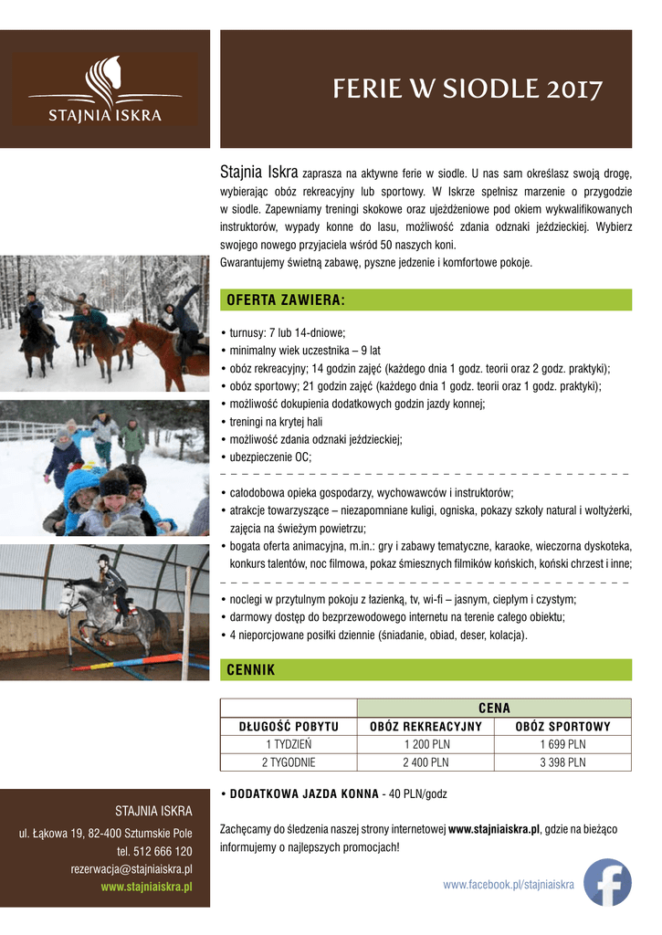 FERIE W SIODLE 2017 Stajnia Iskra zaprasza na aktywne ferie w siodle. U nas sam określasz swoją drogę, wybierając obóz rekreacyjny lub sportowy. W Iskrze spełnisz marzenie o przygodzie w siodle. Zapewniamy treningi skokowe oraz ujeżdżeniowe pod okiem wykwalifikowanych instruktorów, wypady konne do lasu, możliwość zdania odznaki jeździeckiej. Wybierz swojego nowego przyjaciela wśród 50 naszych koni. Gwarantujemy świetną zabawę, pyszne jedzenie i komfortowe pokoje. OFERTA ZAWIERA: • turnusy: 7 lub 14-dniowe; • minimalny wiek uczestnika – 9 lat • obóz rekreacyjny; 14 godzin zajęć (każdego dnia 1 godz. teorii oraz 2 godz. praktyki); • obóz sportowy; 21 godzin zajęć (każdego dnia 1 godz. teorii oraz 1 godz. praktyki); • możliwość dokupienia dodatkowych godzin jazdy konnej; • treningi na krytej hali • możliwość zdania odznaki jeździeckiej; • ubezpieczenie OC; • całodobowa opieka gospodarzy, wychowawców i instruktorów; • atrakcje towarzyszące – niezapomniane kuligi, ogniska, pokazy szkoły natural i woltyżerki, zajęcia na świeżym powietrzu; • bogata oferta animacyjna, m.in.: gry i zabawy tematyczne, karaoke, wieczorna dyskoteka, konkurs talentów, noc filmowa, pokaz śmiesznych filmików końskich, koński chrzest i inne; • noclegi w przytulnym pokoju z łazienką, tv, wi-fi – jasnym, ciepłym i czystym; • darmowy dostęp do bezprzewodowego internetu na terenie całego obiektu; • 4 nieporcjowane posiłki dziennie (śniadanie, obiad, deser, kolacja). CENNIK CENA DŁUGOŚĆ POBYTU OBÓZ REKREACYJNY OBÓZ SPORTOWY 1 TYDZIEŃ 1 200 PLN 1 699 PLN 2 TYGODNIE 2 400 PLN 3 398 PLN • DODATKOWA JAZDA KONNA - 40 PLN/godz STAJNIA ISKRA ul. Łąkowa 19, 82-400 Sztumskie Pole tel. 512 666 120 Zachęcamy do śledzenia naszej strony internetowej www.stajniaiskra.pl, gdzie na bieżąco informujemy o najlepszych promocjach! [email protected] www.stajniaiskra.pl www.facebook.pl/stajniaiskra