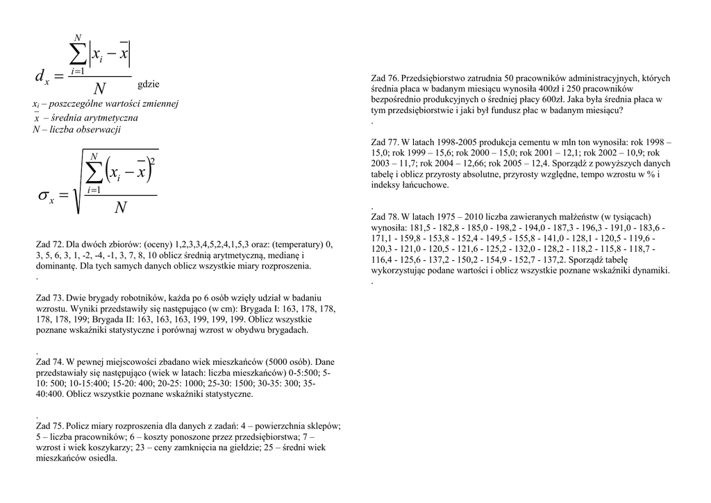 N dx x x i i 1 gdzie N xi – poszczególne wartości zmiennej x – średnia arytmetyczna N – liczba obserwacji x x N x i 1 2 i N Zad 72. Dla dwóch zbiorów: (oceny) 1,2,3,3,4,5,2,4,1,5,3 oraz: (temperatury) 0, 3, 5, 6, 3, 1, -2, -4, -1, 3, 7, 8, 10 oblicz średnią arytmetyczną, medianę i dominantę. Dla tych samych danych oblicz wszystkie miary rozproszenia. . Zad 73. Dwie brygady robotników, każda po 6 osób wzięły udział w badaniu wzrostu. Wyniki przedstawiły się następująco (w cm): Brygada I: 163, 178, 178, 178, 178, 199; Brygada II: 163, 163, 163, 199, 199, 199. Oblicz wszystkie poznane wskaźniki statystyczne i porównaj wzrost w obydwu brygadach. . Zad 74. W pewnej miejscowości zbadano wiek mieszkańców (5000 osób). Dane przedstawiały się następująco (wiek w latach: liczba mieszkańców) 0-5:500; 510: 500; 10-15:400; 15-20: 400; 20-25: 1000; 25-30: 1500; 30-35: 300; 3540:400. Oblicz wszystkie poznane wskaźniki statystyczne. . Zad 75. Policz miary rozproszenia dla danych z zadań: 4 – powierzchnia sklepów; 5 – liczba pracowników; 6 – koszty ponoszone przez przedsiębiorstwa; 7 – wzrost i wiek koszykarzy; 23 – ceny zamknięcia na giełdzie; 25 – średni wiek mieszkańców osiedla. Zad 76. Przedsiębiorstwo zatrudnia 50 pracowników administracyjnych, których średnia płaca w badanym miesiącu wynosiła 400zł i 250 pracowników bezpośrednio produkcyjnych o średniej płacy 600zł. Jaka była średnia płaca w tym przedsiębiorstwie i jaki był fundusz płac w badanym miesiącu? . Zad 77. W latach 1998-2005 produkcja cementu w mln ton wynosiła: rok 1998 – 15,0; rok 1999 – 15,6; rok 2000 – 15,0; rok 2001 – 12,1; rok 2002 – 10,9; rok 2003 – 11,7; rok 2004 – 12,66; rok 2005 – 12,4. Sporządź z powyższych danych tabelę i oblicz przyrosty absolutne, przyrosty względne, tempo wzrostu w % i indeksy łańcuchowe. . Zad 78. W latach 1975 – 2010 liczba zawieranych małżeństw (w tysiącach) wynosiła: 181,5 - 182,8 - 185,0 - 198,2 - 194,0 - 187,3 - 196,3 - 191,0 - 183,6 171,1 - 159,8 - 153,8 - 152,4 - 149,5 - 155,8 - 141,0 - 128,1 - 120,5 - 119,6 120,3 - 121,0 - 120,5 - 121,6 - 125,2 - 132,0 - 128,2 - 118,2 - 115,8 - 118,7 116,4 - 125,6 - 137,2 - 150,2 - 154,9 - 152,7 - 137,2. Sporządź tabelę wykorzystując podane wartości i oblicz wszystkie poznane wskaźniki dynamiki. .