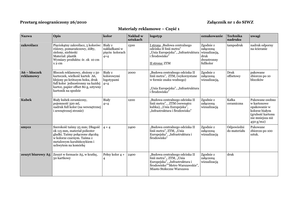 Przetarg nieograniczony 26/2010 Załącznik nr 1 do SIWZ Materiały reklamowe – Część 1 Nazwa Opis kolor zakreślacz Pięciokątny zakreślacz, 5 kolorów: różowy, pomarańczowy, żółty, zielony, niebieski Materiał: plastik Wymiary produktu: śr. ok 10 cm x 2 cm 1500 Biały z nakładkami w pięciu kolorach 4+4 Bloczek reklamowy, złożony z 50 karteczek, wielkość kartek A6, klejony po krótszym boku, druk full kolor jednostronny na każdej kartce, papier offset 80 g, sztywny kartonik na spodzie Biały z kolorowymi logotypami 4+4 A6 – bloczek reklamowy Nakład w sztukach 2000 logotyp oznakowanie Technika nadruku uwagi I strona „Budowa centralnego odcinka II linii metra” „Unia Europejska”, „Infrastruktura i Środowisko” tampodruk nadruk odporny na ścieranie II strona: ZTM Zgodnie z załączoną wizualizacją, druk dwustronny fullkolor „Budowa centralnego odcinka II linii metra”, ZTM, (wykorzystane w formie znaku wodnego) Zgodnie z załączoną wizualizacją, Druk offsetowy pakowane zbiorczo po 10 bloczków „Unia Europejska”, „Infrastruktura i Środowisko” Kubek Biały kubek ceramiczny, Biały pojemność 320 ml, 4+4 nadruk full kolor (na wewnętrznej i zewnętrznej stronie) 1200 „Budowa centralnego odcinka II linii metra”, , ZTM (wewnątrz kubka), „Unia Europejska”, „Infrastruktura i Środowisko” Zgodnie z załączoną wizualizacją Kalka ceramiczna Pakowane osobno w kartonowe opakowanie w kolorze białym (grubość kartonu nie mniejsza niż 450 g/m2) smycz Szerokość taśmy 25 mm; Długość ok 115 mm, materiał poliester gładki. Taśmy połączone złączką w kolorze czarnym. Taśma z metalowym karabińczykiem i uchwytem na komórkę 4+4 2400 „Budowa centralnego odcinka II linii metra”, ZTM, „Unia Europejska”, „Infrastruktura i Środowisko” Zgodnie z załączoną wizualizacją Odpowiedni do materiału Pakowane zbiorczo po 100 sztuk. Pełny kolor 4 + 4 2400 „Budowa centralnego odcinka II Zgodnie z linii metra”,, ZTM, „Unia załączoną Europejska”, „Infrastruktura i wizualizacją Środowisko”"Metro Warszawskie", Miasto Stołeczne Warszawa zeszyt biurowy A5 Zeszyt w formacie A5, w kratkę, 50 kartkowy druk