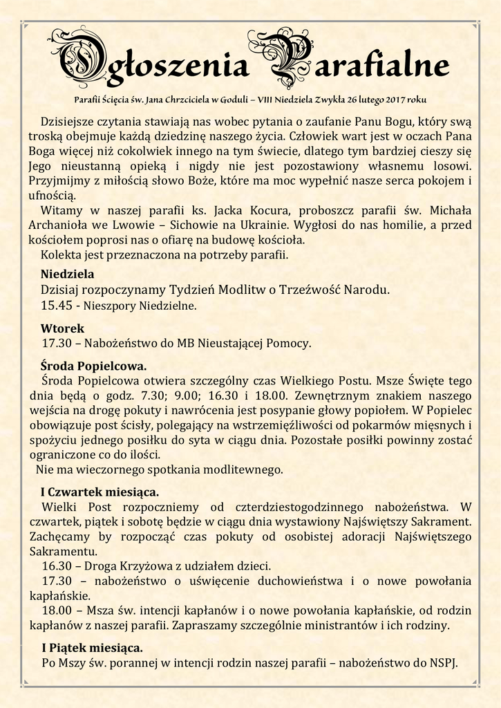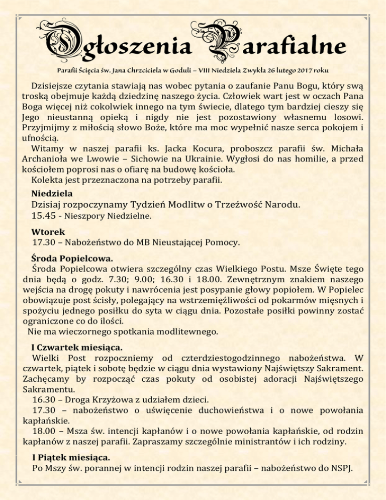 O P Dzisiejsze czytania stawiają nas wobec pytania o zaufanie Panu Bogu, który swą troską obejmuje każdą dziedzinę naszego życia. Człowiek wart jest w oczach Pana Boga więcej niż cokolwiek innego na tym świecie, dlatego tym bardziej cieszy się Jego nieustanną opieką i nigdy nie jest pozostawiony własnemu losowi. Przyjmijmy z miłością słowo Boże, które ma moc wypełnić nasze serca pokojem i ufnością. Witamy w naszej parafii ks. Jacka Kocura, proboszcz parafii św. Michała Archanioła we Lwowie – Sichowie na Ukrainie. Wygłosi do nas homilie, a przed kościołem poprosi nas o ofiarę na budowę kościoła. Kolekta jest przeznaczona na potrzeby parafii. Niedziela Dzisiaj rozpoczynamy Tydzień Modlitw o Trzeźwość Narodu. 15.45 - Nieszpory Niedzielne. Wtorek 17.30 – Nabożeństwo do MB Nieustającej Pomocy. Środa Popielcowa. Środa Popielcowa otwiera szczególny czas Wielkiego Postu. Msze Święte tego dnia będą o godz. 7.30; 9.00; 16.30 i 18.00. Zewnętrznym znakiem naszego wejścia na drogę pokuty i nawrócenia jest posypanie głowy popiołem. W Popielec obowiązuje post ścisły, polegający na wstrzemięźliwości od pokarmów mięsnych i spożyciu jednego posiłku do syta w ciągu dnia. Pozostałe posiłki powinny zostać ograniczone co do ilości. Nie ma wieczornego spotkania modlitewnego. I Czwartek miesiąca. Wielki Post rozpoczniemy od czterdziestogodzinnego nabożeństwa. W czwartek, piątek i sobotę będzie w ciągu dnia wystawiony Najświętszy Sakrament. Zachęcamy by rozpocząć czas pokuty od osobistej adoracji Najświętszego Sakramentu. 16.30 – Droga Krzyżowa z udziałem dzieci. 17.30 – nabożeństwo o uświęcenie duchowieństwa i o nowe powołania kapłańskie. 18.00 – Msza św. intencji kapłanów i o nowe powołania kapłańskie, od rodzin kapłanów z naszej parafii. Zapraszamy szczególnie ministrantów i ich rodziny. I Piątek miesiąca. Po Mszy św. porannej w intencji rodzin naszej parafii – nabożeństwo do NSPJ. Adoracja Najświętszego Sakramentu od 8.00 do 20.00. 17.00 – okazja do pierwszopiątkowej spowiedzi św. 17.15 – Nabożeństwo Drogi Krzyżowej. 18.00 – Msza św. szkolna. Dzieci, które przystępują w tym roku do Wczesnej i Pierwszej Komunii św. będą miały poświęcone Skarbce. Kolekta w tym dniu jest tradycyjnie przeznaczona na ubogie rodziny. I Sobota miesiąca. Święto św. Kazimierza Królewicza. 7.00 – Różaniec św. prowadzi Pierwsza Róża Różańcowa. 7.30 – Msza św. w intencji wynagrodzenia Niepokalanemu Sercu Maryi za wszelkie zniewagi i bluźnierstwa oraz w intencji za żywych i zmarłych członków Żywego Różańca Świętego. Od 9.00 – odwiedziny chorych, których prosimy zgłosić w zakrystii lub kancelarii. 17.00 Wystawienie Najświętszego Sakramentu i okazja do spowiedzi św. Następny tydzień W przyszłą niedzielę zapraszamy o 15.45 na Gorzkie żale z kazaniem pasyjnym. Kolekta przyszłej niedzieli ma charakter jałmużny postnej. Zapraszamy na czterodniową pielgrzymkę, w terminie od 8 do 11 czerwca. W planie pielgrzymki: Gietrzwałd, Świata Lipka, Sokółka i Wilno. Jest jeszcze kilka wolnych miejsc. Zapisy i wpłaty w zakrystii. Od jutrzejszego dnia przez cały tydzień można przynosić zużyty sprzęt elektroniczny i elektryczny obok bramy wjazdowej na probostwo. Dochód z tych elektrośmieci jest przeznaczony na cele misyjne. Zbiórka będzie trwała do przyszłej niedzieli. Prosimy nie przynosić później. Zachęcamy do czytania „Gościa Niedzielnego”. W tym tygodniu w Środę Popielcową rozpoczynamy przeżywanie okresu Wielkiego Postu. Zachęcamy do udziału w nabożeństwach Drogi Krzyżowej w piątki po Mszy św. wieczornej o godz. 17.30 i Gorzkich Żalach z kazaniami pasyjnymi w niedziele o godz. 15.00. Kazania pasyjne wygłosi ks. diakon Mateusz Włosek. W czasie Drogi Krzyżowej będziemy modlić się za zmarłych, zalecki można składać w zakrystii. Rekolekcje wielkopostne przeżywać będziemy w 3 Tygodniu Wielkiego Postu tj. 19-22 marca, a rekolekcje dla uczniów Naszej Szkoły odbędą się w dniach 3-5 kwietnia. Niedziela - 26 lutego – VIII Niedziela Zwykła Kolekta przeznaczona na bieżące potrzeby naszej kaplicy. Środa - 1 marca – Środa Popielcowa Zapraszamy do udziału w Mszach św. o godz. 8.00 i 17.00. Przypominamy, że w tym dniu obowiązuje wstrzemięźliwość od spożywania pokarmów mięsnych wszystkich, którzy ukończyli 14 rok życia, a post, czyli jeden posiłek do syta w ciągu dnia, obowiązuje wszystkich między 18 a 60 rokiem życia. Po wieczornej Mszy św. do godziny 18.30 okazja do osobistej adoracji Jezusa w Najświętszym Sakramencie. Piątek – 3 marca – I piątek miesiąca O godz. 16.00 Droga Krzyżowa dla dzieci. O godz. 16.30 Koronka do Miłosierdzia Bożego, a po niej okazja do osobistej adoracji Najświętszego Sakramentu i spowiedzi pierwszopiątkowej. O godz. 17.00 Msza św. wieczorna, a po niej o godz. 17.30 nabożeństwo Drogi Krzyżowej dla dorosłych i młodzieży. Sobota – 4 marca – I sobota miesiąca O godz. 7.30 różaniec, a następnie Msza Święta w intencji członków Żywego Różańca i nabożeństwo do Niepokalanego Serca Maryi. Chorych i starszych Parafian odwiedzimy z posługą sakramentalną od godz. 9.00. Prosimy ich zgłaszać w zakrystii kaplicy. Niedziela – 5 marca – I Niedziela Wielkiego Postu Kolekta ma charakter jałmużny postnej. Zebrane ofiary przeznaczone będą na dzieła charytatywne. O godz. 15.00 nabożeństwo Gorzkich Żali z kazaniem pasyjnym.