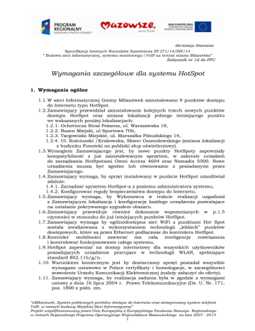 Specyfikacja Istotnych Warunków Zamówienia ZP.271/14/INF/14 ” Budowa sieci informatycznej, systemu monitoringu i VoIP na terenie miasta Milanówka” Załącznik nr 1d do PFU Wymagania szczegółowe dla systemu HotSpot 1. Wymagania ogólne 1.1. W sieci Informatycznej Gminy Milanówek zainstalowano 9 punktów dostępu do Internetu typu HotSpot. 1.2. Zamawiający przewidział zainstalowanie kolejnych trzech nowych punktów dostępu HotSpot oraz zmianę lokalizacji jednego istniejącego punktu we wskazanych poniżej lokalizacjach: 1.2.1. Ochotnicza Straż Pożarna, ul. Warszawska 18, 1.2.2. Basen Miejski, ul Sportowa 70b, 1.2.3. Targowisko Miejskie, ul. Marszałka Piłsudskiego 14, 1.2.4. Ul. Kościuszki /Krakowska, Skwer Ossendowskiego (zmiana lokalizacji z budynku Fonoteki na pobliski słup oświetleniowy). 1.3. Wymogiem Zamawiającego jest, by nowe punkty HotSpoty zapewniały kompatybilność z już zainstalowanym sprzętem, w zakresie urządzeń do zarządzania HotSpotami Omni Access 4604 oraz Nomadix 5500. Nowe urządzenia muszą być zgodne lub równoważne z posiadanymi przez Zamawiającego. 1.4. Zamawiający wymaga, by sprzęt instalowany w punkcie HotSpot umożliwiał zdalnie: 1.4.1. Zarządzać sprzętem HotSpot-a z poziomu administratora systemu, 1.4.2. Konfigurować reguły bezpieczeństwa dostępu do Internetu. 1.5. Zamawiający wymaga, by Wykonawca w trakcie realizacji uzgadniał z Zamawiającym lokalizację i konfigurację każdego urządzenia pozwalające na ustalanie pokrywanego sygnałem obszaru. 1.6. Zamawiający przewiduje również dokonanie wspomnianych w p.1.5 czynności w stosunku do już istniejących punktów HotSpot. 1.7. Zamawiający wymaga by ogólnodostępna sieć WiFi z punktami Hot Spot została zrealizowana z wykorzystaniem technologii „lekkich” punktów dostępowych, które są przez Ethernet podłączone do kontrolera HotSpot. 1.8. Kontroler mobilności zawierać ma całą inteligencję rozwiązania i kontrolować funkcjonowanie całego systemu, 1.9. HotSpot zapewniać na dostęp internetowy dla wszystkich użytkowników posiadających urządzenie pracujące w technologii WLAN, spełniające standard 802.11b/g/n. 1.10. Warunkiem koniecznym jest by dostarczony sprzęt posiadał wszystkie wymagane ustawowo w Polsce certyfikaty i homologacje, w szczególności zezwolenie Urzędu Komunikacji Elektronicznej (należy załączyć do oferty). 1.11. Zamawiający wymaga, by realizacja zadania była w zgodzie z wymogami ustawy z dnia 16 lipca 2004 r. Prawo Telekomunikacyjne (Dz. U. Nr. 171, poz. 1800 z późn. zm. ”eMilanówek, System publicznych punktów dostępu do Internetu oraz zintegrowany system telefonii VoIP, w ramach budowy Miejskiej Sieci Informatycznej” Projekt współfinansowany przez Unię Europejską z Europejskiego Funduszu Rozwoju Regionalnego w ramach Regionalnego Programu Operacyjnego Województwa Mazowieckiego na lata 2007 - 2013 1 Specyfikacja Istotnych Warunków Zamówienia ZP.271/14/INF/14 ” Budowa sieci informatycznej, systemu monitoringu i VoIP na terenie miasta Milanówka” 1.12. Zamawiający wymaga, by funkcjonowanie HotSpotów było zgodne z warunkami określonymi w rozporządzeniu Ministra Transportu z dnia 3 lipca 2007r. w sprawie urządzeń radiowych nadawczych lub nadawczoodbiorczych, które mogą być używane bez pozwolenia radiowego (Dz. U. z 2007r., Nr 138, poz 972 z późn. zm.). 1.13. W ramach realizacji zadania Wykonawca wykona testy i przedstawi dokumentację uwzględniającą pomiary zasięgu i mocy sygnału dla każdego punktu HotSpot. 1.14. Wykonawca skonfiguruje HotSpoty według wymagań zamawiającego. 2. Wymagania szczegółowe 2.1. Zamawiający przyjmuje, że kontroler HotSpot, oraz najważniejszych funkcje, które należy konfigurować w kontrolerze (i ewentualnie modyfikować przy podłączaniu nowych urządzeń i funkcjonalności) ma spełniać poniższe założenia: 2.1.1. DAT (Dynamic Address Translation) - dynamiczna translacja adresów umożliwiająca dostęp do Internetu użytkownikowi HotSpota bez względu na ustawienia TCP/IP w jego urządzeniu. Użytkownik może korzystać z prywatnego lub publicznego numeru IP, może mieć przyznany adres statyczny lub dynamiczny. Bez względu na te ustawienia będzie mógł skorzystać z HotSpota (nawet jeśli użytkownik dysponuje urządzeniem, w którym konto użytkownika posiada ograniczenia uniemożliwiające modyfikację parametrów TCP/IP systemu). 2.1.2. Dynamic Transparent Proxy - dzięki tej funkcji, ustawienia serwera Proxy w przeglądarce internetowej oraz ustawienia serwera pocztowego użytkownika HotSpota są nieistotne. Bez względu na ustawienia, użytkownik będzie mógł przeglądać WWW i korzystać z poczty bez modyfikacji konfiguracji swojego komputera (nawet, jeśli użytkownik dysponuje urządzeniem, w którym konto użytkownika posiada ograniczenia uniemożliwiające modyfikację parametrów przeglądarki – w tym proxy); ma to ponadto umożliwić sterowanie dostępem do wybranych stron WWW, a tym samym ograniczanie dostępności niepożądanych treści. 2.1.3. HPR (Home Page Redirection) - operator HotSpota może wymusić, że pierwszą stroną, którą ujrzy użytkownik HotSpota będzie strona zdefiniowana przez administratora systemu. 2.1.4. Zarządzanie pasmem – administrator HotSpota powinien mieć możliwość precyzyjnego określania parametrów łącza jakie będzie udostępnione dla użytkowników HotSpota. Dzięki zarządzaniu pasmem można określić jakie przepustowości powinien otrzymać każdy użytkownik. Ze względu na specyfikę przedsięwzięcia należy nałożyć ograniczenie do 256kbps ruchu przychodzącego na każdego przyłączonego użytkownika. 2.1.5. Plany taryfowe – co umożliwi zdefiniowanie publicznej taryfy dla użytkowników, a więc oprócz przepustowości, również, dopuszczalny czas aktywnego połączenia, ilość wysyłanych i pobieranych danych, zakres usług które mogą być wykorzystywane (pocz