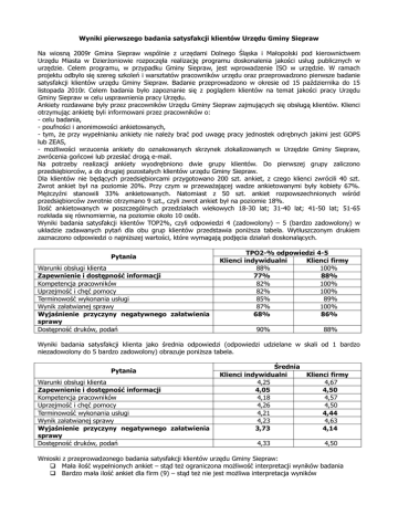 Wyniki pierwszego badania satysfakcji klientów Urzędu Gminy Siepraw Na wiosną 2009r Gmina Siepraw wspólnie z urzędami Dolnego Śląska i Małopolski pod kierownictwem Urzędu Miasta w DzierŜoniowie rozpoczęła realizację programu doskonalenia jakości usług publicznych w urzędzie. Celem programu, w przypadku Gminy Siepraw, jest wprowadzenie ISO w urzędzie. W ramach projektu odbyło się szereg szkoleń i warsztatów pracowników urzędu oraz przeprowadzono pierwsze badanie satysfakcji klientów urzędu Gminy Siepraw. Badanie przeprowadzono w okresie od 15 października do 15 listopada 2010r. Celem badania było zapoznanie się z poglądem klientów na temat jakości pracy Urzędu Gminy Siepraw w celu usprawnienia pracy Urzędu. Ankiety rozdawane były przez pracowników Urzędu Gminy Siepraw zajmujących się obsługą klientów. Klienci otrzymując ankietę byli informowani przez pracowników o: - celu badania, - poufności i anonimowości ankietowanych, - tym, Ŝe przy wypełnianiu ankiety nie naleŜy brać pod uwagę pracy jednostek odrębnych jakimi jest GOPS lub ZEAS, - moŜliwości wrzucenia ankiety do oznakowanych skrzynek zlokalizowanych w Urzędzie Gminy Siepraw, zwrócenia gońcowi lub przesłać drogą e-mail. Na potrzeby realizacji ankiety wyodrębniono dwie grupy klientów. Do pierwszej grupy zaliczono przedsiębiorców, a do drugiej pozostałych klientów urzędu Gminy Siepraw. Dla klientów nie będących przedsiębiorcami przygotowano 200 szt. ankiet, z czego klienci zwrócili 40 szt. Zwrot ankiet był na poziomie 20%. Przy czym w przewaŜającej wadze ankietowanymi były kobiety 67%. MęŜczyźni stanowili 33% ankietowanych. Natomiast z 50 szt. ankiet rozpowszechnionych wśród przedsiębiorców zwrotnie otrzymano 9 szt., czyli zwrot ankiet był na poziomie 18%. Ilość ankietowanych w poszczególnych przedziałach wiekowych 18-30 lat; 31-40 lat; 41-50 lat; 51-65 rozkłada się równomiernie, na poziomie około 10 osób. Wyniki badania satysfakcji klientów TOP2%, czyli odpowiedzi 4 (zadowolony) – 5 (bardzo zadowolony) w układzie zadawanych pytań dla obu grup klientów przedstawia poniŜsza tabela. Wytłuszczonym drukiem zaznaczono odpowiedzi o najniŜszej wartości, które wymagają podjęcia działań doskonalących. Pytania Warunki obsługi klienta Zapewnienie i dostępność informacji Kompetencja pracowników Uprzejmość i chęć pomocy Terminowość wykonania usługi Wynik załatwianej sprawy Wyjaśnienie przyczyny negatywnego załatwienia sprawy Dostępność druków, podań TPO2-% odpowiedzi 4-5 Klienci indywidualni Klienci firmy 88% 100% 77% 88% 82% 100% 82% 100% 85% 89% 87% 100% 68% 86% 90% 88% Wyniki badania satysfakcji klienta jako średnia odpowiedzi (odpowiedzi udzielane w skali od 1 bardzo niezadowolony do 5 bardzo zadowolony) obrazuje poniŜsza tabela. Pytania Warunki obsługi klienta Zapewnienie i dostępność informacji Kompetencja pracowników Uprzejmość i chęć pomocy Terminowość wykonania usługi Wynik załatwianej sprawy Wyjaśnienie przyczyny negatywnego załatwienia sprawy Dostępność druków, podań Średnia Klienci indywidualni Klienci firmy 4,25 4,67 4,05 4,50 4,18 4,57 4,26 4,50 4,21 4,44 4,23 4,63 3,73 4,14 4,33 4,50 Wnioski z przeprowadzonego badania satysfakcji klientów urzędu Gminy Siepraw: Mała ilość wypełnionych ankiet – stąd teŜ ograniczona moŜliwość interpretacji wyników badania Bardzo mała ilość ankiet dla firm (9) – stąd teŜ nie jest moŜliwa interpretacja wyników Wyniki – średnia dla większości pytań 4,0 – 4,3 - wynik dobry z moŜliwością dalszego doskonalenia Najgorsze oceny dla „przyczyn negatywnego wyjaśnienia sprawy” oraz „zapewnienia i dostępności informacji” Odpowiedzi na pytanie otwarte („napotkane utrudnienia”) głównie dotyczą zapewnienia informacji Z uwagi na niski zwrot ankiet badanie satysfakcji klientów zostanie powtórzone na wiosnę 2010r. Uzyskane wyniki z badania satysfakcji klientów pozwoliły pracownikom urzędu Gminy Siepraw podjąć zestaw działań przeciwdziałających niezadowoleniu klientów (w dwóch obszarach, które klienci postrzegają najgorzej). W celu: Wyjaśnienia przyczyny negatywnego załatwienia sprawy Ustalenie katalogu „spraw trudnych” i przygotowanie instrukcji dla pracowników co do wyjaśniania przyczyn odmowy klientom Zapewnienia i dostępności informacji Przygotowywana ksiąŜeczka „Jak załatwić sprawę w urzędzie” – obejmująca większość najczęściej załatwianych spraw Przygotowanie kart usług dla waŜniejszych usług - w ramach ISO Zwiększenie tablicy przy wejściu – z nazwami waŜniejszych spraw Newsletter - wysyłany na adresy mailowe z bazy adresowej utworzonej dzięki zamieszczonej informacji w gazecie lokalnej oraz na stronie www Prowadzenie statystyki ilości odwiedzin na stronie www urzędu Zawracamy się do Państwa o wzięcie aktywnego udziału w następnych badaniach satysfakcji klientów. Proszę pamiętać, Ŝe wyraŜając swoją opinię na temat funkcjonowania urzędu dają nam Państwo moŜliwość udoskonalenia oferowanych usług. /-/Wójt Gminy Siepraw