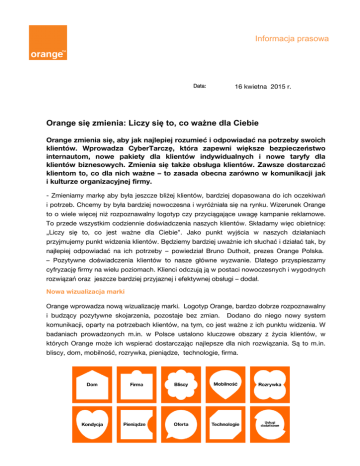 Informacja prasowa Data: 16 kwietna 2015 r. Orange się zmienia: Liczy się to, co ważne dla Ciebie Orange zmienia się, aby jak najlepiej rozumieć i odpowiadać na potrzeby swoich klientów. Wprowadza CyberTarczę, która zapewni większe bezpieczeństwo internautom, nowe pakiety dla klientów indywidualnych i nowe taryfy dla klientów biznesowych. Zmienia się także obsługa klientów. Zawsze dostarczać klientom to, co dla nich ważne – to zasada obecna zarówno w komunikacji jak i kulturze organizacyjnej firmy. - Zmieniamy markę aby była jeszcze bliżej klientów, bardziej dopasowana do ich oczekiwań i potrzeb. Chcemy by była bardziej nowoczesna i wyróżniała się na rynku. Wizerunek Orange to o wiele więcej niż rozpoznawalny logotyp czy przyciągające uwagę kampanie reklamowe. To przede wszystkim codziennie doświadczenia naszych klientów. Składamy więc obietnicę: „Liczy się to, co jest ważne dla Ciebie”. Jako punkt wyjścia w naszych działaniach przyjmujemy punkt widzenia klientów. Będziemy bardziej uważnie ich słuchać i działać tak, by najlepiej odpowiadać na ich potrzeby – powiedział Bruno Duthoit, prezes Orange Polska. – Pozytywne doświadczenia klientów to nasze główne wyzwanie. Dlatego przyspieszamy cyfryzację firmy na wielu poziomach. Klienci odczują ją w postaci nowoczesnych i wygodnych rozwiązań oraz jeszcze bardziej przyjaznej i efektywnej obsługi – dodał. Nowa wizualizacja marki Orange wprowadza nową wizualizację marki. Logotyp Orange, bardzo dobrze rozpoznawalny i budzący pozytywne skojarzenia, pozostaje bez zmian. Dodano do niego nowy system komunikacji, oparty na potrzebach klientów, na tym, co jest ważne z ich punktu widzenia. W badaniach prowadzonych m.in. w Polsce ustalono kluczowe obszary z życia klientów, w których Orange może ich wspierać dostarczając najlepsze dla nich rozwiązania. Są to m.in. bliscy, dom, mobilność, rozrywka, pieniądze, technologie, firma. Oferty Orange będą odtąd umieszczane w wyrazistych kontekstach, zrozumiałych dla klientów, przedstawiających potrzeby oraz odpowiedź Orange na nie w postaci produktów i usług. Zmieniają się także inne elementy wizualizacji marki, takie jak bardziej urozmaicona paleta kolorów, styl zdjęć i grafik. Nowe oferty i nowa jakość w obsłudze klientów Salony Orange i pozostałe kanały sprzedaży będą jeszcze lepiej się uzupełniać by zapewnić klientom jednakowe, pozytywne doświadczenia. Już dziś można odebrać zamówienie złożone przez internet w dowolnym salonie Orange. Na recepcji w salonach Orange będzie można załatwić wiele prostych spraw „od ręki”. Sukcesywnie wdrażany będzie inteligentny system zarządzania ruchem w salonie, pozwalający klientowi zaplanować wizytę w dogodnym terminie. W Warszawie wkrótce zostanie otwarty Smart Store – interaktywny salon przyszłości. Klienci którzy korzystają z wielu usług Orange, będą mogli załatwić większość spraw poprzez jednego, wyznaczonego dla nich doradcę. Rusza także system obsługi dla seniorów. Klienci korzystający z aplikacji Mój Orange mogą się już łączyć z infolinią bezpośrednio z poziomu aplikacji, a już wkrótce będą mogli opłacać swoje rachunki za pomocą smartfona. Odświeżona została także część samoobsługowa portalu www.orange.pl. Szczegółowe informacje na ten temat znajdują się tu: link Startują nowe oferty: Nowe plany taryfowe dla biznesu, to efekt badań preferencji klientów. W nowych taryfach otrzymują oni pakiety internetu LTE oraz nielimitowane rozmowy, SMS-y i MMS-y w kraju. Prócz tego, do wyboru są plany zapewniające nawet do 1000 minut na rozmowy i 1 GB na internet w roamingu oraz nielimitowane połączenia do krajów UE. Stałym klientom Orange oferuje dodatkowe korzyści przy przedłużaniu umowy. Szczegółowe informacje na ten temat znajdują się tu: link Pakiety usług dla klientów indywidualnych - Rodzinny, Komfortowy i Wygodny. Każdy zawiera zestaw usług domowych i mobilnych, przydatnych w obszarach, które sami klienci określili jako ważne - Bliscy, Dom i Mobilność. Cena usług w pakiecie jest niższa niż przy zamówieniu pojedynczych ofert, ponieważ każdy pakiet zawiera rabat Orange Open. Szczegółowe informacje na ten temat znajdują się tu: link Bardziej bezpieczny internet z CyberTarczą. To nowe, bezpłatne rozwiązanie, które zapewni większe bezpieczeństwo w sieci użytkownikom Neostrady. Umożliwia wykrycie większości potencjalnych zagrożeń internetowych, a także samodzielne sprawdzanie stanu bezpieczeństwa urządzeń podłączonych do domowej sieci. Szczegółowe informacje na ten temat znajdują się tu: link 2 Zobowiązania Orange Firma przedstawia także Zobowiązania Orange, deklarację pokazującą na konkretnych dowodach jak odpowiadamy na oczekiwania i potrzeby klientów. To efekty pracy nad doskonaleniem doświadczeń klientów w Orange, wykonanej na przestrzeni ostatnich lat. Szczegółowe informacje na ten temat znajdują się tu: link Wojciech Jabczyński, rzecznik Orange Polska e-mail: [email protected] 3