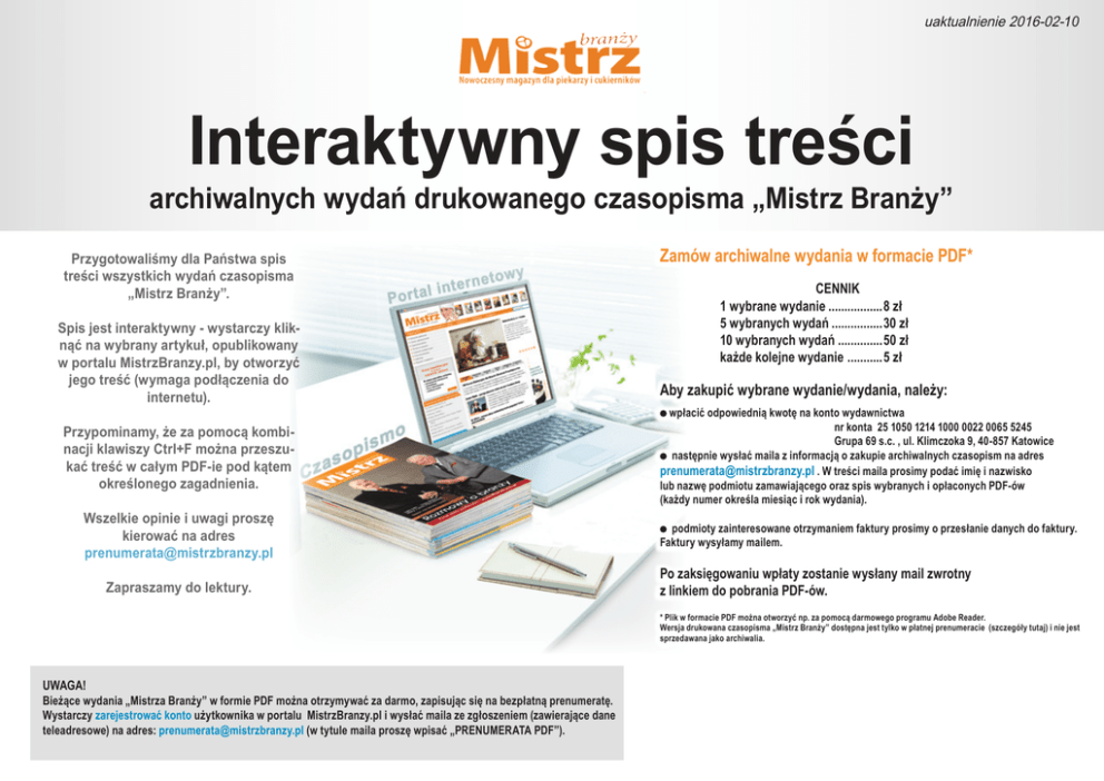 uaktualnienie 2016-02-10 Interaktywny spis treści archiwalnych wydań drukowanego czasopisma „Mistrz Branży” Przygotowaliśmy dla Państwa spis treści wszystkich wydań czasopisma „Mistrz Branży”. Spis jest interaktywny - wystarczy kliknąć na wybrany artykuł, opublikowany w portalu MistrzBranzy.pl, by otworzyć jego treść (wymaga podłączenia do internetu). Przypominamy, że za pomocą kombinacji klawiszy Ctrl+F można przeszukać treść w całym PDF-ie pod kątem określonego zagadnienia. Wszelkie opinie i uwagi proszę kierować na adres [email protected] Zapraszamy do lektury. Zamów archiwalne wydania w formacie PDF* CENNIK 1 wybrane wydanie..................8 zł 5 wybranych wydań.................30 zł 10 wybranych wydań...............50 zł każde kolejne wydanie . ..........5 zł Aby zakupić wybrane wydanie/wydania, należy: wpłacić odpowiednią kwotę na konto wydawnictwa nr konta 25 1050 1214 1000 0022 0065 5245 Grupa 69 s.c. , ul. Klimczoka 9, 40-857 Katowice następnie wysłać maila z informacją o zakupie archiwalnych czasopism na adres [email protected] . W treści maila prosimy podać imię i nazwisko lub nazwę podmiotu zamawiającego oraz spis wybranych i opłaconych PDF-ów (każdy numer określa miesiąc i rok wydania). podmioty zainteresowane otrzymaniem faktury prosimy o przesłanie danych do faktury. Faktury wysyłamy mailem. Po zaksięgowaniu wpłaty zostanie wysłany mail zwrotny z linkiem do pobrania PDF-ów. * Plik w formacie PDF można otworzyć np. za pomocą darmowego programu Adobe Reader. Wersja drukowana czasopisma „Mistrz Branży” dostępna jest tylko w płatnej prenumeracie (szczegóły tutaj) i nie jest sprzedawana jako archiwalia. UWAGA! Bieżące wydania „Mistrza Branży” w formie PDF można otrzymywać za darmo, zapisując się na bezpłatną prenumeratę. Wystarczy zarejestrować konto użytkownika w portalu MistrzBranzy.pl i wysłać maila ze zgłoszeniem (zawierające dane teleadresowe) na adres: [email protected] (w tytule maila proszę wpisać „PRENUMERATA PDF”). www Tytuł materiału Autor Tematyka Przepis na rzemieślniczy chleb według Kiełtyków Krzysztof Kamiński produkcja piekarstwo W świecie czekolady przyszłości. 12 pytań do chocolatiera Aneesha Popata Magdalena Tomaszewska-Bolałek wywiad czekolada Klienta trzeba zaskakiwać. Papryka zamiast wanilii – lody gastronomiczne Aurora Czekoladowa wywiad lodziarstwo Optymalizacja tras i monitoring pojazdów – sposobem na obniżenie kosztów transportu Adam Steć Najczęstsze błędy w zeznaniach podatkowych przedsiębiorców marzec 2015 Myślenie w kategoriach design thinking – jak zachować zdrowy balans między liczbami i emocjami – cz. I Alina Śmiłowska Na drodze do mistrzostwa. Szkolenia – fakty i mity Joanna Tokar Networking – jak pielęgnować kontakty oszczędność zagadnienia - tagi (słowa kluczowe) na portalu MistrzBranzy.pl receptura ekologia chleb trendy zarządzanie oprogramowanie i komputer podatek zarządzanie firma pracownik szkolenie zarządzanie SweetDecor – nauczymy Cię, jak wykonać tort idealny, a potem wyposażymy w niezbędne akcesoria! Zobacz Katalog Receptur Wielkanocnych na ISSUU LISTA: Colomba di Pasqua Marchewkowa baba drożdżowa Pascha w białej czekoladzie Włoska Baba’ Tarta świąteczna Tarta cytrusowa z bezą Lekki torcik z chrupiącym kokosem Szachownica Babka piaskowa czekoladowa i jasna Torcik orzechowy Żółty spodek Chleb Bułgarski Kremówka nałęczowska Uldo Panettone Panefit Sitkowy Muffiny Wielkanocne Pomarańczowo-serowy cake Słodki stół na cztery pory roku – wiosna Lukier w trzech odsłonach Anna Sacharczuk dodatki do żywności Silna potrzeba chrupania Henryk Piesiewicz asoeryment trendy Wariacje na temat fugasów Henryk Piesiewicz asortyment receptura Jajkiem po mapie – podróż po wielkanocnej Europie Kucharnia Wielkanoc Tak się robi reklamę! Wyszukane w Internecie Wielkanoc pizza reklama I co jeszcze? Artykuły z nowszych numerów nie są zamieszczane na portalu - zapraszamy do wykupienia prenumeraty - kliknij żeby przenieść się do danego materiału na portalu MistrzBranzy.pl (wymaga połączenia z Internetem) www Tytuł materiału Autor Mistrzyni kunsztu, smaku i elegancji Tematyka wywiad zagadnienia - tagi (słowa kluczowe) na portalu MistrzBranzy.pl cukiernictwo Mistrzostwa Śląska mają swojego Anioła Efektywne oszczędzanie energii elektrycznej Paweł Kurtasz oszcędność Tajemnica wypieku pysznego chleba – cuda i cudeńka pracy biznesowej Alina Śmiłowska piekarstwo zarządzanie Nowoczesne metody kompletacji Adam Steć automatyzacja komputer i oprogramowanie Kryzys? Mnie to nie dotyczy! Akademia Mistrza sprzedaż i marketing zarządzanie internet Sztuka molekularna według Krzysztofa Poloka Jacek Baliński innowacja trendy produkcja Koszyczek z ciasta drożdżowego Anna Grochalska tutorial receptura Wielkanoc Alternatywne źródła cukru Anna Maria surowce Just do it! Anna Daraż tutorial Ciasto martwe – w wersji na słodko i na słono Wiesław Kucia pieczywo chleb receptura Świadome spojrzenie na kawę Krzysztof Barabosz receptura Popraw warunki pracy, zdobądź Dyplom PIP Receptura www luty 2015 Autor Tort cytrynowy z bazylią AKO Czekoladowe ciasto Dorota Sępkowska Lauretta bez mąki z nadzieniem migdałowym piekarstwo kawa Szejki wśród orzeźwiających napojów Milkshake – od powstania do produkcji Piotr Ławrowski produkcja kawiarnia deser Chleb pszenny na zakwasie – przykład grecki Henryk Piesiewicz piekarstwo innowacja produkcja Opłatek waflowy w nowej odsłonie Karolina Ciesielska dekoracja Neurogastronomia - smak przyszłości Procesy w produkcji mrożonych wygarowanych kęsów ciasta produkcja chłodnictwo etykieta przepisy i prawo Sempre – zawsze frontem do klienta Czysta etykieta - czysty marketing Michał Rusek - kliknij żeby przenieść się do danego materiału na portalu MistrzBranzy.pl (wymaga połączenia z Internetem) Lubię