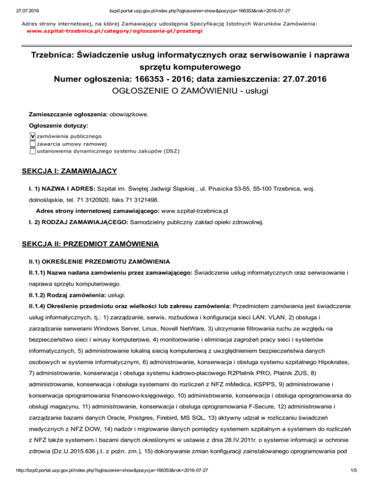 27.07.2016 bzp0.portal.uzp.gov.pl/index.php?ogloszenie=show&pozycja=166353&rok=20160727 Adres strony internetowej, na której Zamawiający udostępnia Specyfikację Istotnych Warunków Zamówienia: www.szpitaltrzebnica.pl/category/ogloszeniapl/przetargi Trzebnica: Świadczenie usług informatycznych oraz serwisowanie i naprawa sprzętu komputerowego Numer ogłoszenia: 166353 2016; data zamieszczenia: 27.07.2016 OGŁOSZENIE O ZAMÓWIENIU usługi Zamieszczanie ogłoszenia: obowiązkowe. Ogłoszenie dotyczy: V zamówienia publicznego zawarcia umowy ramowej ustanowienia dynamicznego systemu zakupów (DSZ) SEKCJA I: ZAMAWIAJĄCY I. 1) NAZWA I ADRES: Szpital im. Świętej Jadwigi Śląskiej , ul. Prusicka 5355, 55100 Trzebnica, woj. dolnośląskie, tel. 71 3120920, faks 71 3121498. Adres strony internetowej zamawiającego: www.szpitaltrzebnica.pl I. 2) RODZAJ ZAMAWIAJĄCEGO: Samodzielny publiczny zakład opieki zdrowotnej. SEKCJA II: PRZEDMIOT ZAMÓWIENIA II.1) OKREŚLENIE PRZEDMIOTU ZAMÓWIENIA II.1.1) Nazwa nadana zamówieniu przez zamawiającego: Świadczenie usług informatycznych oraz serwisowanie i naprawa sprzętu komputerowego. II.1.2) Rodzaj zamówienia: usługi. II.1.4) Określenie przedmiotu oraz wielkości lub zakresu zamówienia: Przedmiotem zamówienia jest świadczenie usług informatycznych, tj.: 1) zarządzanie, serwis, rozbudowa i konfiguracja sieci LAN, VLAN, 2) obsługa i zarządzanie serwerami Windows Server, Linux, Novell NetWare, 3) utrzymanie filtrowania ruchu ze względu na bezpieczeństwo sieci i wirusy komputerowe, 4) monitorowanie i eliminacja zagrożeń pracy sieci i systemów informatycznych, 5) administrowanie lokalną siecią komputerową z uwzględnieniem bezpieczeństwa danych osobowych w systemie informatycznym, 6) administrowanie, konserwacja i obsługa systemu szpitalnego Hipokrates, 7) administrowanie, konserwacja i obsługa systemu kadrowopłacowego R2Płatnik PRO, Płatnik ZUS, 8) administrowanie, konserwacja i obsługa systemami do rozliczeń z NFZ mMedica, KSPPS, 9) administrowanie i konserwacja oprogramowania finansowoksięgowego, 10) administrowanie, konserwacja i obsługa oprogramowania do obsługi magazynu, 11) administrowanie, konserwacja i obsługa oprogramowania FSecure, 12) administrowanie i zarządzanie bazami danych Oracle, Postgres, Firebird, MS SQL, 13) aktywny udział w rozliczaniu świadczeń medycznych z NFZ DOW, 14) nadzór i migrowanie danych pomiędzy systemem szpitalnym a systemem do rozliczeń z NFZ także systemem i bazami danych określonymi w ustawie z dnia 28.IV.2011r. o systemie informacji w ochronie zdrowia (Dz.U.2015.636 j.t. z poźn. zm.), 15) dokonywanie zmian konfiguracji zainstalowanego oprogramowania pod http://bzp0.portal.uzp.gov.pl/index.php?ogloszenie=show&pozycja=166353&rok=20160727 1/5 27.07.2016 bzp0.portal.uzp.gov.pl/index.php?ogloszenie=show&pozycja=166353&rok=20160727 kątem dostosowywania go do potrzeb Szpitala, w tym w zakresie SIM (System Informacji w Ochronie Zdrowia), 16) pomoc merytoryczna w organizowaniu niezbędnych zakupów sprzętu informatycznego i oprogramowania, w tym tworzenie opisu przedmiotu zamówienia dla zamówień objętych ustawą PZP, zgodnie z art. 29 i 30 Ustawy Pzp, 17) instalacja i konfiguracja stacji roboczych do pracy w sieci szpitala, 18) czuwanie nad bezpieczeństwem sieci, 19) świadczenie konsultacji, pomocy, pełnienie funkcji Administratora Systemu Informatycznego oraz doradztwa w zakresie zainstalowanego oprogramowania, sprzętu komputerowego, 20) konfiguracja oprogramowania według wytycznych użytkowników w zakresie możliwości systemu, 21) tworzenie i weryfikacja kopii zapasowych systemów używanych przez Zamawiającego, 22) określenie i konsultowanie działań mających na celu rozwój systemu informatycznego Szpitala, 23) administrowanie i obsługa serwera poczty elektronicznej (m.in. zakładanie i likwidowanie kont poczty elektronicznej), 24) rozwijanie i utrzymanie aktualnej strony internetowej Zamawiającego, 25) administrowanie i obsługa stron WWW, DNS, w tym m.in.: aktualizowanie i modyfikowanie aktualnej strony internetowej Zamawiającego, 26) modyfikacje strony internetowej Szpitala pod kątem technologii flash (action script), java script, php, dom, xhtml, 27) archiwizacja danych na trwałych i nietrwałych nośnikach, 28) modyfikacje skryptów arkuszy kalkulacyjnych visual basic, 29) diagnoza i konserwacja sprzętu komputerowego, 30) serwis, naprawa sprzętu komputerowego (z wyłączeniem sprzętu peryferyjnego). II.1.5) przewiduje się udzielenie zamówień uzupełniających Określenie przedmiotu oraz wielkości lub zakresu zamówień uzupełniających II.1.6) Wspólny Słownik Zamówień (CPV): 72.00.00.005, 72.70.00.007, 50.31.20.005. II.1.7) Czy dopuszcza się złożenie oferty częściowej: nie. II.1.8) Czy dopuszcza się złożenie oferty wariantowej: nie. II.2) CZAS TRWANIA ZAMÓWIENIA LUB TERMIN WYKONANIA: Okres w miesiącach: 12. SEKCJA III: INFORMACJE O CHARAKTERZE PRAWNYM, EKONOMICZNYM, FINANSOWYM I TECHNICZNYM III.1) WADIUM Informacja na temat wadium: Zamawiający nie wymaga wniesienia wadium w niniejszym postępowaniu III.2) ZALICZKI III.3) WARUNKI UDZIAŁU W POSTĘPOWANIU ORAZ OPIS SPOSOBU DOKONYWANIA OCENY SPEŁNIANIA TYCH WARUNKÓW III. 3.1) Uprawnienia do wykonywania określonej działalności lub czynności, jeżeli przepisy prawa nakładają obowiązek ich posiadania Opis sposobu dokonywania oceny spełniania tego warunku Zamawiający nie stawia szczegółowego warunku w tym zakresie. Sprawdzenie spełnienia powyższego warunku zostanie dokonane na podstawie dołączonego do oferty oświadczenia, o którym mowa w pkt. 9.1.1 SIWZ wg zasady spełnia/nie spełnia III.3.2) Wiedza i doświadczenie Opis sposobu dokonywania oceny spełniania tego warunku http://bzp0.portal.uzp.gov.pl/index.php?ogloszenie=show&pozycja=166353&rok=20160727 2/5 27.07.2016 bzp0.portal.uzp.gov.pl/index.php?ogloszenie=show&pozycja=166353&rok=20160727 O zamówienie mogą