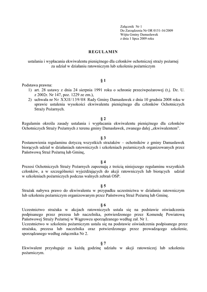 Załącznik Nr 1 Do Zarządzenia Nr OR 0151-16/2009 Wójta Gminy Damasławek z dnia 1 lipca 2009 roku REGULAMIN ustalania i wypłacania ekwiwalentu pieniężnego dla członków ochotniczej straży pożarnej za udział w działaniu ratowniczym lub szkoleniu pożarniczym §1 Podstawa prawna: 1) art. 28 ustawy z dnia 24 sierpnia 1991 roku o schronie przeciwpożarowej (t.j. Dz. U. z 2002r. Nr 147, poz. 1229 ze zm.), 2) uchwała nr Nr XXII/139/08 Rady Gminy Damasławek z dnia 10 grudnia 2008 roku w sprawie ustalenia wysokości ekwiwalentu pieniężnego dla członków Ochotniczych Straży Pożarnych. §2 Regulamin określa zasady ustalania i wypłacania ekwiwalentu pieniężnego dla członków Ochotniczych Straży Pożarnych z terenu gminy Damasławek, zwanego dalej „ekwiwalentem”. §3 Postanowienia regulaminu dotyczą wszystkich strażaków – ochotników z gminy Damasławek biorących udział w działaniach ratowniczych i szkoleniach pożarniczych organizowanych przez Państwową Straż Pożarną lub Gminę, §4 Prezesi Ochotniczych Straży Pożarnych zapoznają z treścią niniejszego regulaminu wszystkich członków, a w szczególności wyjeżdżających do akcji ratowniczych lub biorących udział w szkoleniach pożarniczych podczas walnych zebrań OSP. §5 Strażak nabywa prawo do ekwiwalentu w przypadku uczestnictwa w działaniu ratowniczym lub szkoleniu pożarniczym organizowanym przez Państwową Straż Pożarną lub Gminę. §6 Uczestnictwo strażaka w akcjach ratowniczych ustala się na podstawie oświadczenia podpisanego przez prezesa lub naczelnika, potwierdzonego przez Komendę Powiatową Państwowej Straży Pożarnej w Wągrowcu sporządzanego według zał. Nr 1. Uczestnictwo w szkoleniu pożarniczym ustala się na podstawie oświadczenia podpisanego przez strażaka, prezesa lub naczelnika oraz potwierdzonego przez prowadzącego szkolenie, sporządzanego według załącznika Nr 2. §7 Ekwiwalent przysługuje za każdą godzinę udziału w akcji ratowniczej lub szkoleniu pożarniczym. §8 Podstawą wypłaty ekwiwalentu jest lista płac sporządzona przez pracownika ds. ochrony przeciwpożarowej w oparciu o zestawienie stanowiące zał. Nr 3. §9 Czas udziału w akcji ratowniczej liczy się od momentu wyjazdu strażaków z remizy OSP do ich powrotu. Moment wyjazdu i powrotu musi być zgłoszony w Stanowisku Kierowania Komendy Powiatowej Państwowej Straży Pożarnej w Wągrowcu przez naczelnika bądź dowódcę. § 10 Przez działania ratownicze rozumie się każdą czynność podjętą w celu ochrony życia, zdrowia, mienia lub środowiska , a także likwidację przyczyn powstania pożaru, wystąpienia klęski żywiołowej lub innego miejscowego zagrożenia. Inne miejscowe zagrożenie jest to zdarzenie wynikające z rozwoju cywilizacyjnego i naturalnych praw przyrody niebędące pożarem ani klęską żywiołową stanowiące zagrożenie dla życia, zdrowia, mienia lub środowiska, któremu zapobieżenie lub którego usunięcie skutków nie wymaga zastosowania nadzwyczajnych środków. § 11 Za udział strażaka w działaniach, które nie są uznawane jako akcje ratownicze lub szkolenia pożarnicze, ekwiwalent nie przysługuje. § 12 Do działań, które nie są uznawane jako akcje ratownicze lub szkolenia pożarnicze zalicza się: 1) ćwiczenia, ochrona imprez, zawody pożarnicze, szkolenia BHP niezbędne do zapewnienia bezpieczeństwa strażaka w akcjach ratowniczych, turnieje i inne działania; nie dotyczy sytuacji w których występuje zagrożenie zdrowia lub bezpieczeństwa, 2) udrażnianie kanalizacji deszczowej, ściekowej itp. Jeśli nie jest to spowodowane ekstremalnymi warunkami pogodowymi lub zagrożeniem życia, zdrowia i mienia, § 13 Regulamin ustalania i wypłacania ekwiwalentu pieniężnego dla członków Ochotniczej Straży Pożarnej z terenu gminy Damasławek obowiązuje przez czas nieokreślony. § 14 Zmiana treści regulaminu może nastąpić w formie pisemnej, w tym samym trybie co jego ustanowienie bądź przez wprowadzenie nowego regulaminu. § 15 Postanowienia niniejszego regulaminu wchodzą w życie z dniem podpisania.