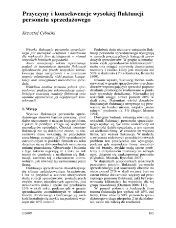 Przyczyny i konsekwencje wysokiej fluktuacji personelu sprzedaĝowego Krzysztof Cybulski Wysoka fluktuacja personelu sprzedaĝowego jest niezwykle uciÈĝliwa i kosztowna dla wiÚkszoĂci firm dziaïajÈcych w niemal wszystkich branĝach gospodarki. Autor niniejszego tekstu reprezentuje poglÈd, ĝe narastajÈce zjawisko fluktuacji sprzedawców jest przede wszystkim konsekwencjÈ zïego zarzÈdzania i w znacznym stopniu odzwierciedla niski poziom kompetencji oraz umiejÚtnoĂci menedĝerów sprzedaĝy. Wnikliwa analiza pozwala jednak sformuïowaÊ praktyczne rekomendacje umoĝliwiajÈce znaczÈcÈ redukcjÚ fluktuacji oraz wydatne ograniczenie jej negatywnych konsekwencji. 1. WstÚp Wysoka fluktuacja personelu sprzedaĝowego stanowi bardzo powaĝny, choÊ sïabo rozpoznany w naszym kraju problem, z jakim w praktyce zmaga siÚ wiÚkszoĂÊ menedĝerów sprzedaĝy. Chociaĝ rozmiary fluktuacji nie sÈ dokïadnie znane, to szacunkowe dane wskazujÈ, ĝe przeciÚtnie rzecz biorÈc, co najmniej 20% sprzedawców zatrudnionych w polskich firmach co roku decyduje siÚ na dobrowolnÈ lub wymuszonÈ zmianÚ pracodawcy. Obserwacje i badania z tego zakresu sugerujÈ, ĝe z roku na rok mamy do czynienia z nasilaniem siÚ fluktuacji, zarówno tej o charakterze dobrowolnym, jak równieĝ tej wymuszonej przez firmÚ. Fluktuacja sprzedawców charakteryzuje siÚ silnym zróĝnicowaniem branĝowym. Ib tak na przykïad w sektorze ubezpieczeñ skala rotacji sprzedawców, posiadajÈcych zwykle status niezaleĝnych agentów, jest stosunkowo niska i czÚsto nie przekracza 15% w skali roku, podczas gdy w grupie sprzedawców zatrudnionych w sektorze handlu detalicznego i hurtowego jej wielkoĂÊ ksztaïtuje siÚ zwykle na poziomie wyĝszym niĝ 40% rocznie! 1/2008 Podobnie duĝe róĝnice w natÚĝeniu fluktuacji personelu sprzedaĝowego wystÚpujÈ w ramach poszczególnych kategorii zawodowych sprzedawców. W grupie telemarketerów, czyli „sprzedawców telefonicznych”, moĝe ona osiÈgaÊ naprawdÚ dramatyczne rozmiary i rzadko kiedy jest mniejsza niĝ 50% w skali roku (Ptak-Kostecka, Kostecki 1999). Równie wysokÈ fluktuacjÚ moĝna zaobserwowaÊ w grupie sprzedawców-merchandiserów wspomagajÈcych sprzedaĝ poprzez dziaïania promocyjne realizowane w punktach sprzedaĝy detalicznej. Nierzadko jej wskaěnik osiÈga nawet poziom 80% w skali roku. Natomiast wĂród doradców finansowych fluktuacja utrzymuje siÚ przewaĝnie na bardzo niskim, niejako „naturalnym” poziomie ok. 5% (Sager, Menon 1994). DostÚpne badania wskazujÈ równieĝ, ĝe wskaěnik fluktuacji personelu sprzedaĝowego wydaje siÚ byÊ silnie uzaleĝniony od liczebnoĂci dziaïu sprzedaĝy, a tym samym od wielkoĂci firmy. W zasadzie im wiÚksza firma, tym wyĝsza fluktuacja. W maïych, a zwïaszcza rodzinnych przedsiÚbiorstwach problem ten praktycznie nie wystÚpuje, podczas gdy najwiÚksze firmy, niezaleĝnie od branĝy, zwykle majÈ spore problemy zb utrzymaniem fluktuacji na rozsÈdnym, dajÈcym siÚ zaakceptowaÊ poziomie (Cybulski, Misztak, Rycielski 2007). W dojrzaïych gospodarkach rynkowych przeciÚtny poziom fluktuacji personelu sprzedaĝowego jest szacowany obecnie na nieco ponad 27% w skali rocznej. Jest on zatem blisko dwukrotnie wiÚkszy od przeciÚtnego poziomu fluktuacji, jaki byï rejestrowany kilkanaĂcie lat wczeĂniej dla tej grupy zawodowej (Darmon 2006: 111). W ponad poïowie z badanych firm roczna fluktuacja jest wyĝsza niĝ 15%, zaĂ firmy, które utraciïy 50% personelu sprzedaĝowego w ciÈgu niespeïna 2 lat dziaïalnoĂci, wcale nie naleĝÈ do rzadkoĂci. 105 Badania prowadzone w USA, Kanadzie oraz Wielkiej Brytanii wskazujÈ ponadto, ĝe fluktuacja wĂród personelu sprzedaĝowego jest wyraěnie wyĝsza niĝ „przeciÚtna” dla innych grup zawodowych, a ponadto wykazuje staïÈ tendencjÚ wzrostowÈ (Darmon 2006: 111). Wiele wskazuje, ĝe zjawisko fluktuacji nie tylko z roku na rok coraz bardziej siÚ nasila, ale wywoïuje wysokie i stale rosnÈce, a co waĝniejsze w znacznej czÚĂci nieuzasadnione, koszty. W wiÚkszoĂci przypadków kosztów tych nie da siÚ precyzyjnie wyliczyÊ, ale przeprowadzone szacunki dowodzÈ, ĝe mogÈ byÊ one wyjÈtkowo wysokie (Darmon 2007: 202–206). Wyniki dostÚpnych badañ oraz obserwacja praktyki wskazujÈ na wystÚpowanie róĝnorodnych przyczyn fluktuacji sprzedawców, jednakĝe – w opinii autora niniejszego tekstu – zjawisko to w gïównej mierze odzwierciedla niskÈ jakoĂÊ zarzÈdzania dziaïem sprzedaĝy i jest ewidentnie przejawem sïabych umiejÚtnoĂci menedĝerskich kadry zarzÈdzajÈcej. O ile niewielka fluktuacja jest zwykle oznakÈ stabilizacji personelu ibmoĝe ĂwiadczyÊ o wysokiej jakoĂci zarzÈdzania oraz dobrej atmosferze w firmie, to wysokie wskaěniki rotacji wĂród sprzedawców zawsze powinny byÊ traktowane jako sygnaï alarmowy. WskazujÈ one na istnienie ewidentnych sïaboĂci w systemie zarzÈdzania personelem sprzedaĝowym i sÈ przede wszystkim odbiciem niskich kompetencji kadry menedĝerskiej. 2. Istota oraz rodzaje fluktuacji Termin ‘fluktuacja’ oznacza niestaïoĂÊ, zmiennoĂÊ, pïynnoĂÊ, chwiejnoĂÊ, wahania cykliczne, falowanie, odchylenie od stanu równowagi, odstÚpstwa od Ăredniej statystycznej, od przeciÚtnej, od normy i pochodzi od ïaciñskiego fluctuatio: „falowanie, cheïbotanie, niepewnoĂÊ”; oraz francuskiego fluctuare: „burzyÊ siÚ”, „przybieraÊ” (o morzu); od fluctus: ”ruch wody”, „prÈd”, „zamieszanie” etc. (Kopaliñski 1980: 328). Fluktuacja kadr to diametralna zmiana, wymiana bÈdě utrata personelu. W odniesieniu do grupy zawodowej sprzedawców fluktuacja oznacza „tempo, w jakim sprzedawcy opuszczajÈ organizacjÚ z powodu promocji, rezygnacji, przejĂcia na emeryturÚ lub zwolnienia”. Warto jednak zauwaĝyÊ, ĝe w literaturze przedmiotu, a zwïaszcza w badaniach poĂwiÚconych problematyce 106 fluktuacji personelu sprzedaĝowego zwykle mamy do czynienia z zawÚĝonÈ i