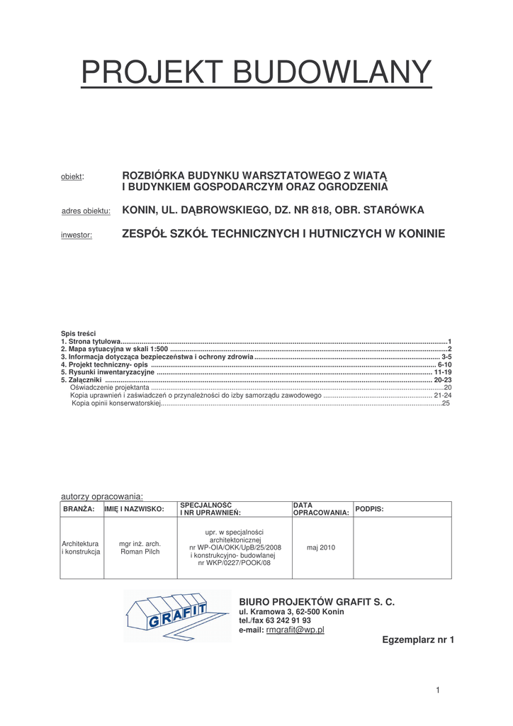 PROJEKT BUDOWLANY obiekt: ROZBIÓRKA BUDYNKU WARSZTATOWEGO Z WIAT I BUDYNKIEM GOSPODARCZYM ORAZ OGRODZENIA adres obiektu: KONIN, UL. D BROWSKIEGO, DZ. NR 818, OBR. STARÓWKA inwestor: ZESPÓŁ SZKÓŁ TECHNICZNYCH I HUTNICZYCH W KONINIE Spis tre ci 1. Strona tytułowa........................................................................................................................................................................... 1 2. Mapa sytuacyjna w skali 1:500 ................................................................................................................................................. 2 3. Informacja dotycz ca bezpiecze stwa i ochrony zdrowia ................................................................................................. 3-5 4. Projekt techniczny- opis ..................................................................................................................................................... 6-10 5. Rysunki inwentaryzacyjne ................................................................................................................................................ 11-19 5. Zał czniki ........................................................................................................................................................................... 20-23 O wiadczenie projektanta ......................................................................................................................................................... 20 Kopia uprawnie i za wiadcze o przynale no ci do izby samorz du zawodowego ......................................................... 21-24 Kopia opinii konserwatorskiej...................................................................................................................................................25 autorzy opracowania: BRAN A: Architektura i konstrukcja IMI I NAZWISKO: mgr in . arch. Roman Pilch SPECJALNO I NR UPRAWNIE : upr. w specjalno ci architektonicznej nr WP-OIA/OKK/UpB/25/2008 i konstrukcyjno- budowlanej nr WKP/0227/POOK/08 DATA PODPIS: OPRACOWANIA: maj 2010 BIURO PROJEKTÓW GRAFIT S. C. ul. Kramowa 3, 62-500 Konin tel./fax 63 242 91 93 e-mail: [email protected] Egzemplarz nr 1 1 2 INFORMACJA DOTYCZ CA BEZPIECZE STWA I OCHRONY ZDROWIA Nazwa i adres obiektu budowlanego: ROZBIÓRKA BUDYNKU WARSZTATOWEGO Z WIAT I BUDYNKIEM GOSPODARCZYM ORAZ OGRODZENIA KONIN, UL. D BROWSKIEGO, DZ. NR 818, OBR. STARÓWKA Inwestor: ZESPÓŁ SZKÓŁ TECHNICZNYCH I HUTNICZYCH W KONINIE Projektant sporz dzaj cy informacj dot. bezpiecze stwa i ochrony zdrowia: MGR IN . ARCH. ROMAN PILCH BIURO PROJEKTÓW „GRAFIT” S.C. KONIN, UL. KRAMOWA 3 3 1) Zakres robót dla całego zamierzenia budowlanego Rozbiórka budynku warsztatowego z wiat i budynkiem gospodarczym oraz ogrodzenia. 2) wykaz istniej cych obiektów budowlanych Budynek warsztatowy z wiat i budynkiem gospodarczym oraz ogrodzenie. 3) wskazanie elementów zagospodarowania działki lub terenu, które mog stwarza zagro enie bezpiecze stwa i zdrowia ludzi Budynek gospodarczy zlokalizowany jest w niewielkiej odległo ci od budynku na działce s siedniej, co wymaga zachowania szczególnych rodków ostro no ci przy rozbiórce, aby nie narazi konstrukcji tych budynków. Ogrodzenie przeznaczone do cz ciowej rozbiórki oraz ciana budynku gospodarczego zlokalizowane s bezpo rednio przy chodniku ul. D browskiego, dlatego na czas rozbiórki chodniki dla pieszych powinny by wyznaczone w miejscach zapewniaj cych bezpiecze stwo i oznakowane. Przy pracach rozbiórkowych nale y zachowa szczególn ostro no . Przed przyst pieniem do rozbiórki nale y wykona ogrodzenie działki tak, aby uniemo liwi dost p osobom postronnym. 4) wskazanie dotycz ce przewidywanych zagro e wyst puj cych podczas realizacji robót budowlanych, okre laj ce skal i rodzaje zagro e oraz miejsce i czas ich wyst pienia Przy rozbiórce dachów, strychów oraz pi ter nale y zachowa szczególn ostro no ze wzgl du na zły stan konstrukcji no nej budynków. Zabrania si demonta u elementów budynku poprzez zrzucanie ich z budynku lub poprzez niekontrolowane usuwanie elementów ze sob poł czonych. Dach wiaty oraz cz ci budynku gospodarczego pokryty jest płytami zawieraj cymi azbest. Przy rozbiórce dachu nale y zachowa szczególn ostro no i stosowa si do ni ej wymienionych zalece : 1. Wykonawca prac polegaj cych na zabezpieczaniu i usuwaniu wyrobów zawieraj cych azbest, obowi zany jest do: 1) uzyskania odpowiednio zezwolenia, pozwolenia, decyzji zatwierdzenia programu gospodarowania odpadami niebezpiecznymi albo zło enia organowi informacji o sposobie gospodarowania odpadami niebezpiecznymi; 2) przeszkolenia przez uprawnion instytucj zatrudnianych pracowników, osób kieruj cych lub nadzoruj cych prace polegaj ce na zabezpieczaniu i usuwaniu wyrobów zawieraj cych azbest w zakresie bezpiecze stwa i higieny pracy przy zabezpieczaniu i usuwaniu tych wyrobów oraz przestrzegania procedur dotycz cych bezpiecznego post powania; 3) opracowania przed rozpocz ciem prac szczegółowego planu prac usuwania wyrobów zawieraj cych azbest, obejmuj cego w szczególno ci: a) identyfikacj azbestu w przewidzianych do usuni cia materiałach, na podstawie udokumentowanej informacji od wła ciciela lub zarz dcy obiektu albo te na podstawie bada przeprowadzonych przez akredytowane laboratorium, b) informacje o metodach wykonywania planowanych prac, c) zakres niezb dnych zabezpiecze pracowników oraz rodowiska przed nara eniem na szkodliwo emisji azbestu, w tym problematyk okre lon przepisami dotycz cymi planu bezpiecze stwa i ochrony zdrowia, d) ustalenie niezb dnego dla rodzaju wykonywanych prac monitoringu powietrza; 4) posiadania niezb dnego wyposa enia technicznego i socjalnego zapewniaj cego prowadzenie okre lonych planem prac oraz zabezpiecze pracowników i rodowiska przed nara eniem na działanie azbestu. 2. W celu zapewnienia warunków bezpiecznego usuwania wyrobów zawieraj cych azbest z miejsca ich wyst powa