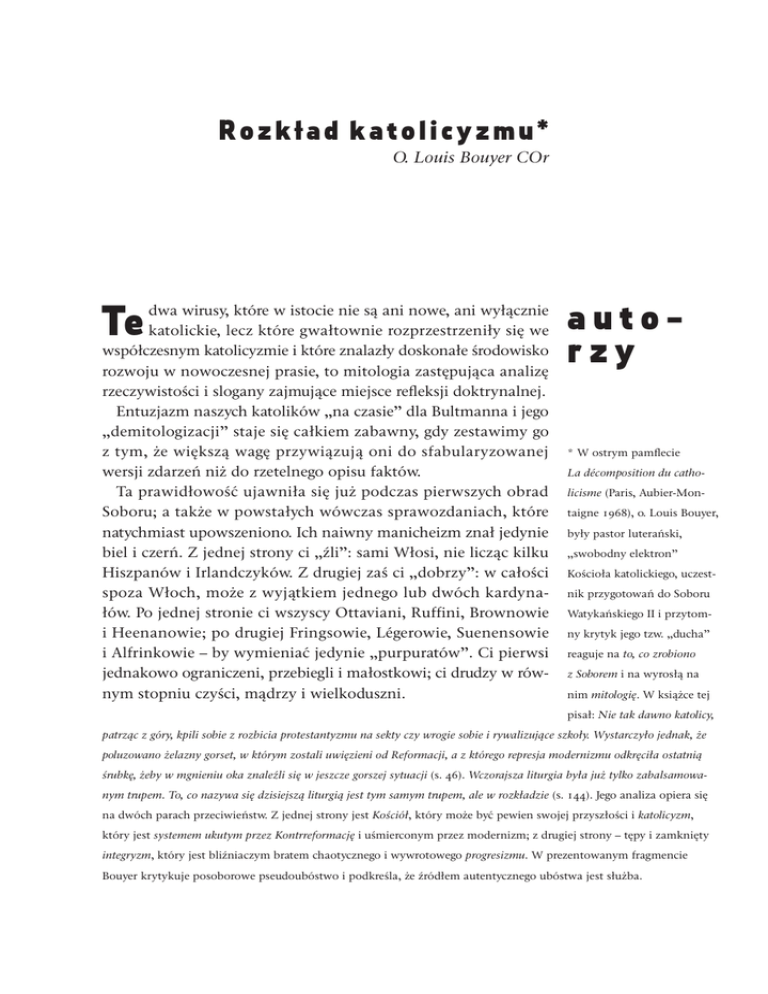 Rozkład katolicyzmu* O. Louis Bouyer COr Te dwa wirusy, które w istocie nie są ani nowe, ani wyłącznie katolickie, lecz które gwałtownie rozprzestrzeniły się we współczesnym katolicyzmie i które znalazły doskonałe środowisko rozwoju w nowoczesnej prasie, to mitologia zastępująca analizę rzeczywistości i slogany zajmujące miejsce refleksji doktrynalnej. Entuzjazm naszych katolików „na czasie” dla Bultmanna i jego „demitologizacji” staje się całkiem zabawny, gdy zestawimy go z tym, że większą wagę przywiązują oni do sfabularyzowanej wersji zdarzeń niż do rzetelnego opisu faktów. Ta prawidłowość ujawniła się już podczas pierwszych obrad Soboru; a także w powstałych wówczas sprawozdaniach, które natychmiast upowszeniono. Ich naiwny manicheizm znał jedynie biel i czerń. Z jednej strony ci „źli”: sami Włosi, nie licząc kilku Hiszpanów i Irlandczyków. Z drugiej zaś ci „dobrzy”: w całości spoza Włoch, może z wyjątkiem jednego lub dwóch kardynałów. Po jednej stronie ci wszyscy Ottaviani, Ruffini, Brownowie i Heenanowie; po drugiej Fringsowie, Légerowie, Suenensowie i Alfrinkowie – by wymieniać jedynie „purpuratów”. Ci pierwsi jednakowo ograniczeni, przebiegli i małostkowi; ci drudzy w równym stopniu czyści, mądrzy i wielkoduszni. autorzy * W ostrym pamflecie La décomposition du catho licisme (Paris, Aubier-Montaigne 1968), o. Louis Bouyer, były pastor luterański, „swobodny elektron” Kościoła katolickiego, uczestnik przygotowań do Soboru Watykańskiego II i przytomny krytyk jego tzw. „ducha” reaguje na to, co zrobiono z Soborem i na wyrosłą na nim mitologię. W książce tej pisał: Nie tak dawno katolicy, patrząc z góry, kpili sobie z rozbicia protestantyzmu na sekty czy wrogie sobie i rywalizujące szkoły. Wystarczyło jednak, że poluzowano żelazny gorset, w którym zostali uwięzieni od Reformacji, a z którego represja modernizmu odkręciła ostatnią śrubkę, żeby w mgnieniu oka znaleźli się w jeszcze gorszej sytuacji (s. 46). Wczorajsza liturgia była już tylko zabalsamowa nym trupem. To, co nazywa się dzisiejszą liturgią jest tym samym trupem, ale w rozkładzie (s. 144). Jego analiza opiera się na dwóch parach przeciwieństw. Z jednej strony jest Kościół, który może być pewien swojej przyszłości i katolicyzm, który jest systemem ukutym przez Kontrreformację i uśmierconym przez modernizm; z drugiej strony – tępy i zamknięty integryzm, który jest bliźniaczym bratem chaotycznego i wywrotowego progresizmu. W prezentowanym fragmencie Bouyer krytykuje posoborowe pseudoubóstwo i podkreśla, że źródłem autentycznego ubóstwa jest służba. 92 Christianitas 56-57/2014 AUTORZY Tak skonstruowana mitologia stanowiła wygodne oparcie dla sloganów. Z jednej strony tradycja, utożsamiona z najdalej posuniętym obskurantyzmem. Z drugiej blask nowości, bez najmniejszego skrawka cienia. Autorytet przeciw wolności (i odwrotnie). Doktryna w opozycji do duszpasterstwa. Ekumenizm przeciwstawiony (co jest najśmieszniejsze) trosce o jedność Kościoła, a zwłaszcza tezie o Jego jedyności, przeciwstawiony Kościołowi samemu. Getto albo otwartość na świat prowadząca aż do rozproszenia się w nim, itd. Bez wątpienia, przyznawano z chęcią lub niechęcią, że pomiędzy samymi kardynałami, jak i między innymi biskupami znajdowało się wiele ważnych osobistości nie przynależących do żadnej z tych kategorii. Przydzielano ich jednak prawie że ślepym trafem do jednej lub drugiej grupy, gdy tylko okazywali się zbyt wpływowi; ryzykowano przy tym pospieszne ich stamtąd wyprowadzenie i umieszczenie w grupie przeciwnej. Wielka nadzieja „białych”, kardynał Giovanni Battista Montini, późniejszy Paweł VI, po pewnym czasie korzystania z przywileju niepewności, został zaliczony do „czarnych”. Było w sumie wiele takich roszad, które, gdy się przyjrzeć nieco bliżej, dotyczyły tak naprawdę ludzi najbardziej znanych z wierności pozycjom wyważonym, a przy tym stałym. I patrząc od drugiej strony: analiza głosów oddanych od początku Soboru – a zwłaszcza podczas następującego po nim Synodu – wykazuje, że najbardziej „biali” spośród „białych” wielokrotnie mieli tendencję do tworzenia bloku z „najczarniejszymi” z „czarnych”. Staje się to tym bardziej uderzające, gdy zwrócimy uwagę na to, co działo się w komisjach biskupich ustanowionych w Rzymie do aplikacji Soboru. Zdarzenia te są bardzo znaczące i spróbujemy je głębiej omówić w odpowiednim czasie. Ta redukcja Konsylium – a zwłaszcza jego następstw – do konfliktu pomiędzy czarnymi owcami a barankami bez zmazy doprowadziła do tego, że opinia publiczna utraciła sprzed oczu podstawową rolę odegraną przez prawdziwych rzemieślników soborowego dzieła; zrobiono za to przelotną reklamę kilku osobom, które wbrew pozorom niewiele wniosły w tamte wydarzenia. Co gorsza, odsunięto umysły od prawdziwych problemów, zabawiając je opozycjami, które nawet jeśli po części były prawdziwe, to i tak pozostawały bardzo powierzchowne, a ich dokładne zna- O. Louis Bouyer COr Rozkład katolicyzmu czenie nie zostało nigdy objaśnione. Osoby jednak przemijają, a problemy pozostają. Dlatego też mitologia soborowa i posoborowa wyrządza największe szkody, gdy odnosi się bezpośrednio do tych ostatnich. Należałoby w tym miejscu zdemistyfikować przede wszystkim mity narosłe wokół służby, ubóstwa, kolegialności, ekumenizmu, otwarcia na świat i aggiornamento. Chciałbym zostać dobrze zrozumiany: wszystkie te tematy są najcenniejszymi zdobyczami czy też ponownymi odkryciami Soboru. Jednakże począwszy od czasów Vaticanum II, widzieliśmy, jak te idee pęczniały i deformowały się pod wpływem czynników, które właśnie opisałem. Od tamtego też czasu wcale nie przestały się rozdymać, aż do osiągnięcia obecnie stanu bliskiego eks