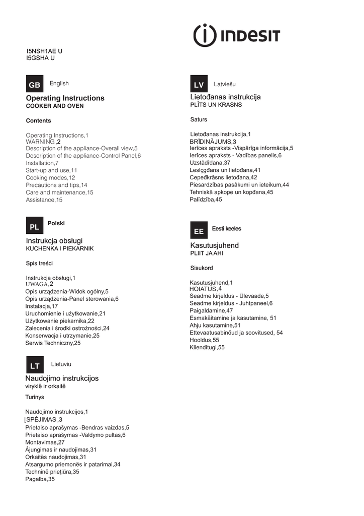 I5NSH1AE U I5GSHA U GB English Operating Instructions Latviešu LV Lietođanas instrukcija COOKER AND OVEN PLÎTS UN KRASNS Contents Saturs Operating Instructions,1 WARNING ,2 Description of the appliance-Overall view,5 Description of the appliance-Control Panel,6 Installation,7 Start-up and use,11 Cooking modes,12 Precautions and tips,14 Care and maintenance,15 Assistance,15 PL Ierîces apraksts -Vispârîga informâcija,5 Ierîces apraksts - Vadîbas panelis,6 Uzstâdîđana,37 Leslçgđana un lietođana,41 Cepeđkrâsns lietođana,42 Piesardzîbas pasâkumi un ieteikum,44 Tehniskâ apkope un kopđana,45 Palîdzîba,45 Polski EE Instrukcja obsługi KUCHENKA I PIEKARNIK Spis treści Instrukcja obsługi,1 UWAGA ,2 Opis urządzenia-Widok ogólny,5 Opis urządzenia-Panel sterowania,6 Instalacja,17 Uruchomienie i użytkowanie,21 Użytkowanie piekarnika,22 Zalecenia i środki ostrożności,24 Konserwacja i utrzymanie,25 Serwis Techniczny,25 LT Lietođanas instrukcija,1 BRĪDINĀJUMS,3 Lietuviu Naudojimo instrukcijos viryklë ir orkaitë Turinys Naudojimo instrukcijos,1 ĮSPĖJIMAS ,3 Prietaiso aprašymas -Bendras vaizdas,5 Prietaiso aprašymas -Valdymo pultas,6 Montavimas,27 Ájungimas ir naudojimas,31 Orkaitës naudojimas,31 Atsargumo priemonës ir patarimai,34 Techninë prieţiűra,35 Pagalba,35 Eesti keeles Kasutusjuhend PLIIT JA AHI Sisukord Kasutusjuhend,1 HOIATUS ,4 Seadme kirjeldus - Ülevaade,5 Seadme kirjeldus - Juhtpaneel,6 Paigaldamine,47 Esmakäitamine ja kasutamine, 51 Ahju kasutamine,51 Ettevaatusabinőud ja soovitused, 54 Hooldus,55 Klienditugi,55 GB WARNING WARNING: The appliance and its accessible parts become hot during use. Care should be taken to avoid touching heating elements. Children less than 8 years of age shall be kept away unless continuously supervised. This appliance can be used by children aged from 8 years and above and persons with reduced physical, sensory or mental capabilities or lack of experience and knowledge if they have been given supervision or instruction concerning use of the appliance in a safe way and understand the hazards involved. Children shall not play with the appliance. Cleaning and user maintenance shall not be made by children without supervision. WARNING: Unattended cooking on a hob with fat or oil can be dangerous and may result in fire. NEVER try to extinguish a fire with water, but switch off the appliance and then cover flame e.g. with a lid or a fire blanket. Do not use harsh abrasive cleaners or sharp metal scrapers to clean the oven door glass since they can scratch the surface, which may result in shattering of the glass. The internal surfaces of the compartment (where present) may become hot. Never use steam cleaners or pressure cleaners on the appliance. Remove any liquid from the lid before opening it. Do not close the glass cover (if present) when the gas burners or electric 2 hotplates are still hot. WARNING: Ensure that the appliance is switched off before replacing the lamp to avoid the possibility of electric shock. CAUTION: the use of inappropriate hob guards can cause accidents. ! When you place the rack inside, make sure that the stop is directed upwards and in the back of the cavity. PL UWAGA UWAGA: To urządzenie oraz jego dostępne części silnie się rozgrzewają podczas użytkowania. Należy uważać, aby nie dotknąć elementów grzejnych. Nie pozwalać, aby dzieci poniżej 8 roku życia zbliżały się do urządzenia, jeśli nie są pod stałym nadzorem dorosłych. Z niniejszego urządzenia mogą korzystać dzieci powyżej 8 roku życia i osoby o ograniczonych zdolnościach fizycznych, zmysłowych bądź umysłowych, jak również osoby nieposiadające doświadczenia lub znajomości urządzenia, jeśli znajdują się one pod nadzorem innych osób lub jeśli zostały pouczone na temat bezpiecznego sposobu użycia urządzenia oraz zdają sobie sprawę ze związanych z nim zagrożeń. Dzieci nie powinny bawić się urządzeniem. Prace związane z czyszczeniem i konserwacją nie mogą być wykonywane przez dzieci, jeśli nie są one nadzorowane. UWAGA: Pozostawienie bez nadzoru na kuchence tłuszczów i olejów może być niebezpieczne i może spowodować pożar. Nie należy NIGDY próbować ugasić płomieni/pożaru wodą; należy wyłączyć urządzenie i przykryć płomień np. pokrywką lub ognioodpornym kocem. Nie stosować środków ściernych ani ostrych łopatek metalowych do czyszczenia szklanych drzwiczek piekarnika, ponieważ mogłyby porysować powierzchnię i spowodować pęknięcie szyby. Wewnętrzne powierzchnie szuflady (jeśli jest w danym modelu) mogą się nagrzewać. Nie stosować nigdy oczyszczaczy parowych lub ciśnieniowych do czyszczenia urządzenia. Usunąć ewentualne płyny na pokrywie przed jej otwarciem. Nie zamykać szklanej pokrywy (jeśli jest częścią wyposażenia), jeśli palniki gazowe lub płyta elektryczna są jeszcze rozgrzane. UWAGA: Przed wymianą żarówki, należy się upewnić, że urządzenie jest wyłączone, aby uniknąć ryzyka porażenia prądem. UWAGA: użycie niewłaściwych zabezpieczeń płyty może być przyczyną wypadków. ! Wsuwając ruszt, naleĪy siĊ upewniü, Īe ogranicznik jest skierowany ku górze i znajduje siĊ on w tylnej czĊĞci komory. LT ĮSPĖJIMAS ĮSPĖJIMAS! Naudojamo prietaiso paviršiai ir pasiekiamos dalys įkaista. Būkite atsargūs ir neprisilieskite prie įkaitusių prietaiso dalių. Jaunesni nei 8 metų vaikai gali būti prileidžiami prie prietaiso tik prižiūrimi suaugusiųjų. Vyresni nei 8 metų vaikai ir asmenys, turintys fizinių, jutimo ar psichinių sutrikimų arba nepakankamai žinių ar patirties, šiuo prietaisu gali naudotis tik tuo atveju, jei jie yra prižiūrimi arba instruktuojami, kaip saugiai naudoti prietaisą, taip pat supranta kylančias grėsmes. Vaikams turi būti draudžiama žaisti su prietaisu. Neprižiūrimi vaikai taip pat negali valyti prietaiso ar atlikti jo priežiūros darbų. ĮSPĖJIMAS! Ant įjung