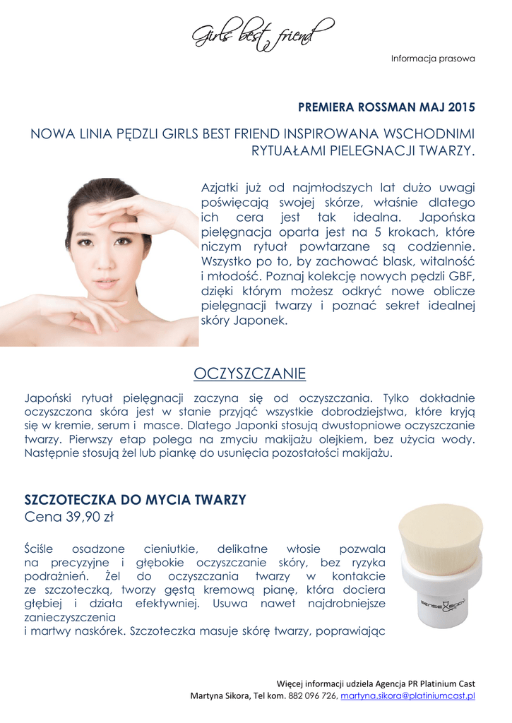 Informacja prasowa PREMIERA ROSSMAN MAJ 2015 NOWA LINIA PĘDZLI GIRLS BEST FRIEND INSPIROWANA WSCHODNIMI RYTUAŁAMI PIELEGNACJI TWARZY. Azjatki już od najmłodszych lat dużo uwagi poświęcają swojej skórze, właśnie dlatego ich cera jest tak idealna. Japońska pielęgnacja oparta jest na 5 krokach, które niczym rytuał powtarzane są codziennie. Wszystko po to, by zachować blask, witalność i młodość. Poznaj kolekcję nowych pędzli GBF, dzięki którym możesz odkryć nowe oblicze pielęgnacji twarzy i poznać sekret idealnej skóry Japonek. OCZYSZCZANIE Japoński rytuał pielęgnacji zaczyna się od oczyszczania. Tylko dokładnie oczyszczona skóra jest w stanie przyjąć wszystkie dobrodziejstwa, które kryją się w kremie, serum i masce. Dlatego Japonki stosują dwustopniowe oczyszczanie twarzy. Pierwszy etap polega na zmyciu makijażu olejkiem, bez użycia wody. Następnie stosują żel lub piankę do usunięcia pozostałości makijażu. SZCZOTECZKA DO MYCIA TWARZY Cena 39,90 zł Ściśle osadzone cieniutkie, delikatne włosie pozwala na precyzyjne i głębokie oczyszczanie skóry, bez ryzyka podrażnień. Żel do oczyszczania twarzy w kontakcie ze szczoteczką, tworzy gęstą kremową pianę, która dociera głębiej i działa efektywniej. Usuwa nawet najdrobniejsze zanieczyszczenia i martwy naskórek. Szczoteczka masuje skórę twarzy, poprawiając Więcej informacji udziela Agencja PR Platinium Cast Martyna Sikora, Tel kom. 882 096 726, [email protected] mikrokrążenie i ukrwienie. Masaż twarzy jest jednym z 5 kroków japońskiej pielęgnacji. Szczoteczka jest wyposażona w sznureczek, na którym możną ją powiesić do wyschnięcia. SZCZOTECZKA DO PRECYZYJNEGO OCZYSZCZANIA Cena 19,90 zł Działa miejscowo i precyzyjnie. Pozwala na jeszcze skuteczniejsze oczyszczenie skóry z zaskórników i nadmiaru serum - przede wszystkim w trudno dostępnych miejscach np. skrzydełka nosa. Żel do oczyszczania twarzy w kontakcie ze szczoteczką, tworzy gęstą kremową pianę, która dociera głębiej i działa efektywniej. Metalowa końcówka to łyżeczka unny, którą delikatnie dociskając do skóry usuniesz nadmiar sebum i zaskórniki. APLIKACJA KOSMETYKÓW Idealnie oczyszczona skóra zwiększa skuteczność składników aktywnych zawartych w kosmetykach. Odżywianie i nawilżanie skóry jest dla Azjatek równie ważne, jak oczyszczanie skóry. Dlatego jeszcze przed ostatnim etapem pielęgnacji - nałożeniem kremu, aplikują maski pielęgnacyjne. PĘDZEL DO APLIKACJI MASEK Cena 19,90 zł Pozwala w zaciszu domowym osiągnąć jakość usługi wykonywanej w salonie kosmetycznym. Dzięki spłaszczonemu kształtowi precyzyjnie i równomiernie można nałożyć maseczkę lub kwasy złuszczające. Do aplikacji masek w trudno dostępnych miejscach, służy wąska strona pędzla. Pędzel świetnie sprawdza się również do mieszania i rozrabiania z wodą, maseczek w proszku. PĘDZEL DO APLIKACJI KREMÓW Cena 24,90 zł Pędzel budową przypominający opuszek palca. Tak wyprofilowany kształt, pozwala na precyzyjne i równomierne rozprowadzenie kosmetyków pielęgnacyjnych. Stworzony tak, by dotrzeć do trudnych miejsc, np. skrzydełka nosa. Pędzle Girls Best Friend wykonane są z syntetycznego włosia, które nie wchłania nadmiaru kosmetyków i nie uczula. Więcej informacji udziela Agencja PR Platinium Cast Martyna Sikora, Tel kom. 882 096 726, [email protected]