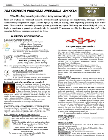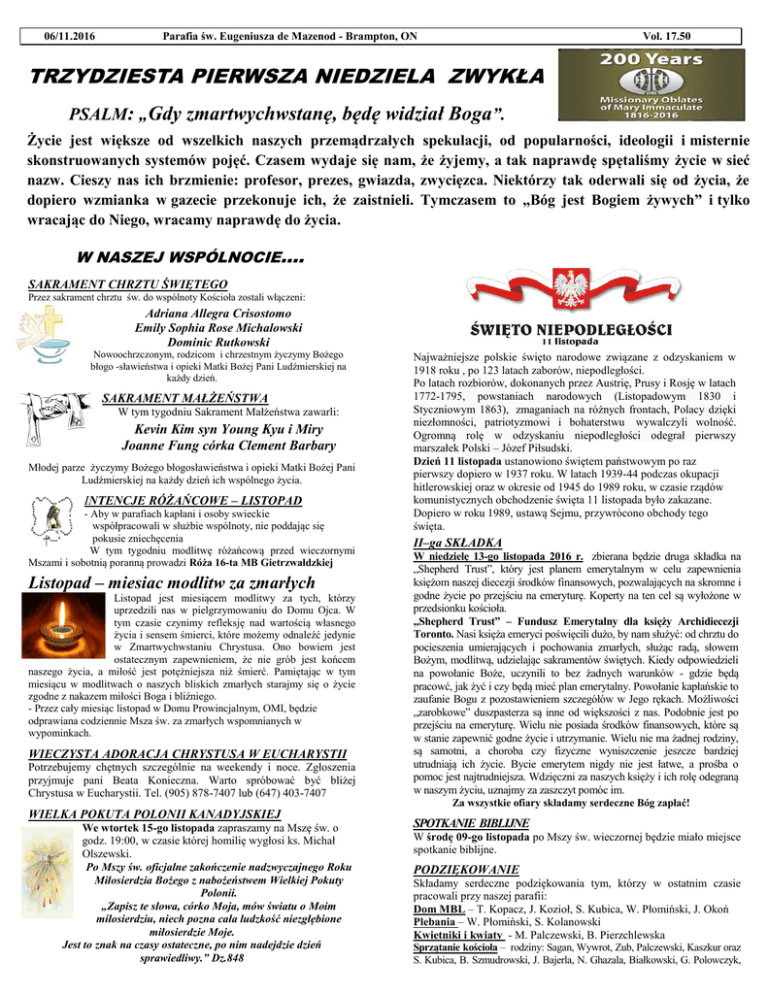 06/11.2016 Parafia św. Eugeniusza de Mazenod - Brampton, ON Vol. 17.50 TRZYDZIESTA PIERWSZA NIEDZIELA ZWYKŁA PSALM: „Gdy zmartwychwstanę, będę widział Boga”. Życie jest większe od wszelkich naszych przemądrzałych skonstruowanych systemów pojęć. Czasem wydaje się nam, nazw. Cieszy nas ich brzmienie: profesor, prezes, gwiazda, dopiero wzmianka w gazecie przekonuje ich, że zaistnieli. wracając do Niego, wracamy naprawdę do życia. spekulacji, od popularności, ideologii i misternie że żyjemy, a tak naprawdę spętaliśmy życie w sieć zwycięzca. Niektórzy tak oderwali się od życia, że Tymczasem to „Bóg jest Bogiem żywych” i tylko W NASZEJ WSPÓLNOCIE.... SAKRAMENT CHRZTU ŚWIĘTEGO Przez sakrament chrztu św. do wspólnoty Kościoła zostali włączeni: Adriana Allegra Crisostomo Emily Sophia Rose Michalowski Dominic Rutkowski Nowoochrzczonym, rodzicom i chrzestnym życzymy Bożego błogo -sławieństwa i opieki Matki Bożej Pani Ludźmierskiej na każdy dzień. SAKRAMENT MAŁŻEŃSTWA W tym tygodniu Sakrament Małżeństwa zawarli: Kevin Kim syn Young Kyu i Miry Joanne Fung córka Clement Barbary Młodej parze życzymy Bożego błogosławieństwa i opieki Matki Bożej Pani Ludźmierskiej na każdy dzień ich wspólnego życia. INTENCJE RÓŻAŃCOWE – LISTOPAD - Aby w parafiach kapłani i osoby swieckie współpracowali w służbie wspólnoty, nie poddając się pokusie zniechęcenia W tym tygodniu modlitwę różańcową przed wieczornymi Mszami i sobotnią poranną prowadzi Róża 16-ta MB Gietrzwałdzkiej Listopad – miesiac modlitw za zmarłych Listopad jest miesiącem modlitwy za tych, którzy uprzedzili nas w pielgrzymowaniu do Domu Ojca. W tym czasie czynimy refleksję nad wartością własnego życia i sensem śmierci, które możemy odnaleźć jedynie w Zmartwychwstaniu Chrystusa. Ono bowiem jest ostatecznym zapewnieniem, że nie grób jest końcem naszego życia, a miłość jest potężniejsza niż śmierć. Pamiętając w tym miesiącu w modlitwach o naszych bliskich zmarłych starajmy się o życie zgodne z nakazem miłości Boga i bliźniego. - Przez cały miesiąc listopad w Domu Prowincjalnym, OMI, będzie odprawiana codziennie Msza św. za zmarłych wspomnianych w wypominkach. WIECZYSTA ADORACJA CHRYSTUSA W EUCHARYSTII Potrzebujemy chętnych szczególnie na weekendy i noce. Zgłoszenia przyjmuje pani Beata Konieczna. Warto spróbować być bliżej Chrystusa w Eucharystii. Tel. (905) 878-7407 lub (647) 403-7407 WIELKA POKUTA POLONII KANADYJSKIEJ We wtortek 15-go listopada zapraszamy na Mszę św. o godz. 19:00, w czasie której homilię wygłosi ks. Michał Olszewski. Po Mszy św. oficjalne zakończenie nadzwyczajnego Roku Miłosierdzia Bożego z nabożeństwem Wielkiej Pokuty Polonii. „Zapisz te słowa, córko Moja, mów światu o Moim miłosierdziu, niech pozna cała ludzkość niezgłębione miłosierdzie Moje. Jest to znak na czasy ostateczne, po nim nadejdzie dzień sprawiedliwy.” Dz.848 Najważniejsze polskie święto narodowe związane z odzyskaniem w 1918 roku , po 123 latach zaborów, niepodległości. Po latach rozbiorów, dokonanych przez Austrię, Prusy i Rosję w latach 1772-1795, powstaniach narodowych (Listopadowym 1830 i Styczniowym 1863), zmaganiach na różnych frontach, Polacy dzięki niezłomności, patriotyzmowi i bohaterstwu wywalczyli wolność. Ogromną rolę w odzyskaniu niepodległości odegrał pierwszy marszałek Polski – Józef Piłsudski. Dzień 11 listopada ustanowiono świętem państwowym po raz pierwszy dopiero w 1937 roku. W latach 1939-44 podczas okupacji hitlerowskiej oraz w okresie od 1945 do 1989 roku, w czasie rządów komunistycznych obchodzenie święta 11 listopada było zakazane. Dopiero w roku 1989, ustawą Sejmu, przywrócono obchody tego święta. II–ga SKŁADKA W niedzielę 13-go listopada 2016 r. zbierana będzie druga składka na „Shepherd Trust”, który jest planem emerytalnym w celu zapewnienia księżom naszej diecezji środków finansowych, pozwalających na skromne i godne życie po przejściu na emeryturę. Koperty na ten cel są wyłożone w przedsionku kościoła. „Shepherd Trust” – Fundusz Emerytalny dla księży Archidiecezji Toronto. Nasi księża emeryci poświęcili dużo, by nam służyć: od chrztu do pocieszenia umierających i pochowania zmarłych, służąc radą, słowem Bożym, modlitwą, udzielając sakramentów świętych. Kiedy odpowiedzieli na powołanie Boże, uczynili to bez żadnych warunków - gdzie będą pracowć, jak żyć i czy będą mieć plan emerytalny. Powołanie kapłańskie to zaufanie Bogu z pozostawieniem szczegółów w Jego rękach. Możliwości „zarobkowe” duszpasterza są inne od większości z nas. Podobnie jest po przejściu na emeryturę. Wielu nie posiada środków finansowych, które są w stanie zapewnić godne życie i utrzymanie. Wielu nie ma żadnej rodziny, są samotni, a choroba czy fizyczne wyniszczenie jeszcze bardziej utrudniają ich życie. Bycie emerytem nigdy nie jest łatwe, a prośba o pomoc jest najtrudniejsza. Wdzięczni za naszych księży i ich rolę odegraną w naszym życiu, uznajmy za zaszczyt pomóc im. Za wszystkie ofiary składamy serdeczne Bóg zapłać! SPOTKANIE BIBLIJNE W środę 09-go listopada po Mszy św. wieczornej będzie miało miejsce spotkanie biblijne. PODZIĘKOWANIE Składamy serdeczne podziękowania tym, którzy w ostatnim czasie pracowali przy naszej parafii: Dom MBL – T. Kopacz, J. Kozioł, S. Kubica, W. Płomiński, J. Okoń Plebania – W. Płomiński, S. Kolanowski Kwietniki i kwiaty - M. Palczewski, B. Pierzchlewska Sprzątanie kościoła – rodziny: Sagan, Wywrot, Zub, Palczewski, Kaszkur oraz S. Kubica, B. Szmudrowski, J. Bajerla, N. Ghazala, Białkowski, G. Polowczyk, M. Kozłowski, A. Bhola, A. Dusza, W. Janik, K. Krawiec, Gwardia św. Eugeniusza Firmy- EuroFoods, Eden Garden, Supreme Pierogies, Price Chop Cleaners, Turbo Disposal and Excavation, Andrew Carpet Cleani