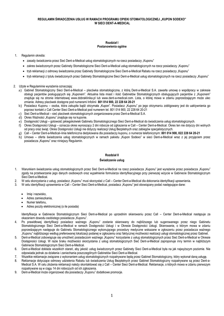 REGULAMIN ŚWIADCZENIA USŁUG W RAMACH PROGRAMU OPIEKI STOMATOLOGICZNEJ „KUPON SODEXO” W SIECI DENT-A-MEDICAL Rozdział I Postanowienia ogólne 1. Regulamin określa: zasady świadczenia przez Sieć Dent-a-Medical usług stomatologicznych na rzecz posiadaczy „Kuponu” zakres świadczonych przez Gabinety Stomatologiczne Sieci Dent-a-Medical usług stomatologicznych na rzecz posiadaczy „Kuponu” tryb reklamacji z odmowy świadczenia przez Gabinety Stomatologiczne Sieci Dent-a-Medical Rabatu na rzecz posiadaczy „Kuponu” tryb reklamacji z tytułu świadczonych przez Gabinety Stomatologiczne Sieci Dent-a-Medical usług stomatologicznych na rzecz posiadaczy „Kuponu” 2. Użyte w Regulaminie wyrażenia oznaczają: a) Gabinet Stomatologiczny Sieci Dent-a-Medical – placówka stomatologiczna, z którą Dent-a-Medical S.A. zawarła umowę o współpracy w zakresie obsługi pacjentów posługujących się „Kuponem”. Aktualna lista miast i ilość Gabinetów Stomatologicznych obsługujących pacjentów z „Kuponem” znajduje się na stronie internetowej www.dobraklinika.pl lub www.dent-a-medical.com. Lista, o której mowa w zdaniu poprzedzającym może ulec zmianie. Adresy placówek dostępne pod numerami Infolinii 801 014 900, 22 228 64 20-21 b) Posiadacz Kuponu – osoba, która zakupiła bądź otrzymała „Kupon”. Posiadacz „Kuponu” po jego otrzymaniu zobligowany jest do uaktywnienia go poprzez kontakt z Call Center Sieci Dent-a-Medical pod numerem tel. 801 014 900, 22 228 64 20-21 c) Sieć Dent-a-Medical – sieć placówek stomatologicznych zorganizowana przez Dent-a-Medical S.A. d) Okres Ważności „Kuponu” znajduje się na kuponie. e) Dostępność Usługi – gotowość jakiegokolwiek Gabinetu Stomatologicznego Sieci Dent-a-Medical do świadczenia usług stomatologicznych. f) Okres Dostępności Usługi – oznacza okres wynoszący 2 dni robocze od zgłoszenia w Call – Center Dent-a-Medical. Okres ten nie dotyczy dni wolnych od pracy oraz świąt. Okres Dostępności Usługi nie dotyczy realizacji Usług Bezpłatnych oraz zabiegów specjalistycznych. g) Call – Center Dent-a-Medical–linia telefoniczna dedykowana dla posiadaczy kuponu, o numerze telefonicznym: 801 014 900, 022 228 64 20-21 h) Umowa – oferta świadczenia usług stomatologicznych w ramach pakietu „Kupon Sodexo” w sieci Dent-a-Medical wraz z jej przyjęciem przez posiadacza „Kuponu” oraz niniejszy Regulamin. Rozdział II Świadczenie usług 1. 2. 3. Warunkiem świadczenia usług stomatologicznych przez Sieć Dent-a-Medical na rzecz posiadacza „Kuponu” jest wyrażenie przez posiadacza „Kuponu” zgody na przetwarzanie jego danych osobowych oraz wypełnienie formularza identyfikacyjnego przy pierwszej wizycie w Gabinecie Stomatologicznym Sieci Dent-a-Medical. W celu skorzystania z usług, posiadacz „Kuponu” musi skorzystać z Call – Center Dent-a-Medical dla dokonania identyfikacji uprawnienia. W celu identyfikacji uprawnienia w Call – Center Sieci Dent-a-Medical, posiadacz „Kuponu” jest obowiązany podać następujące dane: 4. 5. 6. 7. 8. 9. Imię i nazwisko, Adres zamieszkania, Numer telefonu, Adres poczty elektronicznej (o ile posiada) Identyfikacja w Gabinecie Stomatologicznym Sieci Dent-a-Medical po uprzednim skierowaniu przez Call – Center Dent-a-Medical następuje za okazaniem dowodu osobistego posiadacza „Kuponu”. Po prawidłowej identyfikacji posiadacz ważnego „Kuponu” zostanie skierowany do najbliższego lub sugerowanego przez niego Gabinetu Stomatologicznego Sieci Dent-a-Medical w ramach Dostępności Usługi i w Okresie Dostępności Usługi. Skierowanie, o którym mowa w zdaniu poprzedzającym następuje do Gabinetu Stomatologicznego wykonującego procedury medyczne wskazane w zgłoszeniu przez posiadacza ważnego „Kuponu” najbliższego według preferowanej lokalizacji podanej w zgłoszeniu oraz faktycznej możliwości realizacji usługi stomatologicznej przez Gabinet. Dent-a-Medical zobowiązuje się umożliwić posiadaczom ważnego „Kuponu” korzystanie z usług stomatologicznych przez Sieć Dent-a-Medical w Okresie Dostępności Usługi. W razie braku możliwości skorzystania z usług stomatologicznych Sieć Dent-a-Medical zaproponuje inny termin w najbliższym Gabinecie Stomatologicznym Sieci Dent-a-Medical. Dent-a-Medical dokłada wszelkich starań, aby jakość usług świadczonych przez Gabinety Sieci Dent-a-Medical była na jak najwyższym poziomie. Nie odpowiada jednak za działania i zaniechania poszczególnych Gabinetów Sieci Dent-a-Medical. Wszelkie reklamacje związane z wykonaniem usług stomatologicznych rozpatrywane będą przez Gabinet Stomatologiczny, który wykonał daną usługę. Reklamacje dotyczące odmowy udzielenia Rabatu lub świadczenia Usług Bezpłatnych przez Gabinet Stomatologiczny rozpatrywane są przez Dent-aMedical S.A. W celu złożenia reklamacji należy skontaktować się z Call – Center Sieci Dent-a-Medical. Reklamacje, o których mowa w zdaniu pierwszym rozpatrywane są w ciągu 14 dni roboczych od ich zgłoszenia. Dent-a-Medical może organizować dla posiadaczy „Kuponu” dodatkowe promocje. 1 Rozdział III Postanowienia Końcowe 1. 2. 3. 4. 5. Przed przyjęciem oferty posiadacz „Kuponu” jest zobowiązany zapoznać się z niniejszym Regulaminem. Aktywacja „Kuponu” za spośrednictwem CallCenter Sieci Dent-a-Medical jest równoznaczna z akceptacją regulaminu oraz wyrażeniem dobrowolnej zgody na przetwarzanie danych osobowych, w tym przekazywanie danych osobowych gabinetom sieci Dent-a-Medical, w związku ze świadczeniem przez Sieć Dent-a-Medical usług stomatologicznych na rzecz posiadaczy „Kuponu”, jak również w celach marketingowych przez Dent-a-Medical ul. Rynek 35/III piętro, 50-102 Wrocław, która jest również administratorem tych danych osobowych. Posiadacz „Kuponu” ma prawo wglądu i modyfikacji swoich danych osobowych. Przetwarzanie danych osobowych prze