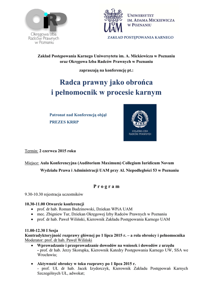 ZAKŁAD POSTĘPOWANIA KARNEGO Zakład Postępowania Karnego Uniwersytetu im. A. Mickiewicza w Poznaniu oraz Okręgowa Izba Radców Prawnych w Poznaniu zapraszają na konferencję pt.: Radca prawny jako obrońca i pełnomocnik w procesie karnym Patronat nad Konferencją objął PREZES KRRP Termin: 2 czerwca 2015 roku Miejsce: Aula Konferencyjna (Auditorium Maximum) Collegium Iuridicum Novum Wydziału Prawa i Administracji UAM przy Al. Niepodległości 53 w Poznaniu Program 9.30-10.30 rejestracja uczestników 10.30-11.00 Otwarcie konferencji prof. dr hab. Roman Budzinowski, Dziekan WPiA UAM mec. Zbigniew Tur, Dziekan Okręgowej Izby Radców Prawnych w Poznaniu prof. dr hab. Paweł Wiliński, Kierownik Zakładu Postępowania Karnego UAM 11.00-12.30 I Sesja Kontradyktoryjność rozprawy głównej po 1 lipca 2015 r. – a rola obrońcy i pełnomocnika Moderator: prof. dr hab. Paweł Wiliński Wprowadzanie i przeprowadzanie dowodów na wniosek i dowodów z urzędu - prof. dr hab. Jerzy Skorupka, Kierownik Katedry Postępowania Karnego UW, SSA we Wrocławiu; Aktywność obrońcy w toku rozprawy po 1 lipca 2015 r. - prof. UŁ dr hab. Jacek Izydorczyk, Kierownik Zakładu Postępowań Karnych Szczególnych UŁ, adwokat; Aktywność oskarżyciela publicznego w toku rozprawy po 1 lipca 2015 r. – PPA Marek Rote, Prokuratura Apelacyjna w Poznaniu; Komentarze (5 minut): SSO Maciej Świergosz; PPO Roman Szymanowski, Zastępca Prokuratora Okręgowego w Poznaniu; dr Barbara Janusz-Pohl, Zakład Postępowania Karnego UAM; mec. dr Piotr Binas WIA Poznań; dr Dorota Czura-Kalinowska OIRP Poznań, Dziekan WPiA WSPiA Poznań, radca prawny; Dyskusja 12.30-13.30 przerwa obiadowa 13.30-15.00 II Sesja Obrońca i pełnomocnik w trybach konsensualnych Moderator: prof. UAM dr hab. Robert Zawłocki Ocena przesłanek zastosowania trybów konsensualnych w procesie karnym po 1 lipca 2015 r. - SSA Henryk Komisarski, Prezes Sądu Okręgowego w Poznaniu; Prokurator a tryby konsensualne po 1 lipca 2015 r. - PPG Robert Hernand, Zastępca Prokuratora Generalnego; Obrońca a dobrowolne poddanie się karze po 1 lipca 2015 r. – prof. UAM dr hab. Anna Gerecka-Żołyńska, Zakład Postępowania Karnego UAM, SSR w Gnieźnie; Komentarz (5 minut): PPO Mariusz Orlicki, Z-ca Prokuratora Apelacyjnego w Poznaniu; dr Piotr Karlik, Zakład Postępowania Karnego UAM; radca prawny Tomasz Wierzowiecki OIRP w Poznaniu; mec. Adam Flaszewski ORA w Poznaniu; Dyskusja 15.00-15.30 przerwa 15.30-17.00 III Sesja Radca prawny jako obrońca – możliwość a przymus Moderator: prof. dr hab. Jerzy Skorupka Zmiany zakresu pomocy prawnej świadczonej przez radców prawnych z perspektywy ostatnich lat – prof. UMCS dr hab. Arkadiusz Bereza, Wiceprezes KRRP; Radca prawny jako obrońca w sprawach karnych - prof. UZ dr hab. Hanna Paluszkiewicz, Kierownik Katedry Prawa Karnego i Procesu Karnego UZ, Zakład Postępowania Karnego UAM, radca prawny; Rozszerzenie zakresu podmiotów uprawnionych do obrony w sprawach karnych a prawo do obrony - mec. Mariusz Paplaczyk WIA w Poznaniu, Prezes Zrzeszenia Prawników Polskich; Komentarz: radca prawny Zbigniew Tur, Dziekan OIRP w Poznaniu; SSR dr Olga Krajniak, Sąd Rejonowy w Obornikach; Dyskusja 17.00 Podsumowanie i zakończenie konferencji ****