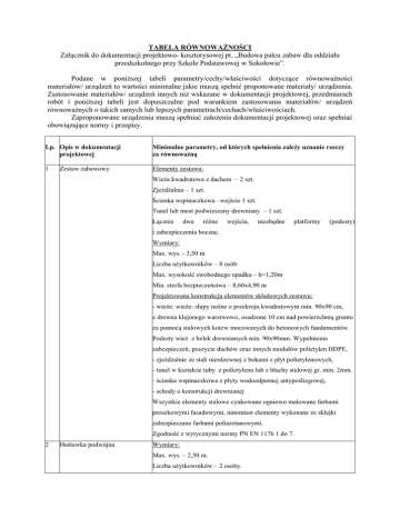 TABELA RÓWNOWAŻNOŚCI Załącznik do dokumentacji projektowo- kosztorysowej pt. „Budowa palcu zabaw dla oddziału przedszkolnego przy Szkole Podstawowej w Sokołowie”. Podane w poniższej tabeli parametry/cechy/właściwości dotyczące równoważności materiałów/ urządzeń to wartości minimalne jakie muszą spełnić proponowane materiały/ urządzenia. Zastosowanie materiałów/ urządzeń innych niż wskazane w dokumentacji projektowej, przedmiarach robót i poniższej tabeli jest dopuszczalne pod warunkiem zastosowania materiałów/ urządzeń równoważnych o takich samych lub lepszych parametrach/cechach/właściwościach. Zaproponowane urządzenia muszą spełniać założenia dokumentacji projektowej oraz spełniać obowiązujące normy i przepisy. Lp. Opis w dokumentacji projektowej Minimalne parametry, od których spełnienia zależy uznanie rzeczy za równoważną 1 Elementy zestawu: Zestaw zabawowy Wieża kwadratowa z dachem – 2 szt. Zjeżdżalnia – 1 szt. Ścianka wspinaczkowa –wejście 1 szt. Tunel lub most podwieszany drewniany – 1 szt. Łącznie dwa różne wejścia, niezbędne platformy (podesty) i zabezpieczenia boczne. Wymiary: Max. wys. - 3,50 m Liczba użytkowników – 8 osób Max. wysokość swobodnego upadku – h=1,20m Min. strefa bezpieczeństwa – 8,60x4,90 m Projektowana konstrukcja elementów składowych zestawu: - wieże: wieże: słupy nośne o przekroju kwadratowym min. 90x90 cm, z drewna klejonego warstwowo, osadzone 10 cm nad powierzchnią gruntu za pomocą stalowych kotew mocowanych do betonowych fundamentów. Podesty wież z belek drewnianych min. 90x90mm. Wypełnienie zabezpieczeń, poszycie dachów oraz innych modułów polietylen HDPE, - zjeżdżalnie ze stali nierdzewnej z bokami z płyt polietylenowych, - tunel w kształcie tuby z polietylenu lub z blachy stalowej gr. min. 2mm. - ścianka wspinaczkowa z płyty wodoodpornej antypoślizgowej, - schody o konstrukcji drewnianej Wszystkie elementy stalowe cynkowane ogniowo malowane farbami proszkowymi fasadowymi, natomiast elementy wykonane ze sklejki zabezpieczane farbami poliuretanowymi. Zgodność z wytycznymi normy PN EN 1176 1 do 7. 2 Huśtawka podwójna Wymiary: Max. wys. – 2,50 m. Liczba użytkowników – 2 osoby. Max. wysokość swobodnego upadku – h=1,40m Min. strefa bezpieczeństwa – 3,30x7,40 m. Grupa wiekowa 3-12 lat. Projektowana konstrukcja huśtawki: – słupki boczne z drewna klejonego trójwarstwowo malowanego lakierobejcą zaokrąglonego na krawędziach, o przekroju min. 80 x 80 mm, - belka górna z rury stalowej ocynkowanej i malowanej proszkowo, - łańcuchy stalowe nierdzewne - dwa siedziska: sztywne siedzisko w kształcie deseczki wykonane z aluminium oblanego gumą, drugie siedzisko w kształcie koszyka umożliwiającego korzystanie z huśtawki przez małe dzieci, elementy złączne wykonane ze stali nierdzewnej, wystające końcówki elementów złącznych zabezpieczone plastikowymi zaślepkami. 3 Bujak konik Zgodność z wytycznymi normy PN EN 1176 1 do 7. Wymiary: Max. wys. – 0,90 m. Liczba użytkowników – 1 osoba. Maksymalna wysokość swobodnego upadku – h= 0,50 m. Min. strefa bezpieczeństwa – 3,50 x 3,90 m. Grupa wiekowa 1-12 lat. Projektowana konstrukcja bujaka: – bujak w kształcie konika na sprężynie; korpus należy wykonać z płyty HDPE gr. min. 15mm, uchwyty ze stali, sprężyna z pręta min. Ø 20 siedzisko z płyty HDPE gr. min. 15mm. 4 Bujak roadster Wszystkie elementy stalowe cynkowane i malowane farbami proszkowymi fasadowymi Zgodność z wytycznymi normy PN EN 1176 1 do 7. Wymiary: Max. wys. – 0,90 m. Liczba użytkowników – 1 osoba. Maksymalna wysokość swobodnego upadku – h= 0,50 m. Min. strefa bezpieczeństwa – 3,50 x 3,90 m. Grupa wiekowa 1-12 lat. Materiały: – bujak w kształcie samochodu na sprężynie; korpus należy wykonać z płyty HDPE gr. min. 15mm, uchwyty ze stali, sprężyna z pręta min. Ø 20 siedzisko z płyty HDPE gr. min. 15mm. Wszystkie elementy stalowe cynkowane i malowane farbami proszkowymi fasadowymi. 5 Tablica informacyjna z regulaminem placu zabaw Zgodność z wytycznymi normy PN EN 1176 1 do 7. Wys. – min. 2,0 m Projektowana konstrukcja nóg: drewno klejone trójwarstwowo, malowane lakierobejcą zaokrąglonego na krawędziach, o przekroju min. 80 x 80 mm Tablica: spieniona płyta PCV lub sklejka wodoodpornej zabezpieczane farbami poliuretanowymi (min. wym. 900x500x10mm) Zaślepki: tworzywo sztuczne. Wszystkie elementy stalowe cynkowane i malowane farbami proszkowymi fasadowymi Zgodność z wytycznymi normy PN EN 1176 1 do 7.