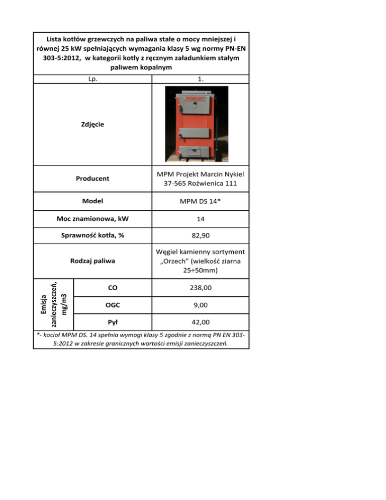Lista kotłów grzewczych na paliwa stałe o mocy mniejszej i równej 25 kW spełniających wymagania klasy 5 wg normy PN-EN 303-5:2012, w kategorii kotły z ręcznym załadunkiem stałym paliwem kopalnym Lp. 1. Zdjęcie MPM Projekt Marcin Nykiel 37-565 Roźwienica 111 Model MPM DS 14* Moc znamionowa, kW 14 Sprawność kotła, % 82,90 Rodzaj paliwa Węgiel kamienny sortyment „Orzech” (wielkość ziarna 25÷50mm) Emisja zanieczyszczeń, mg/m3 Producent CO 238,00 OGC 9,00 Pył 42,00 *- kocioł MPM DS. 14 spełnia wymogi klasy 5 zgodnie z normą PN EN 3035:2012 w zakresie granicznych wartości emisji zanieczyszczeń.