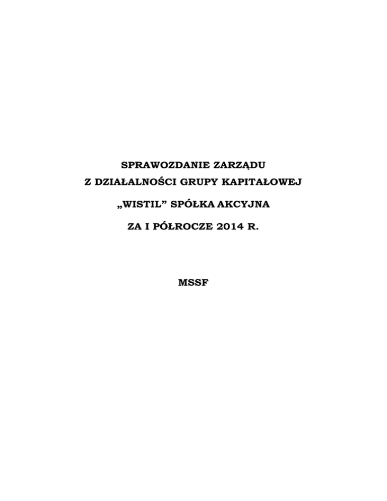 SPRAWOZDANIE ZARZĄDU Z DZIAŁALNOŚCI GRUPY KAPITAŁOWEJ „WISTIL” SPÓŁKA AKCYJNA ZA I PÓŁROCZE 2014 R. MSSF INFORMACJE OKREŚLONE W USTAWIE Z DNIA 29 WRZEŚNIA 1994 O RACHUNKOWOŚCI, ART. 55, OMÓWIENIE PODSTAWOWYCH WIELKOŚCI EKONOMICZNO-FINANSOWYCH ORAZ OPIS ISTOTNYCH CZYNNIKÓW RYZYKA I ZAGROŻEŃ NA JAKIE JEST NARAŻONA GRUPA KAPITAŁOWA (ROZPORZĄDZENIE MINISTRA FINANSÓW Z DNIA 19 LUTEGO 2009 R, DZ.U. NR 33 POZ. 259, PAR. 90, UST. 3) WSTĘP Półroczne sprawozdanie Zarządu z działalności Grupy Kapitałowej „Wistil” S.A. za I półrocze 2014r. zostało sporządzone zgodnie z wymogami Międzynarodowych Standardów Sprawozdawczości Finansowej, Międzynarodowych Standardów Rachunkowości oraz związanymi z nimi interpretacjami w formie rozporządzeń Komisji Europejskiej , a także Rozporządzeniem Ministra finansów z dnia. 19.02.2009r. w sprawie informacji bieżących i okresowych przekazywanych przez emitentów papierów wartościowych oraz warunków uznawania za równoważne informacji wymaganych przepisami prawa państwa niebędącego państwem członkowskim. Sprawozdanie przedstawia istotne wydarzenia mające znaczący wpływ na działalność Grupy Kapitałowej „WISTIL” S.A. w badanym okresie sprawozdawczym. Organy jednostki dominującej: Funkcję kierownika jednostki dominującej sprawuje Zarząd jednostki dominującej. Skład Zarządu Spółki Dominującej na dzień 30.06.2014r.: 1/ Mieczysław Kędzierski – Prezes Zarządu; 2/ Artur Poborski – Wiceprezes Zarządu. Skład Rady Nadzorczej na dzień 30.06.2014r. 1/Zenona Kwiecień - Przewodnicząca 2/Nina Surma 3/Jarosław Marczak 4/Marcin Hausman 5/Zbigniew Turlakiewicz 1. Zdarzenia istotnie wpływające na działalność Grupy Kapitałowej, jakie nastąpiły w I półroczu 2014, a także po jego zakończeniu, do dnia zatwierdzenia sprawozdania finansowego. W dniu 24 czerwca 2014r. odbyło się ZWZA emitenta , które zatwierdziło skonsolidowane sprawozdanie finansowe Grupy Kapitałowej „WISTIL” S.A. za 2013r. i sprawozdanie zarządu z działalności Grupy.( raport bieżący nr 8/2014). W dniu 30 maja 2014r. ZWZA jednostki zależnej od emitenta ZPS „Lubiana” S.A. z siedzibą w Łubianie podjęło uchwałę w sprawie podziału zysku za 2013r. Część zysku w kwocie 3.003,4 tys. zł przeznaczono na dywidendę dla akcjonariuszy, co stanowi 4,62 zł na jedną akcję. ZWZA ustaliło dwa terminy wypłaty dywidendy tj. 31 lipca 2014r. i 14 listopada 2014r. w równych ratach po 2,31 zł na jedną akcję. „Wistil” S.A. posiada na dzień 30 maja 2014r. 607.631 akcji „Lubiany” S.A. i w dniu 31 lipca 2014r. otrzymał I ratę dywidendy w wysokości 1.403.627,61 zł. Po dniu bilansowym nie wystąpiły żadne istotne zdarzenia , które powodowałyby konieczność zmian do wartości wykazanych w skonsolidowanym sprawozdaniu finansowym Emitenta. SPRZEDAŻ Grupa Kapitałowa „Wistil” S.A. I półrocze 2014r. zamknęła skonsolidowanym zyskiem netto na poziomie 4.595 tys. zł tj. wyższym ponad trzykrotnie w porównaniu do I półrocza 2013r. STRATEGIE ZARZĄDÓW SPÓŁEK GRUPY KAPITAŁOWEJ Strategia zarządów zakłada restrukturyzację spółek z Grupy. Plany na 2014 zakładają koncentrację na core biznesie poszczególnych spółek. Aktualny schemat graficzny spółek Grupy Kapitałowej emitenta przedstawiono w „Informacji dodatkowej „ do skonsolidowanego sprawozdania finansowego za I półrocze 2014r.” 2. Przewidywany rozwój grupy kapitałowej. Strategia na I półrocze 2014 będzie koncentrowała się na potencjale rynkowym biznesu porcelanowego opartego na pozycji rynkowej „Lubiana” S.A. Firma „Lubiana” S.A. wzmocniła swoją pozycję na rynkach eksportowych poprzez szereg działań marketingowych . Rola Wistil S.A. została ograniczona do zarządzania majątkiem finansowym Grupy Kapitałowej. 3. Ważniejsze osiągnięcia w dziedzinie badań i rozwoju W I półroczu 2014 w grupie kapitałowej nie prowadzono istotnej działalności badawczo-rozwojowej. 4. Aktualna i przewidywana sytuacja finansowa grupy kapitałowej. Sytuację finansową Grupy Kapitałowej „Wistil” S.A. w I półroczu 2014 uległa poprawie w stosunku do ubiegłego roku. Spółki grupy nie nabywały w analizowanym okresie akcji własnych, nie posiadają swoich oddziałów (zakładów), nie dysponują jakimikolwiek instrumentami finansowymi określonymi w art. 55 ust. 2 w związku z art. 49 „Ustawy o rachunkowości”, ust. 2, pkt 7. Omówienie podstawowych wielkości ekonomiczno-finansowych, ujawnionych w półrocznym sprawozdaniu finansowym W I półroczu 2014 Grupa Kapitałowa „WISTIL” S.A. osiągnęła przychody ze sprzedaży w wysokości 126.470 tys. zł. Zysk brutto na sprzedaży ukształtował się na poziomie 36.191 tys. zł. W analizowanym okresie Grupa uzyskała zysk netto w wysokości 4.595 tys. zł. Na zysk netto wpłynęły wyniki jednostek wchodzących w skład Grupy Kapitałowej: - jednostka dominująca (emitent) - 1.314,6 tys. zł; - Grupa kapitałowa „Lubiana „ S.A. – 3.564,5 tys. zł - F. F. i K „Haft” S.A. - /-/ 207,0 tys. zł; - korekty konsolidacyjne Poziomy wskaźników /-/ 77,1 tys. zł płynności finansowej ukształtowały się dla Grupy następująco : wskaźnik płynności bieżącej – 1,49, szybki wskaźnik płynności – 0,76. Osiągnięcie przez Grupę Kapitałową za I półrocze 2014r. zysku spowodowało, że wszystkie wskaźniki rentowności przyjmują wartość dodatnią. Wskaźniki dochodowe Grupy osiągnęły następujące wartości: stopa zwrotu z kapitału własnego (ROE) – 5,1%, stopa zwrotu z aktywów – (ROA) – 2,2% , wskaźnik rentowności sprzedaży (ROS) –3,63% , co oznacza , że z każdej złotówki sprzedaży osiągnięto w I półroczu 2014r. zysk w wysokości ca 4 groszy. Pomimo trudnego otoczenia rynkowego w jakim funkcjonuje Grupa WISTIL, zarządy firm wchodzących w skład grupy będą konsekwentne w działaniach na rzecz kontynuowania 