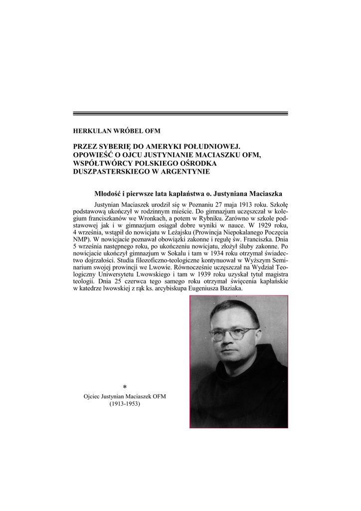 HERKULAN WRÓBEL OFM PRZEZ SYBERIĘ DO AMERYKI POŁUDNIOWEJ. OPOWIEŚĆ O OJCU JUSTYNIANIE MACIASZKU OFM, WSPÓŁTWÓRCY POLSKIEGO OŚRODKA DUSZPASTERSKIEGO W ARGENTYNIE Młodość i pierwsze lata kapłaństwa o. Justyniana Maciaszka Justynian Maciaszek urodził się w Poznaniu 27 maja 1913 roku. Szkołę podstawową ukończył w rodzinnym mieście. Do gimnazjum uczęszczał w kolegium franciszkanów we Wronkach, a potem w Rybniku. Zarówno w szkole podstawowej jak i w gimnazjum osiągał dobre wyniki w nauce. W 1929 roku, 4 września, wstąpił do nowicjatu w Leżajsku (Prowincja Niepokalanego Poczęcia NMP). W nowicjacie poznawał obowiązki zakonne i regułę św. Franciszka. Dnia 5 września następnego roku, po ukończeniu nowicjatu, złożył śluby zakonne. Po nowicjacie ukończył gimnazjum w Sokalu i tam w 1934 roku otrzymał świadectwo dojrzałości. Studia filozoficzno-teologiczne kontynuował w Wyższym Seminarium swojej prowincji we Lwowie. Równocześnie uczęszczał na Wydział Teologiczny Uniwersytetu Lwowskiego i tam w 1939 roku uzyskał tytuł magistra teologii. Dnia 25 czerwca tego samego roku otrzymał święcenia kapłańskie w katedrze lwowskiej z rąk ks. arcybiskupa Eugeniusza Baziaka. * Ojciec Justynian Maciaszek OFM (1913-1953) HERKULAN WRÓBEL OFM 44 Po święceniach kapłańskich przełożeni skierowali go do pracy w klasztorze w Zbarażu. Dnia 17 września 1939 roku wkroczyły do tego miasta pierwsze oddziały armii sowieckiej. Nastąpiły aresztowania ludności polskiej i pierwsze zsyłki w głąb Związku Radzieckiego. Ojciec Justynian zaangażował się w pracę konspiracyjną w szeregach Polaków walczących o niepodległą Ojczyznę. Uczył religii w kościele, gdy została ona usunięta ze szkół. Zbierał po domach dary dla uchodźców. Pomagał mu w tym o. Łucjan Łuszczki, który z początkiem wojny przybył do Zbaraża. Odtąd obaj dzielili wspólną dolę. Los ich rozłączył dopiero, gdy opuścili Związek Radziecki i znaleźli się na wolności. Ojciec Łucjan był jedynym z naocznych nielicznych świadków gehenny, którą przeżył o. Justynian w latach 1940-1942. Dnia 14 października NKWD wpadło do klasztoru w Zbarażu aresztując o. Justyniana, a następnie w dwa tygodnie później o. Łucjana. Osadzono ich w więzieniu w Tarnopolu, gdzie czekali na rozprawę. Podczas procesu sędzia śledczy doradzał o. Justynianowi, aby przyznał się do winy. „Przyznaj się do winy, a ocalisz swoje życie. Sąd weźmie pod uwagę twój młody wiek i mniejszą karę wymierzy”. „Byłem Polakiem i kapłanem – odpowiedział o. Justynian – uczyłem dzieci modlić się po polsku”. Prokurator domagał się najwyższego wyroku kary. Zarzucał o. Justynianowi – znany zarzut – że jest wrogiem ludu pracującego. Adwokat obrońca wystąpił nieśmiało w obronie o. Justyniana. Właściwie to potwierdził oskarżenie. „Jedynie tłumaczy oskarżonego – dodał – młody wiek i niedoświadczenie”. „Jestem niewinny” powiedział o. Justynian i to były jego ostatnie słowa na procesie. Sąd skazał jego i o. Łucjana na 10 lat poprawczych obozów pracy w Rosji sowieckiej. Zsyłka na Kołymę Z więzienia w Tarnopolu o. Justynian został przewieziony w marcu 1941 roku do Charkowa, gdzie przebywał jeden miesiąc. Ostatnią stacją był port więzienny Buchata Nachodka koło Władywostoku. Po kilku dniach 8 tysięcy więźniów załadowano na okręt. Wśród nich był i o. Maciaszek. Okręt płynąc przez Morze Japońskie i Ochockie zawinął do portu Magadan na Kołymie. Straszne słowo – Kołyma – było na ustach wszystkich więźniów. Ciężkie warunki pracy i słabe zdrowie o. Maciaszka doprowadziły do tego, że już po kilku miesiącach, zmienił się nie do poznania. Wyglądał na starego człowieka, chociaż miał dopiero 28 lat. Dlatego wszyscy więźniowie nazywali go „staryk”. Więźniowie polscy wiedzieli, że o. Justynian był księdzem. To dla nich w ukryciu odprawiał Mszę św. i spowiadał. W jakiś czas po przybyciu do obozu pracy o. Justynian spuchł całkowicie. Nie mógł chodzić. W dodatku jeden z sowietów zbił mu okulary, przy pomocy których zapalał papierosy. Został odesłany do szpitala. Po wyjściu ze szpitala skierowano go do pomocy w kuchni. Warunki egzystencji były bardzo ciężkie, wręcz nieludzkie. Z Kołymy nikt nie wychodził na wolność. Ginęli tam ludzie z wyczerpania, z głodu, z nędzy. Tylko modlitwa i silna wiara w Bożą Opatrzność sprawiły, że o. Justynian przeżył Kołymę. Pewnego dnia jeden z dozorców odezwał się do o. Justyniana. – „Maciaszek! Wnet zostaniesz zwolniony” „Co? Rozstrzelają mnie?” – Zapytał o. Justynian. „Nie mów głupstw. Nasz rząd podpisał umowę z waszym rządem w Londynie”. Wówczas o. Justynian wrócił do namiotu i tam dziękował Bogu za nie- Przez Syberię do Ameryki Południowej... 45 bywały cud. Władze więzienne nie udzielały żadnych informacji co do porozumienia Sikorski-Majski. Pewnego dnia załadowano Polaków na samochody i wywieziono do portu w Magadanie. Z dziesięciu tysięcy Polaków będących w obozach na Kołymie, przeżyło zaledwie około 500 osób. W porcie Polacy oczekiwali na okręt. Dnia 22 października 1941 roku odpłynęli do Władywostoku. Stamtąd udali się na południeZSRR, gdzie tworzyła się Armia Polska, do której o. Justynian został przyjęty jako kapelan wojskowy i wyznaczony do duszpasterstwa ludności cywilnej. Praca duszpasterska w Uzbekistanie Dnia 9 grudnia 1941 roku o. Justynian przybył do Kaganu w Uzbekistanie. Wzruszająca była Pasterka poprzedzająca Boże Narodzenie, w której uczestniczyło wielu Polaków. W niedziele odprawiał Mszę św., w której brała udział także miejscowa ludność W lutym 1942 roku zachorował na tyfus. Z wielkim trudem dostał się do szpitala, gdzie przebywał przez miesiąc. Po wyjściu został mianowany kapelanem w Bucharze, gdzie były rodziny w
