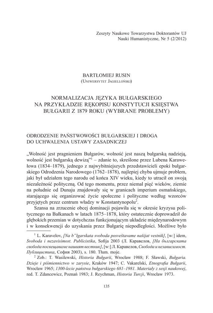 Zeszyty Naukowe Towarzystwa Doktorantów UJ Nauki Humanistyczne, Nr 5 (2/2012) Bartłomiej Rusin (Uniwersytet Jagielloński) Normalizacja języka bułgarskiego na przykładzie rękopisu konstytucji Księstwa Bułgarii z 1879 roku (wybrane problemy) Odrodzenie państwowości bułgarskiej i droga do uchwalenia ustawy zasadniczej „Wolność jest pragnieniem Bułgarów, wolność jest naszą bułgarską nadzieją, wolność jest bułgarską dewizą”1 – zdanie to, skreślone przez Lubena Karawełowa (1834–1879), jednego z najwybitniejszych przedstawicieli epoki bułgarskiego Odrodzenia Narodowego (1762–1878), najlepiej chyba ujmuje problem, jaki był udziałem tego narodu od końca XIV wieku, kiedy to utracił on swoją niezależność polityczną. Od tego momentu, przez niemal pięć wieków, ziemie na południe od Dunaju znajdowały się w granicach imperium osmańskiego, starającego się organizować życie społeczne i polityczne według wzorców przyjętych przez centrum władzy w Konstantynopolu2. Szansa na zrzucenie obcej dominacji pojawiła się w okresie kryzysu politycznego na Bałkanach w latach 1875–1878, który ostatecznie doprowadził do głębokich przemian w dotychczas funkcjonującym układzie międzynarodowym i w konsekwencji do uzyskania przez Bułgarię niepodległości. Możliwe było L. Karavelov, [Na b”lgarskata svoboda posveštavame našijat vestnik], [w:] idem, Svoboda i nezavisimost. Publicistika, Sofija 2003 (Л. Каравелов, [На българската свобода посвещаваме нашият вестник], [w:] Л. Каравелов, Свобода и независимост. Публицистика, София 2003), s. 180. Tłum. moje. 2 Zob.: T. Wasilewski, Historia Bułgarii, Wrocław 1988; F. Sławski, Bułgaria. Dzieje i piśmiennictwo w zarysie, Kraków 1947; C. Vakarelski, Etnografia Bułgarii, Wrocław 1965; 1300-lecie państwa bułgarskiego 681–1981. Materiały z sesji naukowej, red. T. Zdancewicz, Poznań 1983; J. Reychman, Historia Turcji, Wrocław 1973. 1 135 Bartłomiej Rusin to z jednej strony dzięki postępującej destabilizacji państwa osmańskiego, z drugiej zaś zadecydowała o tym klęska Porty w wojnie z Rosją (1877–1878), wspieraną przez ochotnicze oddziały bułgarskie. W tym momencie najważniejsze stało się uchwalenie nowej konstytucji3. W przygotowaniu wstępnego projektu ustawy zasadniczej walny udział wzięli także przedstawiciele Rosji. Pierwszą wersję tak zwanej Ustawy Organicznej opracował książę Aleksander Dondukow-Korsakow, komisarz rosyjski w Bułgarii, posiłkujący się w swojej pracy z jednej strony opinią reprezentantów elit bułgarskich, z drugiej zaś dotychczasowym dorobkiem konstytucyjnym państw bałkańskich – przede wszystkim konstytucją rumuńską z 1866 i serbską z 1869 roku4. Jego propozycja trafiła do Petersburga, gdzie przyjrzeli się jej urzędnicy Ministerstwa Spraw Zagranicznych oraz Ministerstwa Wojny. Wprowadzone tutaj poprawki ustanawiały przede wszystkim pewne dodatkowe zabezpieczenia o charakterze demokratycznym, między innymi ograniczając możliwości monarchy w sferze zmian lub usunięcia praw, jakie przysługiwały obywatelom5. Zachowanie Rosji stanowiło pewnego rodzaju fenomen, doszło tutaj bowiem do sytuacji, w której państwo oparte na samodzierżawiu, nieposiadające własnej ustawy zasadniczej, promuje uregulowania o charakterze demokratycznym w konstytucji innego państwa. Działania administracji carskiej miały jednak swoje uzasadnienie, a wyrażały się one w dążeniu do zdobycia jak największych wpływów w odrodzonym Księstwie. Tekst projektu przetłumaczono na bułgarski, czego dokonał profesor Marin Drinow, Bułgar wiele lat mieszkający w Rosji6. Zob.: P. Wandycz, Pax Europea. Dzieje systemów międzynarodowych w Europie 1815–1914, Kraków 2003; M. Tanty, Konflikty bałkańskie w latach 1878–1918, Warszawa 1968; M. Tanty, Bosfor i Dardanele w polityce mocarstw, Warszawa 1982; B. Brodecki, Szypka i Plewna 1877, Warszawa 1986; J. Reychman, Dzieje Turcji. Od końca XVIII wieku, Warszawa 1970; B. Rusin, Polityka Rosji na Bałkanach a udział Bułgarów w wojnach rosyjsko-tureckich w XIX wieku, [w:] Ślady obcego panowania w języku, kulturze i świadomości narodów południowosłowiańskich, red. R. Sendek, Kraków 2011, s. 103–115. 4 I. V. Kozmenko, Ruskata diplomacija i formiraneto na b”lgarskata d”ržavnost sled osvoboždenieto, Sofija 1982 (И.В. Козменко, Руската дипломация и формирането на българската държавност след освобождението, София 1982), s. 73–83; S. Rajčevski, T”rnovskata konstitucija 1879. B”lgarija se zavr”šta v Evropa, Sofija 2009 (С. Райчевски, Търновската конституция 1879. България се завръща в Европа, София 2009), s. 16–20. 5 I. V. Kozmenko (И.В. Козменко), op. cit., s. 84–95. 6 C. Black, Ustanovjavaneto na konstitucionno upravlenie v B”lgarija, Sofija 1996 (С. Блек, Установяването на конституционно управление в България, София 1996), s. 67–68. Marin Drinow był profesorem na uniwersytecie w Charkowie. Po wy3 136 Normalizacja języka bułgarskiego... Obrady bułgarskiego Zgromadzenia Ustawodawczego toczyły się od lutego do kwietnia 1879 roku w Tyrnowie7 i zakończyły się uchwaleniem nowej, pierwszej w Bułgarii, ustawy zasadniczej w dniu 16 kwietnia 1879 roku. Od nazwy miejsca obrad często nazywa się ją konstytucją tyrnowską8. Dokument ten wprowadzał kraj na zupełnie nową drogę cywilizacyjną, ucieleśniając szereg rozwiązań o charakterze demokratycznym, wyrażających się przede wszystkim w szerokim katalogu praw i wolności obywatelskich, dotychczas prawie nieznanych wśród ludności. Niektórzy posuwają się nawet do stwierdzenia, że konst
