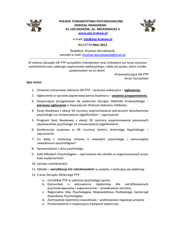 POLSKIE TOWARZYSTWO PSYCHOLOGICZNE ODDZIAŁ KRAKOWSKI 31-120 KRAKÓW, AL. MICKIEWICZA 3 www.ptp.krakow.pl e-mail: [email protected] BIULETYN MAJ 2012 Redaktor: Krystian Barzykowski kontakt e-mail: [email protected] W imieniu Zarządu OK PTP wszystkim Członkiniom oraz Członkom już teraz życzymy wytchnienia oraz udanego wypoczynku wakacyjnego z dala od spraw, które trzeba podejmować na co dzień. Przewodnicząca OK PTP Anna Turczyńska Spis treści: 1. Ostatnie czerwcowe zebranie OK PTP – przerwa wakacyjna – ogłoszenie. 2. Ogłoszenie w sprawie papierowej wersji biuletynu – ostatnie przypomnienie. 3. Rozpoczęcie przygotowań do wyborów Zarządu Oddziału Krakowskiego – pierwsze ogłoszenie o Zwyczajnym Walnym Zebraniu Oddziału. 4. Sesja Naukowa z okazji 50 rocznicy wypromowania pierwszych absolwentów psychologii na Uniwersytecie Jagiellońskim – zaproszenie. 5. Program Sesji Naukowej z okazji 50 rocznicy wypromowania pierwszych absolwentów psychologii na Uniwersytecie Jagiellońskim. 6. Konferencja naukowa w 40 rocznicę śmierci Antoniego Kępińskiego – zaproszenie. 7. Co dalej z realizacją Ustawy o zawodzie psychologa i samorządzie zawodowym psychologów? 8. Sprawozdanie z dnia psychologa. 9. Koło Młodych Psychologów – zaproszenie do udziału w organizowanych przez koło wydarzeniach. 10. Sprawy członkowskie. 11. Składki – weryfikacja list członkowskich w związku z kończącą się kadencją. 12. Z prac Zarządu Głównego PTP: a. Certyfikat PTP w zakresie psychologii sportu. b. Komunikat o odnowieniu dyplomów dla certyfikowanych psychoterapeutów i superwizorów – przedłużenie terminu. c. Regionalna Izba Psychologów Województwa Podlaskiego Samorząd Zawodowy Psychologów. d. Zachowanie tajemnicy zawodowej – podstawowe regulacje prawne. e. Postanowienie o rozpoczęciu kampanii wyborczej. 1. OSTATNIE CZERWCOWE ZEBRANIE OK PTP – PRZERWA WAKACYJNA – OGŁOSZENIE. Ostatnie przedwakacyjne zebranie Zarządu Oddziału Krakowskiego PTP odbędzie się 11 czerwca 2012 roku. Zebranie odbędzie się o godz. 18.00 w Instytucie Psychologii UJ (Al. Mickiewicza 3) w sali nr 6 (parter). Zainteresowanych serdecznie zapraszamy. Informujemy również o przerwie wakacyjnej (lipiec, sierpień) w pracy Zarządu OK PTP (także sekretarza ds. członkowskich i skarbniczki). Pierwsze, powakacyjne, zebranie Zarządu OK PTP odbędzie się 10 września 2012 roku. Zachęcamy do kontaktu mailowego oraz odwiedzania naszej strony internetowej, na której staramy się na bieżąco informować o ewentualnych zmianach. Zarząd Oddziału Krakowskiego PTP 2. OGŁOSZENIE W SPRAWIE PAPIEROWEJ WERSJI BIULETYNU OSTATNIE PRZYPOMNIENIE W trosce o środowisko naturalne oraz fakt, iż papierowa wersja wysyłana jest pod nie zawsze aktualny adres, zwracamy się z prośbą o zgłoszenie chęci dalszego otrzymywania papierowej wersji biuletynu. Zgłoszenia proszę przesyłać mailem na adres sekretarza ds. członkowskich Magdaleny Niteckiej lub pocztą na adres: Zarząd Oddziału Krakowskiego PTP, al. Mickiewicza 3, 31-120 Kraków. Brak zgłoszenia prowadzić papierowej wersji biuletynu. będzie do wstrzymania otrzymywania Kolejne wydanie Biuletynu zostanie rozesłane pocztą tradycyjną tylko do osób, które już potwierdziły (lub jeszcze potwierdzą) dalszą chęć otrzymywania drukowanej wersji. Nikomu z nas nie jest obojętne środowisko naturalne, dlatego gorąco zachęcamy do rezygnacji z papierowej wersji biuletynu na rzecz elektronicznego wydania (szczegółowe informacje na ten temat w punkcie 10). Krystian Barzykowski Redaktor wydania majowego 3. ROZPOCZĘCIE PRZYGOTOWAŃ DO WYBORÓW ZARZĄDU ODDZIAŁU KRAKOWSKIEGO – OGŁOSZENIE O ZWYCZAJNYM WALNYM ZEBRANIU ODDZIAŁU W związku z kończącą się kadencją obecnego Zarządu Oddziału Krakowskiego niniejszym ogłasza się rozpoczęcie kampanii wyborczej. Dzień Zwyczajnego na 15 października 2012 roku. Walnego Zebrania Oddziału wyznacza się Zgodnie z artykułem 47 pkt.1 statutu Towarzystwa, dokładny czas i miejsce zostaną ogłoszone na stronie internetowej Oddziału Krakowskiego PTP najpóźniej 24 września 2012 roku, to jest na 21 dni przed wyznaczonym terminem. Kandydatury na przewodniczącą/przewodniczącego Oddziału Krakowskiego można przesyłać na adres stacjonarny Zarządu z dopiskiem „Wybory” lub na adres e-mailowy (dane kontaktowe: nagłówek pierwszej strony). Do zgłoszeń prosimy dołączać oświadczenia kandydatek lub kandydatów o wyrażeniu zgody na kandydowanie. Informujemy, iż kandydatki lub kandydaci mają możliwość zaprezentowania swojego programu wyborczego, zarówno na stronie internetowej Oddziału Krakowskiego PTP, jak również bezpośrednio podczas Zwyczajnego Walnego Zebrania Oddziału. Już teraz zachęcamy do zgłaszania kandydatur wraz z programem. Umożliwi to obecnemu Zarządowi Oddziału przekazanie tego typu informacji członkiniom oraz członkom Oddziału Krakowskiego jeszcze przed właściwymi Wyborami. Tym samym pozwoli to każdemu z Państwa podjąć decyzję o sposobie wykorzystania swojego prawa do głosu. Przypominamy, iż do wyborów może stanąć każda osoba będąca członkiniom/członkiem zwyczajnym Oddziału Krakowskiego. Jednocześnie, podczas Zebrania Walnego odbędą się wybory do Zarządu Oddziału Krakowskiego oraz wybory Delegatek i Delegatów na Walne Zgromadzenie Delegatów. Apelujemy do wszystkich osób, którym bliski jest los społeczności psychologów krakowskich do aktywnego zaangażowania się w zbliżające się Walne Zebranie zarówno w roli czynnych wyborców, jak również kandydatek/kandydatów do władz Oddziału. Zarząd wybierany jest raz na trzy lata. Jest to jedno z najważniejszych wydarzeń, które całkowicie determinuje sposób realizacji przez Oddział różnorodnych zadań, kluczowych dla krakowskiego środowiska psychologicznego. Spośród obszarów działalności Zarządu wymienić można między innymi: tworzenie standardów w