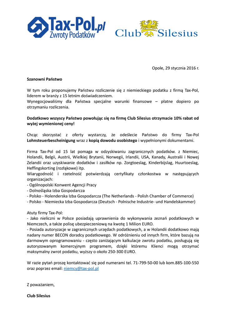Opole, 29 stycznia 2016 r. Szanowni Państwo W tym
