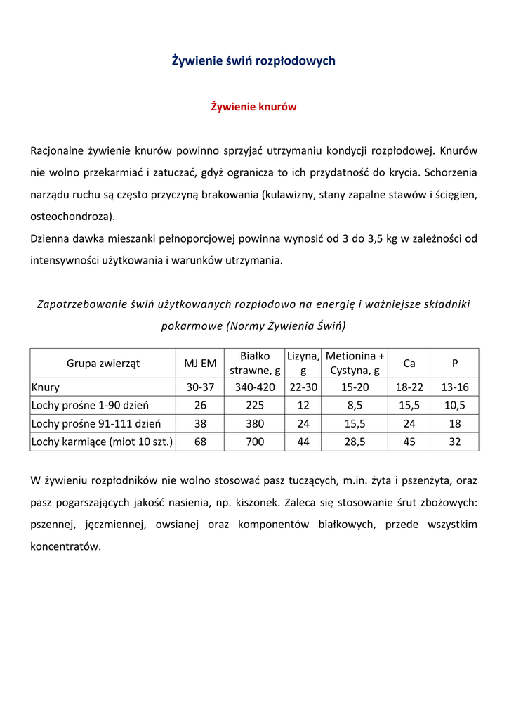 Żywienie świń rozpłodowych Żywienie knurów Racjonalne żywienie knurów powinno sprzyjać utrzymaniu kondycji rozpłodowej. Knurów nie wolno przekarmiać i zatuczać, gdyż ogranicza to ich przydatność do krycia. Schorzenia narządu ruchu są często przyczyną brakowania (kulawizny, stany zapalne stawów i ścięgien, osteochondroza). Dzienna dawka mieszanki pełnoporcjowej powinna wynosić od 3 do 3,5 kg w zależności od intensywności użytkowania i warunków utrzymania. Zapotrzebowanie świń użytkowanych rozpłodowo na energię i ważniejsze składniki pokarmowe (Normy Żywienia Świń) Grupa zwierząt Knury MJ EM 30-37 Białko Lizyna, Metionina + Ca strawne, g g Cystyna, g 340-420 22-30 15-20 18-22 P 13-16 Lochy prośne 1-90 dzień 26 225 12 8,5 15,5 10,5 Lochy prośne 91-111 dzień 38 380 24 15,5 24 18 Lochy karmiące (miot 10 szt.) 68 700 44 28,5 45 32 W żywieniu rozpłodników nie wolno stosować pasz tuczących, m.in. żyta i pszenżyta, oraz pasz pogarszających jakość nasienia, np. kiszonek. Zaleca się stosowanie śrut zbożowych: pszennej, jęczmiennej, owsianej oraz komponentów białkowych, przede wszystkim koncentratów. Przykładowe mieszanki pełnoporcjowe dla świń użytkowanych rozpłodowo (% udziału pasz) Składnik Koncentrat białkowy Śruta poekstrakcyjna sojowa Śruta jęczmienna Śruta pszenna Śruta żytnia Śruta pszenżytnia Śruta owsiana Otręby pszenne Susz z lucerny Kreda pastewna MJ EM/kg g białka str./1 MJ EM Knury 7,5 7,5 Lochy nisko prośne 7,5 7,5 7,5 Mieszaka uzupełniająca 7,5 7,5 7,5 12,5 4,0 4,0 4,0 15,0 42,0 42,0 42,0 42,0 30,0 - 26,0 - 20,0 26,0 _ 19,5 19,5 25,5 19,5 31,0 20,0 _ 20,0 1,0 1,0 1,0 1,0 12,0 11,8 11,6 11,9 9,4 10,4 10,1 10,3 1,5 11,5 13,7 10,0 10,0 41,5 41,5 42,0 46,0 - 20,0 30,0 _ 40,0 30,0 19,5 25,5 - 10,0 1,0 1,0 1,0 1,0 11,7 11,3 11,9 11,6 11,2 11,6 9,4 9,3 Lochy wysoko prośne Wartościowymi składnikami mieszanek dla knurów są susze z zielonek oraz dodatki mineralne, tzw. premiksy, zawierające w swoim składzie dostosowany do potrzeb zestaw składników mineralnych i witamin. W żywieniu knurów można stosować dodatki zawierające: selen, cynk i aminokwasy siarkowe. Mają one korzystny wpływ na jakość nasienia i stan racic. Żywienie loch Żywienie loch w cyklu produkcyjnym Wskutek doskonalenia cech rzeźnych u świń obniżono udział tłuszczu w ciele, zwiększając przy tym udział tkanki mięśniowej. Towarzyszą temu niekorzystne zjawiska: • pogorszenie kondycji w czasie użytkowania rozpłodowego loch, szczególnie przy dłuższej, trwającej ponad 5 tygodni, laktacji, • zaburzenia w rozrodzie, np. brak rui, cicha ruja, niska płodność. Żywienie jest bardzo ważnym elementem użytkowania rozpłodowego loch. W kolejnych okresach cyklu rozrodczego żywienie powinno być zróżnicowane. W cyklu produkcyjnym loch możemy wyróżnić: okres ciąży niskiej (1-90 dzień), okres ciąży wysokiej (91-110 dzień), okres okołoporodowy, 3-4 dni przed porodem (111-114 dzień ciąży) dzień porodu 4-6 dni po porodzie (1-6 dzień laktacji) laktację, zasuszanie, okres od odsadzenia do wystąpienia rui i krycia. Prawidłowe żywienie loch sprzyja dobrym wynikom w rozrodzie. U samic luźnych i ciężarnych żywionych w sposób ograniczony, przy wypełnieniu przewodu pokarmowego w 40-60%, problemem jest uczucie braku sytości. Stres żywieniowy powoduje dużą aktywność ruchową samic i ich agresywność. Zapewnienie zwierzętom sytości jest możliwe przez podawanie pasz wypełniających lub stosowanie do woli mieszanek o dużej zawartości włókna. Rolę balastu spełnia słoma, suche niemelasowane wysłodki buraczane (pęcznieją w przewodzie pokarmowym, zwiększając swoją objętość 4-4,5 krotnie), wysłodki prasowane zawierające 22% s.m., a także susz z zielonek, a latem zielonka. W poszczególnych okresach cyklu reprodukcyjnego żywienie samic podlega dużym zmianom i odpowiada ich aktywności produkcyjnej. W początkowym okresie ciąży (1-90 dzień) powinno być skąpe, w fazie wysokiej prośności (91 -110 dzień ciąży) - umiarkowane, a w fazie karmienia obfite - „do woli". Tak zróżnicowana intensywność żywienia sprzyja osiąganiu właściwej kondycji loch w cyklu reprodukcyjnym. Locha w ciąży niskiej powinna otrzymywać 2-2,5 kg mieszanki pełnoporcjowej dziennie. Skąpe, ale w pełni wartościowe żywienie samic w pierwszej fazie ciąży zwiększa przeżywalność rozwijających się zarodków i płodów, skutecznie zapobiega zatuczeniu, ułatwia poród, zwiększa apetyt w czasie laktacji. W ciąży wysokiej locha powinna zjadać około 3- -3,5 kg paszy dziennie. Wyższy poziom żywienia sprzyja zwiększaniu masy płodów, które w tym okresie intensywnie rosną. Dzięki takiemu postępowaniu żywieniowemu locha może urodzić prosięta o optymalnej, wyrównanej masie. Umiejętne żywienie loch ciężarnych prowadzi do zmniejszenia zużycia paszy. Takie żywienie loch utrzymywanych indywidualnie lub grupowo nie jest obecnie trudne technicznie, ale też nie zapewnia uzyskania uczucia sytości. Dobrostan i ograniczenie stresu żywieniowego można uzyskać ścieląc w kojcu słomę. Jest ona pobierana przez lochy, stwarzając uczucie sytości. W warunkach utrzymania grupowego, chcąc ograniczyć zjawisko objadania loch słabszych przez silniejsze można wprowadzić dodatki innych pasz balastowych, np. suszu z zielonek, siana pociętego na sieczkę, kiszonki z kukurydzy zimą lub zielonek latem. Z uwagi na skracanie okresu odchowu prosiąt przy lochach z 6. do 5. lub 4. tygodni oraz intensywne użytkowanie samic, można w okresie ciąży wysokiej wprowadzić zmianę stosunku energetyczno-białkowego podawanej paszy. Oznacza to zastosowanie w tym okresie mieszanek o większej zawartości składników pokarmowych, przede wszystkim białka. Mogą to być mieszanki przeznaczone dla loch karmiących. W okresie okołoporodowym (3-4 dni przed i do 4-6 dnia po porodzie) istnieje potrz