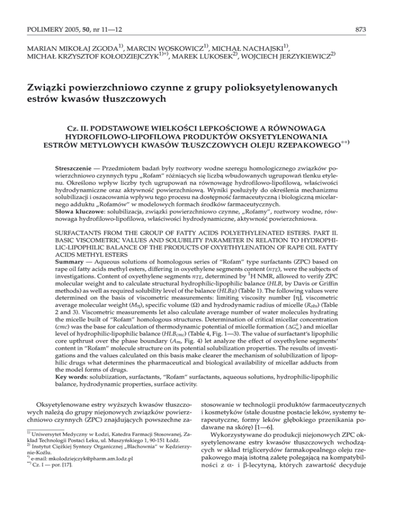 POLIMERY 2005, 50, nr 11—12 873 MARIAN MIKO£AJ ZGODA1), MARCIN WOSKOWICZ1), MICHA£ NACHAJSKI1), MICHA£ KRZYSZTOF KO£ODZIEJCZYK1)∗), MAREK LUKOSEK2), WOJCIECH JERZYKIEWICZ2) Zwi¹zki powierzchniowo czynne z grupy polioksyetylenowanych estrów kwasów t³uszczowych Cz. II. PODSTAWOWE WIELKOŒCI LEPKOŒCIOWE A RÓWNOWAGA HYDROFILOWO-LIPOFILOWA PRODUKTÓW OKSYETYLENOWANIA ESTRÓW METYLOWYCH KWASÓW T£USZCZOWYCH OLEJU RZEPAKOWEGO∗∗) Streszczenie — Przedmiotem badañ by³y roztwory wodne szeregu homologicznego zwi¹zków powierzchniowo czynnych typu „Rofam” ró¿ni¹cych siê liczb¹ wbudowanych ugrupowañ tlenku etylenu. Okreœlono wp³yw liczby tych ugrupowañ na równowagê hydrofilowo-lipofilow¹, w³aœciwoœci hydrodynamiczne oraz aktywnoœæ powierzchniow¹. Wyniki pos³u¿y³y do okreœlenia mechanizmu solubilizacji i oszacowania wp³ywu tego procesu na dostêpnoœæ farmaceutyczn¹ i biologiczn¹ micelarnego adduktu „Rofamów” w modelowych formach œrodków farmaceutycznych. S³owa kluczowe: solubilizacja, zwi¹zki powierzchniowo czynne, „Rofamy”, roztwory wodne, równowaga hydrofilowo-lipofilowa, w³aœciwoœci hydrodynamiczne, aktywnoœæ powierzchniowa. SURFACTANTS FROM THE GROUP OF FATTY ACIDS POLYETHYLENATED ESTERS. PART II. BASIC VISCOMETRIC VALUES AND SOLUBILITY PARAMETER IN RELATION TO HYDROPHILIC-LIPOPHILIC BALANCE OF THE PRODUCTS OF OXYETHYLENATION OF RAPE OIL FATTY ACIDS METHYL ESTERS Summary — Aqueous solutions of homologous series of “Rofam” type surfactants (ZPC) based on rape oil fatty acids methyl esters, differing in oxyethylene segments content (nTE), were the subjects of investigations. Content of oxyethylene segments nTE, determined by 1H NMR, allowed to verify ZPC molecular weight and to calculate structural hydrophilic-lipophilic balance (HLB, by Davis or Griffin methods) as well as required solubility level of the balance (HLBR) (Table 1). The following values were determined on the basis of viscometric measurements: limiting viscosity number [η], viscometric average molecular weight (Mη), specific volume (Ω) and hydrodynamic radius of micelle (Robs) (Table 2 and 3). Viscometric measurements let also calculate average number of water molecules hydrating the micelle built of “Rofam” homologous structures. Determination of critical micellar concentration (cmc) was the base for calculation of thermodynamic potential of micelle formation ( ∆Gm0 ) and micellar level of hydrophilic-lipophilic balance (HLBcmc) (Table 4, Fig. 1—3). The value of surfactant‘s lipophilic core upthrust over the phase boundary (Am, Fig. 4) let analyze the effect of oxyethylene segments‘ content in “Rofam” molecule structure on its potential solubilization properties. The results of investigations and the values calculated on this basis make clearer the mechanism of solubilization of lipophilic drugs what determines the pharmaceutical and biological availability of micellar adducts from the model forms of drugs. Key words: solubiization, surfactants, “Rofam” surfactants, aqueous solutions, hydrophilic-lipophilic balance, hydrodynamic properties, surface activity. Oksyetylenowane estry wy¿szych kwasów t³uszczowych nale¿¹ do grupy niejonowych zwi¹zków powierzchniowo czynnych (ZPC) znajduj¹cych powszechne za1) Uniwersytet Medyczny w £odzi, Katedra Farmacji Stosowanej, Zak³ad Technologii Postaci Leku, ul. Muszyñskiego 1, 90-151 £ódŸ. 2) Instytut Ciê¿kiej Syntezy Organicznej „Blachownia” w Kêdzierzynie-KoŸlu. *) e-mail: [email protected] **) Cz. I — por. [17]. stosowanie w technologii produktów farmaceutycznych i kosmetyków (sta³e doustne postacie leków, systemy terapeutyczne, formy leków g³êbokiego przenikania podawane na skórê) [1—6]. Wykorzystywane do produkcji niejonowych ZPC oksyetylenowane estry kwasów t³uszczowych wchodz¹cych w sk³ad triglicerydów farmakopealnego oleju rzepakowego maj¹ istotn¹ zaletê polegaj¹c¹ na kompatybilnoœci z α- i β-lecytyn¹, których zawartoœæ decyduje POLIMERY 2005, 50, nr 11—12 874 o zdolnoœci do emulgowania i solubilizacji leków w dwunastnicy, czyli o tzw. indeksie litogenolitycznym ¿ó³ci „A” [7, 8]. Inn¹ ich zalet¹ jest znaczna podatnoœæ na biodegradacjê [9—12]. Podjêcie prac koncepcyjnych nad wytwarzaniem nowych klas ZPC na podstawie oksyetylenowanych estrów ma³ocz¹steczkowych oligoeteroalkoholi i kwasów t³uszczowych (nasyconych i nienasyconych) sta³o siê uzasadnione dziêki jednoczesnemu opracowaniu efektywnych katalizatorów bezpoœredniego oksyetylenowania [13, 14]. Produkty wytworzone z zastosowaniem takich katalizatorów cechuje wysoka, przekraczaj¹ca 99,5 % czystoœæ i jasna barwa (<5 w skali Gardnera). Opublikowane wyniki badañ szeregu homologicznego „Rofamów” dowodz¹, ¿e metoda 1H NMR umo¿liwia wiarygodne przewidywanie ich w³aœciwoœci aplikacyjnych [15—17]. Stwierdzenie tego faktu sk³oni³o nas do podjêcia prac prowadz¹cych do okreœlenia badanych ju¿ uprzednio zdolnoœci solubilizacyjnych wodnych roztworów „Rofamów”, równie¿ w farmakopealnych mediach izoosmotycznych [18], w stosunku do albendazolu [19], niesteroidowych leków przeciwzapalnych i pochodnych kwasu fibrowego (fenofibrat, bezafibrat, gemfibrozil) stosowanych z powodzeniem w leczeniu hipercholesterolemii i hipertriglicerydemii [20]. W niniejszym artykule przedstawiliœmy wyniki badañ fizykochemicznych w³aœciwoœci wodnych roztworów zwi¹zków powierzchniowo czynnych typu „Rofam” o wzrastaj¹cej zawartoœci segmentów oksyetylenowych, otrzymywanych na podstawie estrów metylowych kwasów t³uszczowych oleju rzepakowego (EMKOR), oraz okreœliliœmy mo¿liwoœci ich farmaceutycznych zastosowañ. Porównaliœmy te¿ uzyskane przez nas wartoœci parametrów charakteryzuj¹cych zdolnoœci solubilizacyjne „Rofamów” z danymi literaturowymi. Na tej podstawie oszacowaliœmy przydatnoœæ „Rofamów” jako œrodka solubilizacyjneg