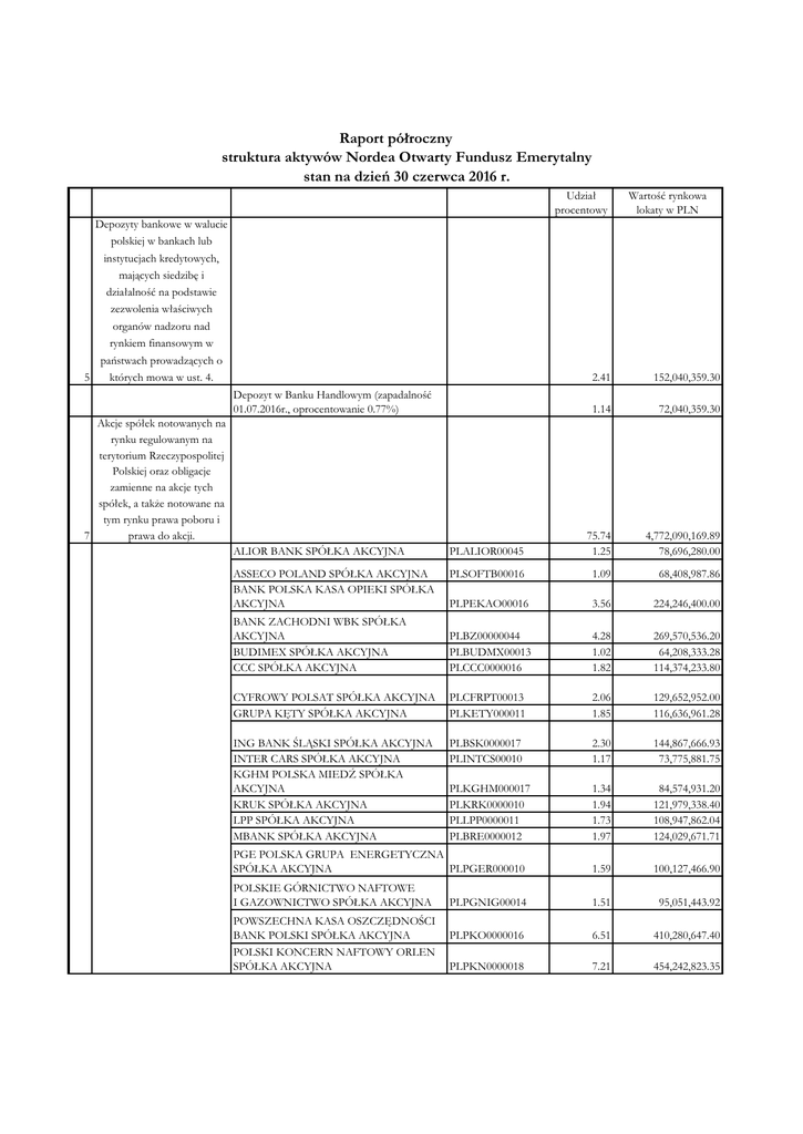 Raport półroczny struktura aktywów Nordea Otwarty Fundusz Emerytalny stan na dzień 30 czerwca 2016 r. Udział procentowy Depozyty bankowe w walucie polskiej w bankach lub instytucjach kredytowych, mających siedzibę i działalność na podstawie zezwolenia właściwych organów nadzoru nad rynkiem finansowym w państwach prowadzących o 5 których mowa w ust. 4. Depozyt w Banku Handlowym (zapadalność 01.07.2016r., oprocentowanie 0.77%) Akcje spółek notowanych na rynku regulowanym na terytorium Rzeczypospolitej Polskiej oraz obligacje zamienne na akcje tych spółek, a także notowane na tym rynku prawa poboru i 7 prawa do akcji. Wartość rynkowa lokaty w PLN 2.41 152,040,359.30 1.14 72,040,359.30 ALIOR BANK SPÓŁKA AKCYJNA PLALIOR00045 75.74 1.25 4,772,090,169.89 78,696,280.00 ASSECO POLAND SPÓŁKA AKCYJNA BANK POLSKA KASA OPIEKI SPÓŁKA AKCYJNA PLSOFTB00016 1.09 68,408,987.86 PLPEKAO00016 3.56 224,246,400.00 BANK ZACHODNI WBK SPÓŁKA AKCYJNA BUDIMEX SPÓŁKA AKCYJNA CCC SPÓŁKA AKCYJNA PLBZ00000044 PLBUDMX00013 PLCCC0000016 4.28 1.02 1.82 269,570,536.20 64,208,333.28 114,374,233.80 CYFROWY POLSAT SPÓŁKA AKCYJNA GRUPA KĘTY SPÓŁKA AKCYJNA PLCFRPT00013 PLKETY000011 2.06 1.85 129,652,952.00 116,636,961.28 ING BANK ŚLĄSKI SPÓŁKA AKCYJNA INTER CARS SPÓŁKA AKCYJNA KGHM POLSKA MIEDŹ SPÓŁKA AKCYJNA KRUK SPÓŁKA AKCYJNA LPP SPÓŁKA AKCYJNA MBANK SPÓŁKA AKCYJNA PLBSK0000017 PLINTCS00010 2.30 1.17 144,867,666.93 73,775,881.75 PLKGHM000017 PLKRK0000010 PLLPP0000011 PLBRE0000012 1.34 1.94 1.73 1.97 84,574,931.20 121,979,338.40 108,947,862.04 124,029,671.71 PGE POLSKA GRUPA ENERGETYCZNA SPÓŁKA AKCYJNA PLPGER000010 1.59 100,127,466.90 POLSKIE GÓRNICTWO NAFTOWE I GAZOWNICTWO SPÓŁKA AKCYJNA PLPGNIG00014 1.51 95,051,443.92 PLPKO0000016 6.51 410,280,647.40 PLPKN0000018 7.21 454,242,823.35 POWSZECHNA KASA OSZCZĘDNOŚCI BANK POLSKI SPÓŁKA AKCYJNA POLSKI KONCERN NAFTOWY ORLEN SPÓŁKA AKCYJNA POWSZECHNY ZAKŁAD UBEZPIECZEŃ SPÓŁKA AKCYJNA PLPZU0000011 UNIWHEELS AG DE000A13STW4 Akcje, prawa poboru i prawa do akcji, będące przedmiotem oferty publicznej na terytorium Rzeczypospolitej 8 Polskiej. Akcje spółek notowanych na 3.94 1.00 247,993,378.40 62,958,545.57 0.11 6,874,100.00 8.27 520,981,509.84 0.56 35,487,600.00 0.04 2,501,658.45 2.07 130,364,237.59 2.07 130,364,237.59 rynku regulowanym w państwach innych niż Rzeczpospolita Polska oraz obligacje zamienne na akcje tych spółek, a także notowane na tych rynkach prawa 9 poboru i prawa do akcji. Obligacje i inne dłużne papiery wartościowe, emitowane przez jednostki samorządu terytorialnego lub ich związki, będące przedmiotem oferty 15 publicznej. Inne niż będące przedmiotem oferty publicznej obligacje i inne dłużne papiery wartościowe, emitowane przez jednostki samorządu 17 terytorialnego lub ich związki. b) banki lub instytucje kredytowe, realizujące w szczególności programy rządowe, w tym realizowane z wykorzystaniem środków pochodzących z funduszy Unii Europejskiej oraz międzynarodowych instytucji finansowych, infrastrukturalne, a także związane z rozwojem sektora małych i średnich 20b przedsiębiorstw. Deutcshe Bank Luxemburg SA DEUT0518 XS0374003191 25 29 32 35 36 Obligacje i inne dłużne papiery wartościowe, dla których podmiotami zobowiązanymi do spełnienia świadczeń są spółki notowane na rynku regulowanym na terytorium Rzeczypospolitej Polskiej, inne niż papiery wartościowe, o których mowa w pkt 21 i 22. Listy zastawne Kwity depozytoww dopuszczone do obrotu na rynku regulowanym w państwach innych niż Rzeczpospolita Polska. Środki pieniężne Należności 7.81 2.23 492,361,005.89 140,333,901.86 0.06 0.13 0.57 3,755,588.21 8,152,823.66 35,291,438.09