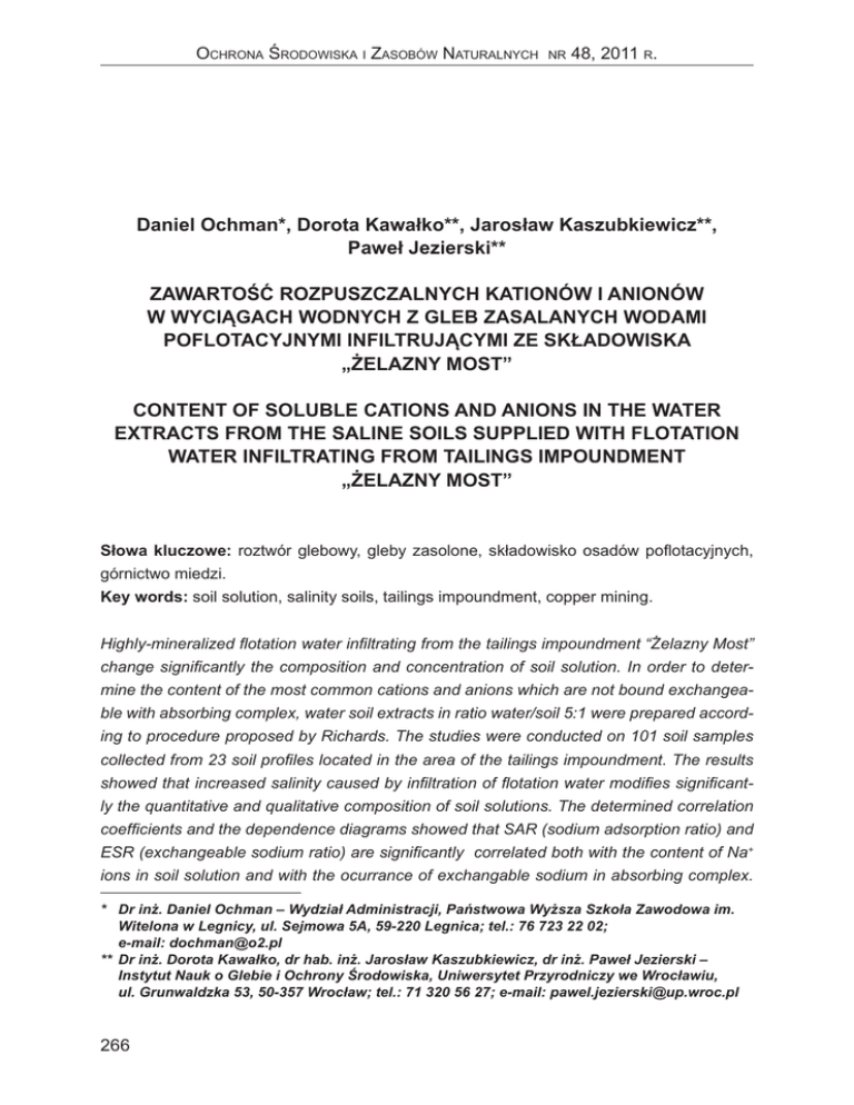 Ochrona Środowiska i Zasobów Naturalnych nr 48, 2011 r. Daniel Ochman*, Dorota Kawałko**, Jarosław Kaszubkiewicz**, Paweł Jezierski** ZAWARTOŚĆ ROZPUSZCZALNYCH KATIONÓW I ANIONÓW W WYCIĄGACH WODNYCH Z GLEB ZASALANYCH WODAMI POFLOTACYJNYMI INFILTRUJĄCYMI ZE SKŁADOWISKA „ŻELAZNY MOST” CONTENT OF SOLUBLE CATIONS AND ANIONS IN THE WATER EXTRACTS FROM THE SALINE SOILS SUPPLIED WITH FLOTATION WATER INFILTRATING FROM TAILINGS IMPOUNDMENT „ŻELAZNY MOST” Słowa kluczowe: roztwór glebowy, gleby zasolone, składowisko osadów poflotacyjnych, górnictwo miedzi. Key words: soil solution, salinity soils, tailings impoundment, copper mining. Highly-mineralized flotation water infiltrating from the tailings impoundment “Żelazny Most” change significantly the composition and concentration of soil solution. In order to determine the content of the most common cations and anions which are not bound exchangeable with absorbing complex, water soil extracts in ratio water/soil 5:1 were prepared according to procedure proposed by Richards. The studies were conducted on 101 soil samples collected from 23 soil profiles located in the area of the tailings impoundment. The results showed that increased salinity caused by infiltration of flotation water modifies significantly the quantitative and qualitative composition of soil solutions. The determined correlation coefficients and the dependence diagrams showed that SAR (sodium adsorption ratio) and ESR (exchangeable sodium ratio) are significantly correlated both with the content of Na+ ions in soil solution and with the ocurrance of exchangable sodium in absorbing complex. * Dr inż. Daniel Ochman – Wydział Administracji, Państwowa Wyższa Szkoła Zawodowa im. Witelona w Legnicy, ul. Sejmowa 5A, 59-220 Legnica; tel.: 76 723 22 02; e-mail: [email protected] ** Dr inż. Dorota Kawałko, dr hab. inż. Jarosław Kaszubkiewicz, dr inż. Paweł Jezierski – Instytut Nauk o Glebie i Ochrony Środowiska, Uniwersytet Przyrodniczy we Wrocławiu, ul. Grunwaldzka 53, 50-357 Wrocław; tel.: 71 320 56 27; e-mail: [email protected] 266 Zawartość rozpuszczalnych kationów i anionów w wyciągach wodnych z gleb zasalanych... The values of SAR and ESR are strongly connected with the content of chloride ions in the soil solution. The increased values of SAR in some soil horizons indicate the higher risk of soil salinity in the area of tailings impoundment. 1. WPROWADZENIE Naturalnie niski poziom okruszcowania polskich rud miedzi powoduje, że w procesach wzbogacania około 94% masy wydobytej rudy oddziela się jako odpad [Szopka 2003]. Przyjęta metoda uzyskiwania kruszcu w procesie flotacji wymaga składowania na mokro ogromnej masy materiału poflotacyjnego. Obecnie wszystkie odpady powstające podczas wzbogacania kierowane są na składowisko odpadów poflotacyjnych „Żelazny Most”. Jest to największy tego typu obiekt w Europie i jeden z największych na świecie [Chodak i in. 1997]. Zbiornik znajduje się w północno-zachodniej części województwa dolnośląskiego, na obszarze Niziny Środkowo-Polskiej, podprowincji Śląsko-Łużyckiej. Budowę składowiska rozpoczęto w 1974 r., a jego eksploatacja i równoczesna rozbudowa trwa od 1977 r. [Czaban i in. 2004]. Powierzchnia całkowita zbiornika wynosi 1394 ha (1670 ha wraz z obwałowaniem), a objętość składowanych odpadów to ponad 500 mln m3. Objętość całkowita składowiska do rzędnej 180 m wynosi 700 mln m3 [www.kghm.pl]. Gromadzenie odpadów na składowiskach powoduje z jednej strony wyłączenie z użytkowania znacznych powierzchni terenu, z drugiej – przyczynia się do wielokierunkowych ujemnych zmian w środowisku [Krajewski i in. 1998]. Głównymi czynnikami ograniczającymi możliwe sposoby zagospodarowania obszarów w otoczeniu składowiska odpadów poflotacyjnych „Żelazny Most” są zjawiska zasalania gleb, związane z przedostawaniem się na przedpola słonych wód nadosadowych retencjonowanych w zbiorniku, oraz podwyższone zawartości metali ciężkich w glebach [Ochman 2005]. Wprowadzenie soli do gleby niekorzystnie modyfikuje jej właściwości fizyczne i fizykochemiczne głównie poprzez wyraźne zmiany składu roztworu glebowego, wzrost wysycenia kompleksu sorpcyjnego kationami oraz zachwianie równowagi jonowej. Typowy dla naszych warunków układ kationów zasadowych w glebie Ca2+ > Mg2+ > K+ > Na+ zostaje zakłócony poprzez zwiększenie udziału sodu. Aby określić wpływ zasolenia na gleby nie wystarcza określenie ogólnej zawartości soli, wyrażonej w mg∙kg-1, głównie ze względu na różną pojemność wodną gleb w stanie pełnego nasycenia. Dlatego autorzy poruszający w swoich pracach problem zasolenia [Richards 1954] stosują do określenia jego poziomu pomiar przewodnictwa elektrycznego właściwego w temperaturze 25°C (ECe) wyrażonego w μS∙cm-1 lub mS∙cm-1. Pomiaru ECe dokonuje się w paście glebowej, zawiesinie lub przesączu glebowym [Chodak i in.1997]. Wskaźnik ten nie opisuje jednak składu jonowego znajdujących się w glebie soli, a w szczególności udziału jonów Na+, mających największy wpływ na właściwości gruntów 267 Daniel Ochman i in. słonych. Aby dokładniej scharakteryzować wpływ jonów sodowych na gleby oblicza się stopień adsorpcji sodu SAR (sodium adsorption ratio), wyrażający względną aktywność jonów sodu w reakcjach wymiany przy oddziaływaniu wody na glebę, udział sodu wymiennego ESR (exchangeable sodium ratio) oraz procentowy udział sodu wymiennego ESP (exchangeable sodium percentage) [Richards 1954]. Im wyższy jest stopień adsorpcji sodu (SAR), tym łatwiejsze przechodzenie Na+ do kompleksu sorpcyjnego. 2. MATERIAŁY I METODY Badania prowadzone nad hydrologicznym oddziaływaniem składowiska odpadów poflotacyjnych „Żelazny Most” na okoliczne gleby obejmowały trzy zasadnicze etapy, do których należały prace inwentaryzacyjne, polowe oraz analizy laboratoryjne. Na wytypo