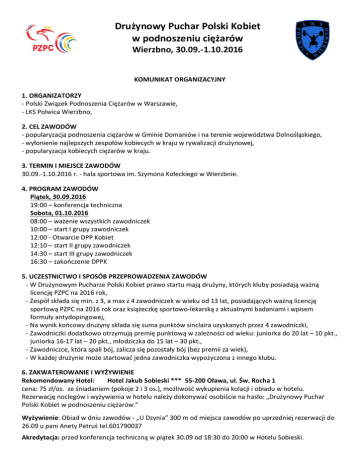 Drużynowy Puchar Polski Kobiet w podnoszeniu ciężarów Wierzbno, 30.09.-1.10.2016 KOMUNIKAT ORGANIZACYJNY 1. ORGANIZATORZY - Polski Związek Podnoszenia Ciężarów w Warszawie, - LKS Polwica Wierzbno, 2. CEL ZAWODÓW - popularyzacja podnoszenia ciężarów w Gminie Domaniów i na terenie województwa Dolnośląskiego, - wyłonienie najlepszych zespołów kobiecych w kraju w rywalizacji drużynowej, - popularyzacja kobiecych ciężarów w kraju. 3. TERMIN I MIEJSCE ZAWODÓW 30.09.-1.10.2016 r. - hala sportowa im. Szymona Kołeckiego w Wierzbnie. 4. PROGRAM ZAWODÓW Piątek, 30.09.2016 19:00 – konferencja techniczna Sobota, 01.10.2016 08:00 – ważenie wszystkich zawodniczek 10:00 – start I grupy zawodniczek 12:00 - Otwarcie DPP Kobiet 12:10 – start II grupy zawodniczek 14:30 – start III grupy zawodniczek 16:30 – zakończenie DPPK 5. UCZESTNICTWO I SPOSÓB PRZEPROWADZENIA ZAWODÓW - W Drużynowym Pucharze Polski Kobiet prawo startu mają drużyny, których kluby posiadają ważną licencję PZPC na 2016 rok, - Zespół składa się min. z 3, a max z 4 zawodniczek w wieku od 13 lat, posiadających ważną licencję sportową PZPC na 2016 rok oraz książeczkę sportowo-lekarską z aktualnymi badaniami i wpisem formuły antydopingowej, - Na wynik końcowy drużyny składa się suma punktów sinclaira uzyskanych przez 4 zawodniczki, - Zawodniczki dodatkowo otrzymują premię punktową w zależności od wieku: juniorka do 20 lat – 10 pkt., juniorka 16-17 lat – 20 pkt., młodziczka do 15 lat – 30 pkt., - Zawodniczce, która spali bój, zalicza się pozostały bój (bez premii za wiek), - W każdej drużynie może startować jedna zawodniczka wypożyczona z innego klubu. 6. ZAKWATEROWANIE I WYŻYWIENIE Rekomendowany Hotel: Hotel Jakub Sobieski *** 55-200 Oława, ul. Św. Rocha 1 cena: 75 zł/os. ze śniadaniem (pokoje 2 i 3 os.), możliwość wykupienia kolacji i obiadu w hotelu. Rezerwację noclegów i wyżywienia w hotelu należy dokonywać osobiście na hasło: „Drużynowy Puchar Polski Kobiet w podnoszeniu ciężarów.” Wyżywienie: Obiad w dniu zawodów - „U Dzynia” 300 m od miejsca zawodów po uprzedniej rezerwacji do 26.09 u pani Anety Petruś tel.601790037 Akredytacja: przed konferencja techniczną w piątek 30.09 od 18:30 do 20:00 w Hotelu Sobieski. 7. ZGŁOSZENIE UDZIAŁU W ZAWODACH Zgłoszenia imiennego zawodniczek prosimy dokonać najpóźniej do dnia 26.09.2016 wyłącznie w formie elektronicznej: [email protected] na załączonym druku. W przypadku zgłoszenia uczestników po terminie klub uiszcza podwójną opłatę startową od każdego zawodnika i osoby towarzyszącej. 8. STARTOWE Od każdej zawodniczki oraz osób towarzyszących pobierane będzie startowe w wysokości 40 zł 9. NAGRODY - indywidualnie najlepsza zawodniczka wg pkt. sinclaira, - 6 najlepszych zespołów otrzyma nagrody finansowe, - w miarę pozyskanych środków inne nagrody. 10. SPRAWY ORGANIZACYJNE - obsługę sędziowską, w uzgodnieniu z OZPC zapewnia PZPC, - organizator pokrywa koszty organizacyjne imprezy, - organizator nie ponosi odpowiedzialności z tytułu ubezpieczenia zawodniczek, kradzieży bądź zgubienia sprzętu przez zawodniczki, - organizator zastrzega sobie prawo interpretacji w przypadkach nie określonych w niniejszym regulaminie. Kontakt: Jacek Góralski 505661274 Adam Kraska 699266454