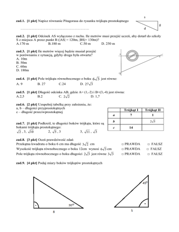 s zad.1. [1 pkt] Napisz równanie Pitagorasa do rysunku trójkąta prostokątnego g ………………………………………………… d zad.2. [1 pkt] Odcinek AS wyłączono z ruchu. Ile metrów musi przejść uczeń, aby dotarł do szkoły S z miejsca A przez punkt B (|AS| = 120m, |BS|= 130m)? A.170 m B.180 m C.50 m D. 250 m zad.3. [1 pkt] Ile metrów więcej będzie musiał przejść w porównaniu z sytuacją, gdyby droga była otwarta? A. 10m B. 50m C. 60m D. 180m S zad.4. [1 pkt] Pole trójkąta równobocznego o boku 6 3 jest równe: A. 9 B. 27 C.24 D. 27 3 zad.5. [1 pkt] Długość odcinka AB, gdzie A= (1,-2) i B=(3,-4) jest równa: A.2,5 B.2 C. 2 2 D. 1,7 zad.6. [2 pkt] Uzupełnij tabelkę przy założeniu, że: a, b – długości przyprostokątnych c – długość przeciwprostokątnej zad.7. [1 pkt] Podkreśl, te długości boków trójkąta, które są bokami trójkąta prostokątnego: 2, 5 , 3 3, 11 , 3 2 , 3, 10 a Trójkąt II 7 1 b c zad.8. [3 pkt] Oceń prawdziwość zdań Przekątna kwadratu o boku 6 cm ma długość 3 2 cm Wysokość trójkąta równobocznego o boku 12cm wynosi 6 3 cm Pole trójkąta równobocznego o boku długości 2 3 jest równe 3 3 zad.9. [4 pkt] Podaj miary boków trójkątów prostokątnych Trójkąt I 2 5 14 □ PRAWDA □ PRAWDA □ FAŁSZ □ FAŁSZ □ PRAWDA □ FAŁSZ Zadanie otwarte: 1. [4 pkt] Analizując rysunek, oblicz jaka jest wysokość pomieszczeń na I piętrze, jeśli wysokość pomieszczeń na parterze sięga 4m. Wynik przybliż do 1m. 2.[4 pkt] Oblicz pole trójkąta równoramiennego, którego podstawa ma długość 4cm, a ramię 10cm. Wykonaj rysunek poglądowy. 3.[4 pkt] W kwadratowej ścianie budynku o boku 6m namalowano szlaczek łączący dwa przeciwległe narożniki. Jaką długość w przybliżeniu do 1 dm ma ten szlaczek. Sporządź rysunek poglądowy.