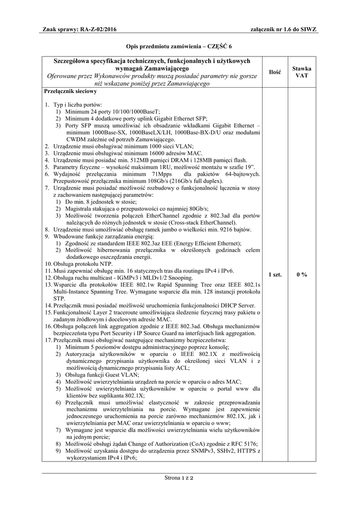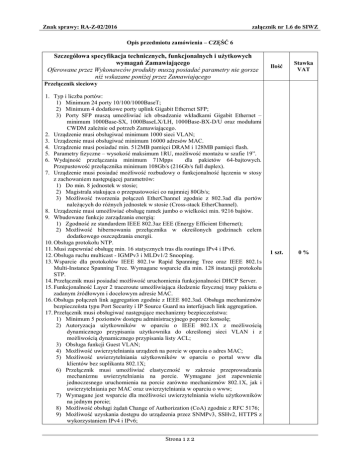 Znak sprawy: RA-Z-02/2016 załącznik nr 1.6 do SIWZ Opis przedmiotu zamówienia – CZĘŚĆ 6 Szczegółowa specyfikacja technicznych, funkcjonalnych i użytkowych wymagań Zamawiającego Oferowane przez Wykonawców produkty muszą posiadać parametry nie gorsze niż wskazane poniżej przez Zamawiającego Ilość Stawka VAT 1 szt. 0% Przełącznik sieciowy 1. Typ i liczba portów: 1) Minimum 24 porty 10/100/1000BaseT; 2) Minimum 4 dodatkowe porty uplink Gigabit Ethernet SFP; 3) Porty SFP muszą umożliwiać ich obsadzanie wkładkami Gigabit Ethernet – minimum 1000Base-SX, 1000BaseLX/LH, 1000Base-BX-D/U oraz modułami CWDM zależnie od potrzeb Zamawiającego. 2. Urządzenie musi obsługiwać minimum 1000 sieci VLAN; 3. Urządzenie musi obsługiwać minimum 16000 adresów MAC. 4. Urządzenie musi posiadać min. 512MB pamięci DRAM i 128MB pamięci flash. 5. Parametry fizyczne – wysokość maksimum 1RU, możliwość montażu w szafie 19”. 6. Wydajność przełączania minimum 71Mpps dla pakietów 64-bajtowych. Przepustowość przełącznika minimum 108Gb/s (216Gb/s full duplex). 7. Urządzenie musi posiadać możliwość rozbudowy o funkcjonalność łączenia w stosy z zachowaniem następującej parametrów: 1) Do min. 8 jednostek w stosie; 2) Magistrala stakująca o przepustowości co najmniej 80Gb/s; 3) Możliwość tworzenia połączeń EtherChannel zgodnie z 802.3ad dla portów należących do różnych jednostek w stosie (Cross-stack EtherChannel). 8. Urządzenie musi umożliwiać obsługę ramek jumbo o wielkości min. 9216 bajtów. 9. Wbudowane funkcje zarządzania energią: 1) Zgodność ze standardem IEEE 802.3az EEE (Energy Efficient Ethernet); 2) Możliwość hibernowania przełącznika w określonych godzinach celem dodatkowego oszczędzania energii. 10. Obsługa protokołu NTP. 11. Musi zapewniać obsługę min. 16 statycznych tras dla routingu IPv4 i IPv6. 12. Obsługa ruchu multicast - IGMPv3 i MLDv1/2 Snooping. 13. Wsparcie dla protokołów IEEE 802.1w Rapid Spanning Tree oraz IEEE 802.1s Multi-Instance Spanning Tree. Wymagane wsparcie dla min. 128 instancji protokołu STP. 14. Przełącznik musi posiadać możliwość uruchomienia funkcjonalności DHCP Server. 15. Funkcjonalność Layer 2 traceroute umożliwiająca śledzenie fizycznej trasy pakietu o zadanym źródłowym i docelowym adresie MAC. 16. Obsługa połączeń link aggregation zgodnie z IEEE 802.3ad. Obsługa mechanizmów bezpieczeństa typu Port Security i IP Source Guard na interfejsach link aggregation. 17. Przełącznik musi obsługiwać następujące mechanizmy bezpieczeństwa: 1) Minimum 5 poziomów dostępu administracyjnego poprzez konsolę; 2) Autoryzacja użytkowników w oparciu o IEEE 802.1X z możliwością dynamicznego przypisania użytkownika do określonej sieci VLAN i z możliwością dynamicznego przypisania listy ACL; 3) Obsługa funkcji Guest VLAN; 4) Możliwość uwierzytelniania urządzeń na porcie w oparciu o adres MAC; 5) Możliwość uwierzytelniania użytkowników w oparciu o portal www dla klientów bez suplikanta 802.1X; 6) Przełącznik musi umożliwiać elastyczność w zakresie przeprowadzania mechanizmu uwierzytelniania na porcie. Wymagane jest zapewnienie jednoczesnego uruchomienia na porcie zarówno mechanizmów 802.1X, jak i uwierzytelniania per MAC oraz uwierzytelniania w oparciu o www; 7) Wymagane jest wsparcie dla możliwości uwierzytelniania wielu użytkowników na jednym porcie; 8) Możliwość obsługi żądań Change of Authorization (CoA) zgodnie z RFC 5176; 9) Możliwość uzyskania dostępu do urządzenia przez SNMPv3, SSHv2, HTTPS z wykorzystaniem IPv4 i IPv6; Strona 1 z 2 Znak sprawy: RA-Z-02/2016 załącznik nr 1.6 do SIWZ 10) Obsługa list kontroli dostępu (ACL) – dla portów (PACL) i interfejsów SVI (RACL) – zarówno dla IPv4 jak i IPv6; 11) Obsługa mechanizmów Port Security, DHCP Snooping, Dynamic ARP Inspection, IP Source Guard; 12) Funkcjonalność Protected Port; 13) Zapewnienie podstawowych mechanizmów bezpieczeństwa IPv6 na brzegu sieci (IPv6 FHS) – w tym minimum ochronę przed rozgłaszaniem fałszywych komunikatów Router Advertisement (RA Guard), ochronę przed dołączeniem nieuprawnionych serwerów DHCPv6 do sieci (DHCPv6 Guard); 14) Obsługa funkcjonalności Voice VLAN umożliwiającej odseparowanie ruchu danych i ruchu głosowego; 15) Możliwość próbkowania i eksportu statystyk ruchu do zewnętrznych kolektorów danych (mechanizmy typu sFlow, NetFlow, J-Flow lub równoważne) 18. Przełącznik musi wspierać następujące mechanizmy związane z zapewnieniem jakości usług w sieci: 1) Klasyfikacja ruchu do klas różnej jakości obsługi (QoS) poprzez wykorzystanie następujących parametrów: źródłowy/docelowy adres MAC, źródłowy/docelowy adres IP, źródłowy/docelowy port TCP; 2) Implementacja co najmniej czterech kolejek sprzętowych na każdym porcie wyjściowym dla obsługi ruchu o różnej klasie obsługi. Implementacja algorytmu Shaped Round Robin lub podobnego dla obsługi tych kolejek; 3) Możliwość obsługi jednej z powyżej wspomnianych kolejek z bezwzględnym priorytetem w stosunku do innych (Strict Priority); 4) Możliwość ograniczania pasma dostępnego na danym porcie dla ruchu o danej klasie obsługi. Wymagana jest możliwość skonfigurowania minimum 256 różnych ograniczeń. 19. Przełącznik musi posiadać makra lub wzorce konfiguracji portów zawierające prekonfigurowane ustawienie rekomendowane przez producenta sprzętu zależnie od typu urządzenia dołączonego do portu (np. telefon IP). 20. Obsługa protokołu LLDP i LLDP-MED lub równoważnych (np. CDP). 21. Urządzenie musi mieć możliwość zarządzania poprzez interfejs CLI z poziomu portu konsoli . 22. Urządzenie musi być wyposażone w port USB umożliwiający podłączenie pamięci flash. Musi być dostępna opcja uruchomienia systemu operacyjnego z nośnika danych podłączonego do portu USB. 23. Przełącznik musi umożliwiać zda