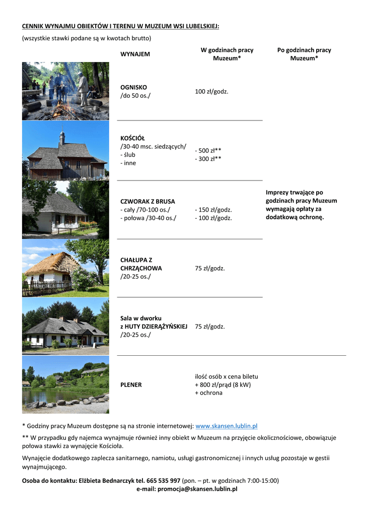 CENNIK WYNAJMU OBIEKTÓW I TERENU W MUZEUM WSI LUBELSKIEJ: (wszystkie stawki podane są w kwotach brutto) WYNAJEM OGNISKO /do 50 os./ KOŚCIÓŁ /30-40 msc. siedzących/ - ślub - inne CZWORAK Z BRUSA - cały /70-100 os./ - połowa /30-40 os./ W godzinach pracy Muzeum* Po godzinach pracy Muzeum* 100 zł/godz. - 500 zł** - 300 zł** - 150 zł/godz. - 100 zł/godz. CHAŁUPA Z CHRZĄCHOWA /20-25 os./ 75 zł/godz. Sala w dworku z HUTY DZIERĄŻYŃSKIEJ /20-25 os./ 75 zł/godz. PLENER ilość osób x cena biletu + 800 zł/prąd (8 kW) + ochrona Imprezy trwające po godzinach pracy Muzeum wymagają opłaty za dodatkową ochronę. * Godziny pracy Muzeum dostępne są na stronie internetowej: www.skansen.lublin.pl ** W przypadku gdy najemca wynajmuje również inny obiekt w Muzeum na przyjęcie okolicznościowe, obowiązuje połowa stawki za wynajęcie Kościoła. Wynajęcie dodatkowego zaplecza sanitarnego, namiotu, usługi gastronomicznej i innych usług pozostaje w gestii wynajmującego. Osoba do kontaktu: Elżbieta Bednarczyk tel. 665 535 997 (pon. – pt. w godzinach 7:00-15:00) e-mail: [email protected]