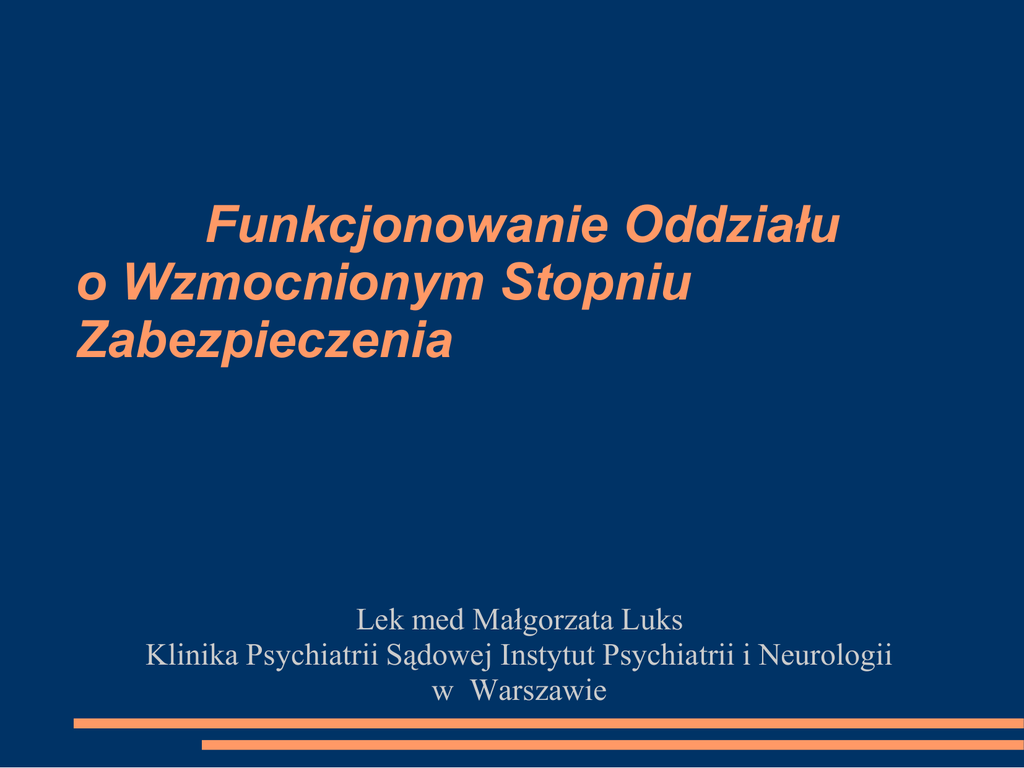 Funkcjonowanie Oddziału o Wzmocnionym Stopniu Zabezpieczenia Lek med Małgorzata Luks Klinika Psychiatrii Sądowej Instytut Psychiatrii i Neurologii w Warszawie Zgodnie z rozporządzeniem Ministra Zdrowia z dnia 10.08.2004 zakłady psychiatryczne dysponujące warunkami wzmocnionego zabezpieczenia muszą spełniać następujące wymagania : 1-spełniają stały nadzór nad sprawcami przebywającymi w zakładzie 2-posiadają drzwi i okna wyposażone w urządzenia uniemożliwiające sprawcom samodzielne opuszczenie zakładu 3- są wyposażone w : -system telewizji wewnętrznej umożliwiający obserwację drzwi wejściowych, okien zewnętrznych , sal ogólnych, izolatek, korytarzy -elektroniczny system sygnalizujący niekontrolowane otwarcie drzwi i okien 4-Mają możliwość wydzielenia od 10 do 20 łóżkowych pododziałów 5- mają bezpośredni dostęp do ogrodzonego terenu rekreacyjnego 6- zatrudniają personel w liczbie co najmniej dwukrotnie większej niż liczba pacjentów zakładu. Oddział o Wzmocnionym Stopniu Zabezpieczenia Kliniki Psychiatrii Sądowej w IPiN rozpoczął działalność w październiku 2013r. Zgodnie z rozporządzeniem posiada 60 miejsc detencyjnych oraz 1 miejsce przeznaczone dla osób skierowanych na obserwację sądowo psychiatryczną . Dysponuje 10 łóżkami dla kobiet oraz 50 łóżkami dla mężczyzn. Jest podzielony na 2 pododziały. Na parterze znajduje się 16 łóżek rozmieszczonych w salach jedno i dwuosobowych. Są przeznaczone dla pacjentów nowo przyjętych do kliniki, a także dla chorych u których doszło do pogorszenia stanu psychicznego. Na pierwszym piętrze mieszczą się sale wieloosobowe ( od 2- do 5 osób) . Wszystkie sale są wyposażone w kamery. W dyżurkach pielęgniarek umieszczone są monitory pozwalające na obserwację pacjentów . Struktura Oddziału o Wzmocnionym Stopniu Zabezpieczenia Kliniki Psychiatrii Sądowej IPiN Pacjenci mają do dyspozycji: - ogrodzony teren rekreacyjny z boiskiem - pięć sal do terapii zajęciowej -salę komputerową -sale gimnastyczną -siłownię -kaplicę -w każdym oddziale kuchnię wraz z naczyniami -pralnię i suszarnię Pracownicy oddziału W oddziale jest zatrudnionych 100 osób : 5 lekarzy 6 psychologów 1 terapeuta uzależnień 5 terapeutów zajęciowych 1pracownik socjalny 26 pielęgniarek w tym 1 pielęgniarka oddziałowa 26 sanitariuszy 11 pracowników ochrony w tym jeden koordynator Pacjenci Oddziału o Wzmocnionym Stopniu Zabezpieczenia Chorzy psychicznie którzy dokonali czynu zabronionego Pełnoletni Z orzeczeniem artykułu 31 par 1 kk, gdy stwierdzono , że zachodzi wysokie prawdopodobieństwo popełnienia czynu o wysokie szkodliwości społecznej związanego z ich chorobą psychiczną czy upośledzeniem umysłowym Pacjenci oddziału sądowego to w większość osoby: Z wieloletnim okresem trwania choroby Z częstymi nawrotami Często z rozpoznaniem podwójnej diagnozy Nie współpracujący w procesie leczenia Z barkiem krytycyzmu chorobowego Popełniające czyny agresywne, najczęściej wobec osób bliskich Długość pobytu w oddziale o wzmocnionym stopniu zabezpoeczenia Czas trwania detencji nie jest określony. O długości pobytu decyduje stan psychiczny i funkcjonowanie pacjenta w odniesieniu do rodzaju czynu zabronionego jakiego dokonał Jak wynika z piśmiennictwa ok 50 % pacjentów przebywa w oddziale o wzmocnionym stopniu zabezpieczenia przez okres 3-5 lat, a ok 5% powyżej 20 lat O wypisie bądź pozostawieniu pacjenta w oddziale decydujemy na zebraniu w którym uczestniczą lekarze, psycholodzy, terapeuci zajęciowi oraz personel pielęgniarski. Pacjenci Oddziału o Wzmocnionym Stopniu Zabezpieczenia KPS- statystyka rozpoznań Obecnie przebywa na detencji 58 osób- 10 kobiet i 48 mężczyzn Rozpoznania: 1-schizofrenia paranoidalna i zaburzenia schizoafektywne- 35 osób, w tym 11 osób z podwójną diagnozą 2-organiczne zaburzenia urojeniowe- 6 osób 3-zaburzenia psychotyczne w przebiegu uzależnienia ( alkohol, narkotyki) -10 osób 4-uporczywe zaburzenia urojeniowe- 5 osoby 5-upośledzenie umysłowe -2 osoby Statystyka rozpoznań – rozkład procentowy Schizofrenia paranoidalna - 60% Zaburzenia psychotyczne w przebiegu uzależnienia 17 % Organiczne zaburzenia urojeniowe - 10% Utrwalone zaburzenia urojeniowe - 8% Upośledzenie umysłowe – 5% Pacjenci uzależnienie od alkoholu lub substancji psychoaktywnych stanowią 36% Czyny zabronione popełnione przez pacjentów oddziału Zabójstwo - 18 pacjentów ( 31%), z czego u 13 pacjentów rozpoznano schizofrenię Zabójstwo lub usiłowanie zabójstwa dotyczy najczęściej najbliższych członków rodziny : matka, ojciec, rodzeństwo, dzieci. 27 pacjentów KPS dokonało zamachu na życie najbliższego członka rodziny. Czyny zabronione popełnione przez pacjentów oddziału Czyny agresywne w tym usiłowanie zabójstwa 26 pacjentów Groźby pozbawienia życia - 5 Przestępstwa seksualne- 9 pacjentów -1 osoba usiłowanie gwałtu -8 osób czyny pedofilne Zasady funkcjonowania oddziału o wzmocnionym stopniu zabezpieczenia Przyjęcie pacjenta do oddziału odbywa się po otrzymaniu od Sądu postanowienia o odbywaniu środka zabezpieczającego w Klinice Psychiatrii Sądowej IPiN oraz nakazu przyjęcia. Pacjenci są przewożeni przez konwój policyjny. Do Oddziału trafiają z : -ROPS -aresztu -oddziału psychiatrycznego lub DPS -z domu Przy przyjęciu pacjent jest zapoznawany z regulaminem oddziału, sporządza listę osób odwiedzających. Zasady funkcjonowania oddziału o wzmocnionym stopniu zabezpieczenia W oddziale pacjent zostaje zapoznany z harmonogramem zajęć terapeutycznych oraz otrzymuje indywidualny plan terapii. 1-2 razy dziennie odbywa się spacer-pacjenci pod nadzorem personelu ( pracownicy ochrony, sanitariusze, pielęgniarze) spędzają czas na ogrodzonym terenie rekreacyjnym. Zajęcia odbywają się w grupach liczących maksymalnie 10 osób ( z wyjątkiem filmoterapii), również pod nadzorem personelu. Odwiedziny