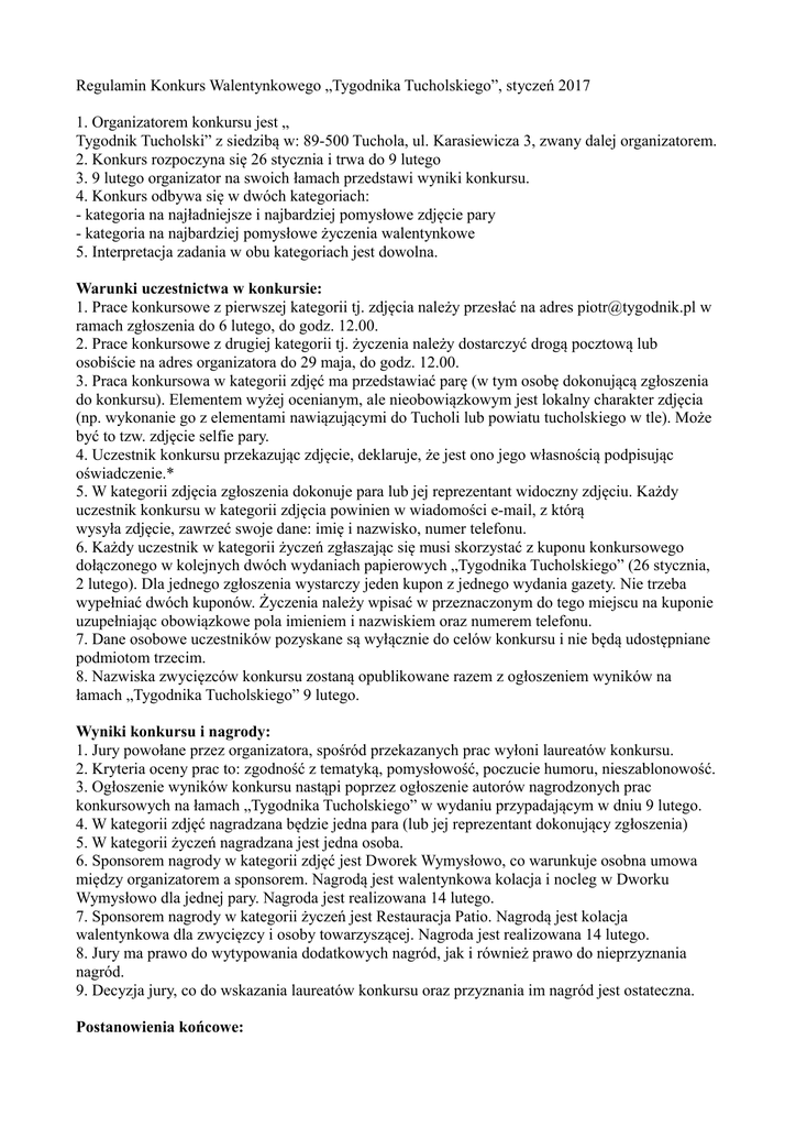 Regulamin Konkurs Walentynkowego „Tygodnika Tucholskiego”, styczeń 2017 1. Organizatorem konkursu jest „ Tygodnik Tucholski” z siedzibą w: 89-500 Tuchola, ul. Karasiewicza 3, zwany dalej organizatorem. 2. Konkurs rozpoczyna się 26 stycznia i trwa do 9 lutego 3. 9 lutego organizator na swoich łamach przedstawi wyniki konkursu. 4. Konkurs odbywa się w dwóch kategoriach: - kategoria na najładniejsze i najbardziej pomysłowe zdjęcie pary - kategoria na najbardziej pomysłowe życzenia walentynkowe 5. Interpretacja zadania w obu kategoriach jest dowolna. Warunki uczestnictwa w konkursie: 1. Prace konkursowe z pierwszej kategorii tj. zdjęcia należy przesłać na adres [email protected] w ramach zgłoszenia do 6 lutego, do godz. 12.00. 2. Prace konkursowe z drugiej kategorii tj. życzenia należy dostarczyć drogą pocztową lub osobiście na adres organizatora do 29 maja, do godz. 12.00. 3. Praca konkursowa w kategorii zdjęć ma przedstawiać parę (w tym osobę dokonującą zgłoszenia do konkursu). Elementem wyżej ocenianym, ale nieobowiązkowym jest lokalny charakter zdjęcia (np. wykonanie go z elementami nawiązującymi do Tucholi lub powiatu tucholskiego w tle). Może być to tzw. zdjęcie selfie pary. 4. Uczestnik konkursu przekazując zdjęcie, deklaruje, że jest ono jego własnością podpisując oświadczenie.* 5. W kategorii zdjęcia zgłoszenia dokonuje para lub jej reprezentant widoczny zdjęciu. Każdy uczestnik konkursu w kategorii zdjęcia powinien w wiadomości e-mail, z którą wysyła zdjęcie, zawrzeć swoje dane: imię i nazwisko, numer telefonu. 6. Każdy uczestnik w kategorii życzeń zgłaszając się musi skorzystać z kuponu konkursowego dołączonego w kolejnych dwóch wydaniach papierowych „Tygodnika Tucholskiego” (26 stycznia, 2 lutego). Dla jednego zgłoszenia wystarczy jeden kupon z jednego wydania gazety. Nie trzeba wypełniać dwóch kuponów. Życzenia należy wpisać w przeznaczonym do tego miejscu na kuponie uzupełniając obowiązkowe pola imieniem i nazwiskiem oraz numerem telefonu. 7. Dane osobowe uczestników pozyskane są wyłącznie do celów konkursu i nie będą udostępniane podmiotom trzecim. 8. Nazwiska zwycięzców konkursu zostaną opublikowane razem z ogłoszeniem wyników na łamach „Tygodnika Tucholskiego” 9 lutego. Wyniki konkursu i nagrody: 1. Jury powołane przez organizatora, spośród przekazanych prac wyłoni laureatów konkursu. 2. Kryteria oceny prac to: zgodność z tematyką, pomysłowość, poczucie humoru, nieszablonowość. 3. Ogłoszenie wyników konkursu nastąpi poprzez ogłoszenie autorów nagrodzonych prac konkursowych na łamach „Tygodnika Tucholskiego” w wydaniu przypadającym w dniu 9 lutego. 4. W kategorii zdjęć nagradzana będzie jedna para (lub jej reprezentant dokonujący zgłoszenia) 5. W kategorii życzeń nagradzana jest jedna osoba. 6. Sponsorem nagrody w kategorii zdjęć jest Dworek Wymysłowo, co warunkuje osobna umowa między organizatorem a sponsorem. Nagrodą jest walentynkowa kolacja i nocleg w Dworku Wymysłowo dla jednej pary. Nagroda jest realizowana 14 lutego. 7. Sponsorem nagrody w kategorii życzeń jest Restauracja Patio. Nagrodą jest kolacja walentynkowa dla zwycięzcy i osoby towarzyszącej. Nagroda jest realizowana 14 lutego. 8. Jury ma prawo do wytypowania dodatkowych nagród, jak i również prawo do nieprzyznania nagród. 9. Decyzja jury, co do wskazania laureatów konkursu oraz przyznania im nagród jest ostateczna. Postanowienia końcowe: 1. Ewentualna publikacje zwycięskich zgłoszeń w obu kategoriach nastąpią tylko wtedy, gdy zgodę na to wyrażą sami zwycięzcy obu kategorii. 2. Biorąc udział w konkursie, uczestnik akceptuje jego regulamin. 3. Regulamin niniejszego konkursu będzie dostępny na stronie www.tygodnik.pl oraz w siedzibie redakcji organizatora. 4. Wszelkie informacje dotyczące konkursu będą na bieżąco publikowane na portalu tygodnik.pl i rozpowszechniane na oficjalnym profilu „Tygodnika Tucholskiego” na Facebooku. 5. Organizator zastrzega sobie prawo do: a) zmiany postanowień niniejszego regulaminu w przypadku zmian przepisów prawnych lub innych istotnych zdarzeń mających wpływ na organizowanie Konkursu. b) odstąpienia od organizowania konkursu bez podania przyczyny, c) nierozstrzygnięcia konkursu w przypadku zbyt małej ilości przekazanych prac, d) rozstrzygania w kwestiach nieuregulowanych postanowieniami regulaminu *Załącznik Oświadczenie Zapoznałam/em się z Regulaminem Konkursu Walentynkowego i akceptuję jego warunki. Oświadczam, że jestem właścicielem/posiadaczem zgłoszonego zdjęcia. Podpis uczestnika .............................