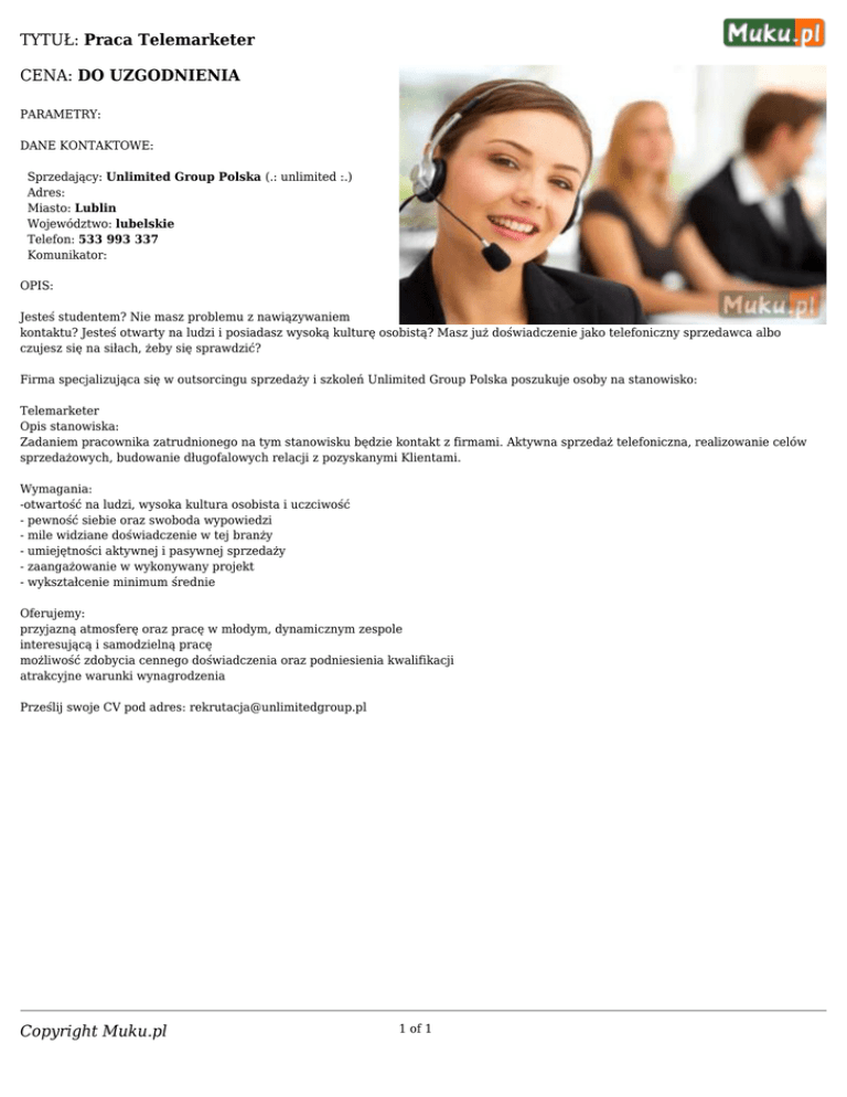 TYTUŁ: Praca Telemarketer CENA: DO UZGODNIENIA PARAMETRY: DANE KONTAKTOWE: Sprzedający: Unlimited Group Polska (.: unlimited :.) Adres: Miasto: Lublin Województwo: lubelskie Telefon: 533 993 337 Komunikator: OPIS: Jesteś studentem? Nie masz problemu z nawiązywaniem kontaktu? Jesteś otwarty na ludzi i posiadasz wysoką kulturę osobistą? Masz już doświadczenie jako telefoniczny sprzedawca albo czujesz się na siłach, żeby się sprawdzić? Firma specjalizująca się w outsorcingu sprzedaży i szkoleń Unlimited Group Polska poszukuje osoby na stanowisko: Telemarketer Opis stanowiska: Zadaniem pracownika zatrudnionego na tym stanowisku będzie kontakt z firmami. Aktywna sprzedaż telefoniczna, realizowanie celów sprzedażowych, budowanie długofalowych relacji z pozyskanymi Klientami. Wymagania: -otwartość na ludzi, wysoka kultura osobista i uczciwość - pewność siebie oraz swoboda wypowiedzi - mile widziane doświadczenie w tej branży - umiejętności aktywnej i pasywnej sprzedaży - zaangażowanie w wykonywany projekt - wykształcenie minimum średnie Oferujemy: przyjazną atmosferę oraz pracę w młodym, dynamicznym zespole interesującą i samodzielną pracę możliwość zdobycia cennego doświadczenia oraz podniesienia kwalifikacji atrakcyjne warunki wynagrodzenia Prześlij swoje CV pod adres: [email protected] Copyright Muku.pl 1 of 1