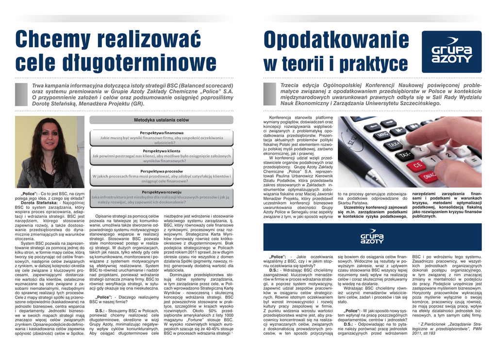 Chcemy realizować cele długoterminowe Trwa kampania informacyjna dotycząca istoty strategii BSC (Balanced scorecard) oraz systemu premiowania w Grupie Azoty Zakłady Chemiczne „Police” S.A. O przypomnienie założeń i celów oraz podsumowanie osiągnięć poprosiliśmy Dorotę Stefańską, Menadżera Projektu (GR). Metodyka ustalania celów „Police”: - Co to jest BSC, na czym polega jego idea, z czego się składa? Dorota Stefańska: - Najogólniej BSC to system zarządzania, który wspiera proces opracowania, adaptacji i wdrażania strategii. BSC jest narzędziem, którego stosowanie zapewnia rozwój, a także dostosowanie przedsiębiorstwa do dynamicznie zmieniających się warunków otoczenia. System BSC pozwala na zaprezentowanie strategii za pomocą jednej do kilku stron, w formie mapy celów, którą tworzy się poczynając od celów finansowych, następnie celów związanych z rynkiem, w dalszej kolejności określa się cele związane z kluczowymi procesami, zapewniającymi dostarczanie wartości dla klientów, ostatecznie wyznaczane są cele związane z zasobami niematerialnymi, niezbędnymi do sprawnej realizacji tych procesów. Cele z mapy strategii spółki są przenoszone odpowiednio (kaskadowane) na jednostki biznesowe, centra wsparcia i departamenty. Jednostki biznesowe w swoich mapach strategii mają znacząco więcej celów związanych z rynkiem. Opisane podejście do definiowania i kaskadowania celów zapewnia spójność (zbieżność) celów w Spółce. Opisanie strategii za pomocą celów pozwala na łatwiejsze jej komunikowanie, umożliwia także stworzenie odpowiedniego systemu motywacyjnego stanowiącego wsparcie w realizacji strategii. Stosowanie BSC pozwala stale monitorować postęp w realizacji strategii. W dużych organizacjach, takich jak nasza, tylko wtedy gdy cele są komunikowane, monitorowane i powiązane z systemem motywacyjnym są efektywniej realizowane. System BSC to również uruchamianie i nadzór nad projektami, ponieważ wdrażanie strategii oznacza zmianę firmy. BSC to również weryfikacja strategii, w sytuacji gdy okazuje się ona nieskuteczna. „Police”: - Dlaczego realizujemy BSC w naszej firmie? D.S.: - Stosujemy BSC w Policach, ponieważ chcemy realizować cele długoterminowe, określone w wizji Grupy Azoty, minimalizując negatywny wpływ cyklów koniunkturalnych. Aby osiągać długoterminowe cele niezbędne jest wdrożenie i stosowanie właściwego systemu zarządzania, tj. BSC, który równoważy cele finansowe z rynkowymi, procesowymi oraz rozwojowymi. Strategiczna Karta Wyników równoważy również cele krótkookresowe z długoterminowymi. Brak podejścia strategicznego w Policach przed rokiem 2011 sprawił, że w długim okresie czasu nie wszystkie z domen działania Spółki (pigmenty, nawozy, nitro) generowały dodatnią wartość dla właściciela. Dominujące przedsiębiorstwa stosują różne systemy zarządzania, w tym zarządzanie przez cele, w Policach wprowadzono Strategiczną Kartę Wyników - nowoczesną i skuteczną koncepcję wdrażania strategii. BSC jest powszechnie stosowane w praktyce, szczególnie w krajach wysoko rozwiniętych. Około 50% przedsiębiorstw amerykańskich z listy 1000 magazynu „Fortune” stosuje BSC. W wysoko rozwiniętych krajach europejskich szacuje się że 40-45% stosuje BSC w procesach wdrażania strategii 1. Opodatkowanie w teorii i praktyce Trzecia edycja Ogólnopolskiej Konferencji Naukowej poświęconej problematyce związanej z opodatkowaniem przedsiębiorstw w Polsce w kontekście międzynarodowych uwarunkowań prawnych odbyła się w Sali Rady Wydziału Nauk Ekonomiczny i Zarządzania Uniwersytetu Szczecińskiego. Konferencja stanowiła platformę wymiany poglądów, doświadczeń oraz koncepcji rozwiązywania wątpliwości związanych z problematyką opodatkowania przedsiębiorstw. Prezentacja aktualnych problemów polityki fiskalnej Polski jest elementem rozwoju polskiej myśli podatkowej, zarówno ekonomicznej, jak i prawnej. W konferencji udział wzięli przedstawiciele organów podatkowych oraz przedsiębiorcy. Grupę Azoty Zakłady Chemiczne „Police” S.A. reprezentowali Paulina Urbanowicz Kierownik Działu Podatków, która przedstawiła zakres stosowanych w Zakładach instrumentów optymalizujących zobowiązania fiskalne oraz Maciej Jaworski Menadżer Projektu, który przedstawił uczestnikom konferencji biznesowe uwarunkowania obecności Grupy Azoty Police w Senegalu oraz aspekty związane z tym, w jaki sposób wpłynie „Police”: - Jakie oczekiwania wiązaliśmy z BSC, czy i w jakim stopniu oczekiwania się spełniły? D.S.: - Wdrażając BSC chcieliśmy zaangażować kluczowych menadżerów w firmie w proces wdrażania strategii, a poprzez system motywacyjny, zapewnić udział zespołów pracowników w osiąganiu celów strategicznych. Równie istotnym oczekiwaniem był wzrost innowacyjności i rozwój kultury pracy zespołowej w firmie. Z punktu widzenia wzrostu wartości przedsiębiorstwa ważne jest, aby pracownicy koncentrowali się na realizacji wyznaczanych celów, związanych z doskonałością prowadzonych procesów, w ten sposób przyczyniają to na procesy generujące zobowiązania podatkowe odprowadzane do Skarbu Państwa. Uczestnicy konferencji zajmowali się m.in. zarządzaniem podatkami w kontekście ryzyka podatkowego, narzędziami zarządzania finansami i podatkami w warunkach kryzysu, metodami optymalizacji podatkowej, konsolidacją fiskalną jako rozwiązaniem kryzysu finansów publicznych. się bowiem do osiągania celów finansowych. Widoczne są rezultaty w powyższym zakresie, wraz z upływem czasu stosowania BSC wszyscy lepiej rozumiemy swój wpływ na realizację celów i coraz skuteczniej przekuwamy tę wiedzę na działanie. Wdrażając BSC chcieliśmy również uczynić menadżerów właścicielami celów, zadań i procesów i tak się stało. BSC i po wdrożeniu tego systemu. Zasadniczo pracownicy, we wszystkich jednostk