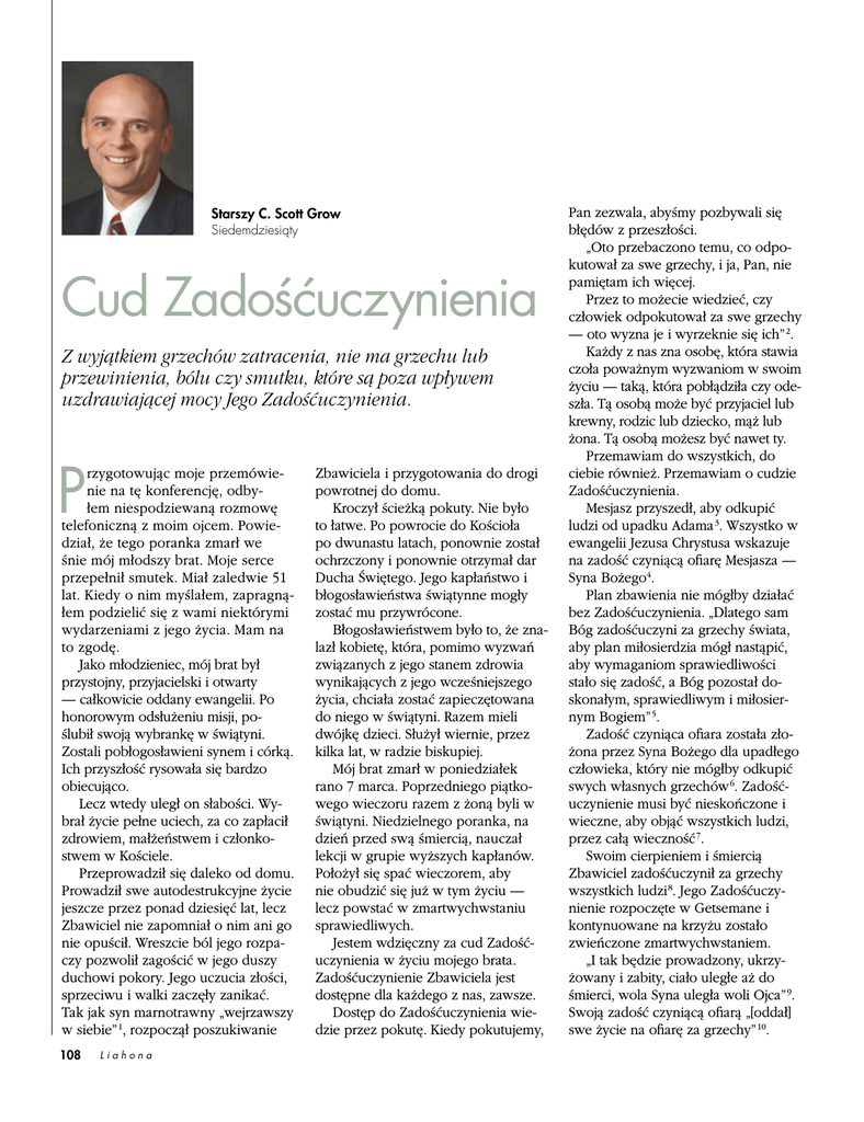 Starszy C. Scott Grow Siedemdziesiąty Cud Zadośćuczynienia Z wyjątkiem grzechów zatracenia, nie ma grzechu lub przewinienia, bólu czy smutku, które są poza wpływem uzdrawiającej mocy Jego Zadośćuczynienia. P rzygotowując moje przemówie nie na tę konferencję, odby łem niespodziewaną rozmowę telefoniczną z moim ojcem. Powie dział, że tego poranka zmarł we śnie mój młodszy brat. Moje serce przepełnił smutek. Miał zaledwie 51 lat. Kiedy o nim myślałem, zapragną łem podzielić się z wami niektórymi wydarzeniami z jego życia. Mam na to zgodę. Jako młodzieniec, mój brat był przystojny, przyjacielski i otwarty — całkowicie oddany ewangelii. Po honorowym odsłużeniu misji, po ślubił swoją wybrankę w świątyni. Zostali pobłogosławieni synem i córką. Ich przyszłość rysowała się bardzo obiecująco. Lecz wtedy uległ on słabości. Wy brał życie pełne uciech, za co zapłacił zdrowiem, małżeństwem i członko stwem w Kościele. Przeprowadził się daleko od domu. Prowadził swe autodestrukcyjne życie jeszcze przez ponad dziesięć lat, lecz Zbawiciel nie zapomniał o nim ani go nie opuścił. Wreszcie ból jego rozpa czy pozwolił zagościć w jego duszy duchowi pokory. Jego uczucia złości, sprzeciwu i walki zaczęły zanikać. Tak jak syn marnotrawny „wejrzawszy w siebie” 1, rozpoczął poszukiwanie 108 Liahona Zbawiciela i przygotowania do drogi powrotnej do domu. Kroczył ścieżką pokuty. Nie było to łatwe. Po powrocie do Kościoła po dwunastu latach, ponownie został ochrzczony i ponownie otrzymał dar Ducha Świętego. Jego kapłaństwo i błogosławieństwa świątynne mogły zostać mu przywrócone. Błogosławieństwem było to, że zna lazł kobietę, która, pomimo wyzwań związanych z jego stanem zdrowia wynikających z jego wcześniejszego życia, chciała zostać zapieczętowana do niego w świątyni. Razem mieli dwójkę dzieci. Służył wiernie, przez kilka lat, w radzie biskupiej. Mój brat zmarł w poniedziałek rano 7 marca. Poprzedniego piątko wego wieczoru razem z żoną byli w świątyni. Niedzielnego poranka, na dzień przed swą śmiercią, nauczał lekcji w grupie wyższych kapłanów. Położył się spać wieczorem, aby nie obudzić się już w tym życiu — lecz powstać w zmartwychwstaniu sprawiedliwych. Jestem wdzięczny za cud Zadość uczynienia w życiu mojego brata. Zadośćuczynienie Zbawiciela jest dostępne dla każdego z nas, zawsze. Dostęp do Zadośćuczynienia wie dzie przez pokutę. Kiedy pokutujemy, Pan zezwala, abyśmy pozbywali się błędów z przeszłości. „Oto przebaczono temu, co odpo kutował za swe grzechy, i ja, Pan, nie pamiętam ich więcej. Przez to możecie wiedzieć, czy człowiek odpokutował za swe grzechy — oto wyzna je i wyrzeknie się ich” 2. Każdy z nas zna osobę, która stawia czoła poważnym wyzwaniom w swoim życiu — taką, która pobłądziła czy ode szła. Tą osobą może być przyjaciel lub krewny, rodzic lub dziecko, mąż lub żona. Tą osobą możesz być nawet ty. Przemawiam do wszystkich, do ciebie również. Przemawiam o cudzie Zadośćuczynienia. Mesjasz przyszedł, aby odkupić ludzi od upadku Adama 3. Wszystko w ewangelii Jezusa Chrystusa wskazuje na zadość czyniącą ofiarę Mesjasza — Syna Bożego4. Plan zbawienia nie mógłby działać bez Zadośćuczynienia. „Dlatego sam Bóg zadośćuczyni za grzechy świata, aby plan miłosierdzia mógł nastąpić, aby wymaganiom sprawiedliwości stało się zadość, a Bóg pozostał do skonałym, sprawiedliwym i miłosier nym Bogiem” 5. Zadość czyniąca ofiara została zło żona przez Syna Bożego dla upadłego człowieka, który nie mógłby odkupić swych własnych grzechów 6. Zadość uczynienie musi być nieskończone i wieczne, aby objąć wszystkich ludzi, przez całą wieczność 7. Swoim cierpieniem i śmiercią Zbawiciel zadośćuczynił za grzechy wszystkich ludzi 8. Jego Zadośćuczy nienie rozpoczęte w Getsemane i kontynuowane na krzyżu zostało zwieńczone zmartwychwstaniem. „I tak będzie prowadzony, ukrzy żowany i zabity, ciało uległe aż do śmierci, wola Syna uległa woli Ojca” 9. Swoją zadość czyniącą ofiarą „[oddał] swe życie na ofiarę za grzechy” 10. Jako Jednorodzony Syn Boga odziedziczył moc nad śmiercią fizyczną. To pozwoliło Mu znieść to wszystko, kiedy cierpiał tak, że „żaden człowiek nie byłby w stanie tego przeżyć. Oto krew będzie się sączyła z każdego Jego poru, tak wielka będzie Jego męka za niegodziwość i występki Jego ludu” 11. Nie tylko zapłacił cenę za grzechy wszystkich ludzi, On również po szedł, „doświadczając boleści […] i [chorób] swego ludu”. Wziął również „na siebie ich słabości, aby Jego serce przepełniło się miłosierdziem […] aby przez doświadczenia w ciele poznał, jak może pomagać swoim w ich słabościach” 12. Zbawiciel czuł ciężar cierpienia całej ludzkości — ciężar grzechu i żałości. „On się obarczył naszym cier pieniem, dźwigał nasze boleści” 13. Przez Swe Zadośćuczynienie uzdrawia On nie tylko grzesznika; uzdrawia również niewinnych, którzy cierpią z powodu jego grzechów. Jeżeli niewinny rozwinie wiarę w Zadośćuczynienie Zbawiciela i prze baczy grzesznikowi, ten również może zostać uzdrowiony. Żyjemy w czasach, kiedy każdy z nas „[ma] potrzebę uwolnienia się od poczucia winy, które pojawia się w wyniku błędów i grzechów” 14. Kiedy pokutujemy, Zbawiciel usuwa wyrzuty sumienia z naszych dusz. Dzięki Jego zadość czyniącej ofierze nasze grzechy są nam odpuszczone. Z wyjątkiem grzechów zatracenia, Zadośćuczynienie jest stale dostępne dla każdego i bez względu na to, jak olbrzymi lub mały jest grzech, podlega on „[warunkom] pokuty” 15. Jezus Chrystus zaprasza nas do od pokutowania, abyśmy nie musieli zno sić pełni ciężaru naszych grzechów: „Abyś odpokutował […] cierpienia twoj