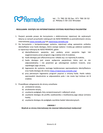 tel.: 71 780 30 50 fax: 071 780 30 52 ul. Mińska 5 50-153 Wrocław REGULAMIN DOSTĘPU DO INTERNETOWEGO SYSTEMU REJESTRACJI PACJENTÓW 1. Pacjent posiada prawo do korzystania z elektronicznej rejestracji do wybranych lekarzy w ramach przychodni należących do NZOZ REMEDIS za pośrednictwem strony internetowej www.remedis.org lub rejestracja.remedis.org 2. Do korzystania z komputerowego systemu rejestracji usług upoważnia unikalny identyfikator oraz hasło dostępu, które zostaje nadane i trzeba go odebrać osobiście w rejestracji należącej do NZOZ REMEDIS, gdzie: a) identyfikatorem pacjenta, jest podany przez pacjenta login lub wygenerowany przez program ciąg znaków (min 8 znaków), b) hasło dostępu jest alfanumeryczne i składa się z co najmniej 8 znaków, c) hasło dostępu jest znane wyłącznie pacjentowi, który jest za nie odpowiedzialny i nie powinien go udostępniać osobom trzecim, oraz zapobiegać jego utracie, d) logowanie do systemu wymaga każdorazowo wprowadzenia identyfikatora oraz hasła dostępu do strony https://rejestracja.remedis.org/ e) przy pierwszym logowaniu program poprosi o zmianę hasła. Hasło należy wprowadzić dwukrotnie w odpowiednie pola i nie może być krótsze niż 8 znaków. 3. Prawidłowe zalogowanie do strony umożliwia: a) umówienie wizyty, b) anulowanie wizyty, c) uzyskanie podglądu listy zarejestrowanych i odbytych wizyt, d) uzyskanie dostępu do profilu użytkownika z możliwością jego edycji (zmiana hasła), e) uzyskanie dostępu do podglądu wyników badań laboratoryjnych. UWAGA ! Wydruk ze strony internetowej nie stanowi dokumentacji medycznej! Strona 1 z 2 4. NZOZ REMEDIS nie ponosi odpowiedzialności za jakiekolwiek operacje wykonane przy użyciu hasła dostępu przez osoby trzecie. 5. NZOZ REMEDIS zobowiązuje się do przechowywania i udostępniania informacji powierzonych przez pacjenta w sposób zgodny z obowiązującym prawem o ochronie danych osobowych. 6. System udostępnia możliwość rezerwacji terminów wizyt w okresie: 24 godziny od daty bieżącej do końca bieżącego roku. 7. Warunkiem skutecznej rejestracji POZ jest posiadanie aktywnej deklaracji złożonej w NZOZ REMEDIS wypełnionej aktualnymi danymi personalnymi pacjenta. Jeśli tak nie jest pacjent powinien niezwłocznie złożyć nową deklaracje z wyborem lekarza. 8. Niedozwolone jest: a) umówienie wizyt do kilku lekarzy danej specjalności b) niewykorzystywanie umówionych wizyt Trzykrotne zarejestrowanie się i nie zrealizowanie zaplanowanej wizyty z winy pacjenta prowadzi do blokady całego konta. W celu odblokowania konta należy zgłosić się osobiście do rejestracji NZOZ REMEDIS (Przycisk KONTAKT w panelu logowania do rejestracji internetowej) 9. Podany czas przyjęcia pacjenta jest czasem orientacyjnym. 10. W przypadku wizyt prywatnych opłaty pobierane są w rejestracji przychodni przed wizytą. 11. W razie jakichkolwiek problemów z działaniem strony lub problemami z zalogowaniem prosimy o kontakt z rejestracją: ul. Mińska 5, 50-153 Wrocław, tel. 71 780 30 50. Strona 2 z 2