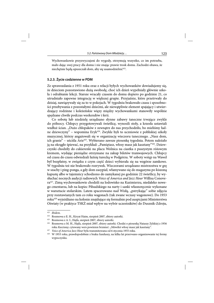 5.2. Państwowy Dom Młodzieży… 123 Wychowankowie przyzwyczajeni do wygody, otrzymują wszystko, co im potrzeba, mało dając swej pracy dla domu i nie znając prawie trosk domu. Zachodzi obawa, że niechętnie będą opuszczali dom, aby się usamodzielnić423. 5.2.3. Życie codzienne w PDM Ze sprawozdania z 1951 roku oraz z relacji byłych wychowanków dowiadujemy się, że dzieciom pozostawiono dużą swobodę, choć ich dzień wypełniały głównie szkoła i odrabianie lekcji. Starsze wracały czasem do domu dopiero po godzinie 21, co utrudniało zapewne integrację w większej grupie. Przyjaźnie, które przetrwały do dzisiaj, nawiązywały się za to w pokojach. W tygodniu brakowało czasu i sposobności przebywania z pozostałymi dziećmi, ale niewątpliwie element spajający i utwierdzający rodzinne i koleżeńskie więzy między wychowankami stanowiły wspólnie spędzane chwile podczas weekendów i ferii. Co sobotę lub niedzielę urządzano słynne zabawy taneczne trwające zwykle do północy. Chłopcy przygotowywali świetlicę, wynosili stoły, a krzesła ustawiali wzdłuż ścian. „Dużo chłopaków z zewnątrz do nas przychodziło, bo mieliśmy ładne dziewczyny” – wspomina Eryk424. Zwykle byli to uczniowie z pobliskiej szkoły muzycznej, którzy angażowali się w organizację wieczoru tanecznego. „Nasz dom, ich granie” – uściśla Arie425. Wybierano zawsze piosenkę tygodnia. Potem należało ją na okrągło śpiewać, na przykład: „Pamiętasz, włosy masz jak kasztany”426. Dziewczynki chodziły do cukierenki na placu Wolnica na ciastka z puszystym różowym kremem, wydając pieniądze otrzymane na zakup biletów tramwajowych. Chłopcy od czasu do czasu odwiedzali łaźnię turecką w Podgórzu. W soboty wstęp na Wawel był bezpłatny, w związku z czym część dzieci wybierała się na wzgórze zamkowe. W tygodniu też nie brakowało rozrywek. Wieczorami urządzano mistrzostwa w grę w szachy i ping-ponga, a gdy dom zasypiał, włamywano się do magazynu po kiszoną kapustę albo w tajemnicy schodzono do zamykanej po godzinie 22 świetlicy, by wysłuchać nocnych audycji radiowych Voice of America and Jazz Hour Willisa Conovera427. Zimą wychowankowie chodzili na lodowisko na Kazimierzu, niedaleko nowego cmentarza, lub na kopiec Piłsudskiego na narty i sanki własnoręcznie wykonane w warsztacie stolarskim. Latem spacerowano nad Wisłą, „pstrykając” sobie zdjęcia przy rozstawianych tam co roku wagonach (tak zwane wczasy wagonowe). Do 1953 roku428 wyjeżdżano na kolonie znajdujące się formalnie pod auspicjami Ministerstwa Oświaty (w praktyce TSKŻ miał wpływ na wybór uczestników) do Dusznik-Zdroju, 423 424 425 426 427 428 Ibidem. Rozmowa z E. H., Kiryat Haim, sierpień 2007, zbiory autorki. Rozmowa z A. I., Hajfa, sierpień 2007, zbiory autorki. Rozmowa z M. H., Hajfa, sierpień 2007, zbiory autorki. Chodzi o piosenkę Nataszy Zylskiej z 1956 roku Kasztany; cytowany wers powinien brzmieć: „Mówiłeś włosy masz jak kasztany”. Voice of America Jazz Hour była transmitowana od 6 stycznia 1955 roku. W 1953 roku, prawdopodobnie z braku funduszy, na kilka lat przerwano organizowanie tej formy wypoczynku. 124 5. Dom dziecka – zmierzch instytucji… łódzkiego ośrodka „Reymontówka”, Nowego Dworu nad Narwią i nad morze – do Darłówka i Ustki429. Nadal odbywały się próby chóru kierowanego przez Michała Lichta. Corocznie koncertowano na organizowanych festiwalach żydowskich zespołów amatorskich we Wrocławiu. W 1955 roku „Fołks Sztyme far undzere kinder” pisał o ciepłym przyjęciu krakowskich dzieci, ubranych w białe bluzeczki i czerwone chustki, które bardzo pięknie zaprezentowały się również od strony muzycznej430. Charakter, jaki przybrała codzienność w Państwowym Domu Młodzieży w Krakowie, nie podobał się władzom. Przedstawiciel Wydziału Oświaty WRN, wizytujący placówkę w maju 1951 roku, narzekał na brak porannych i wieczornych apeli, które byłyby okazją do podsumowania spraw dnia „przeżytego przez kolektyw, okazją do podkreślenia plusów lub minusów w postępie grup, jednostek czy pokoi, okazją do wykazania zdyscyplinowania młodzieży”. Skarżył się również na słabą działalność samorządu, brak zorganizowanego słuchania radia i wieczornego dziennika, zbyt rzadkie (odbywające się raz na tydzień) prasówki. Ponadto młodzież przychodziła do świetlicy, raczej indywidualnie niż grupowo, i to nie w celach wychowawczych, ale by poczytać gazety lub pograć w szachy czy warcaby. Twierdził również, że gazetki ścienne są obecnie wyczynami jednostek, a dziewczęta, które nie pomagają w pracowni krawieckiej, dbają wyłącznie o swój wygląd, starając się ładnie ubrać431. Działacze TSKŻ narzekali z kolei na niechętny udział podopiecznych w imprezach świetlicowych. Zaproszenia zbywali pytaniem: „A po co?”. To wymownie oddawało ich nastawienie do proponowanych form spędzania wolnego czasu. Dzieci wolały zajmować się sportem i lekturą. Czytano pozycje klasyki dziecięcej, jak Chata Wuja Toma Harriet Beecher Stowe czy utwory Charlesa Dickensa432. Co prawda, na zebraniu rady pedagogicznej zakładu podkreślano, że dzieci angażują się w prace na terenie placówki, sprzątają teren, pielęgnują ogród, wywożą żużel, jednak zainteresowanie sportem miało być „zbyt przesadne”, a lektura „niepotrzebna”433. Na tym tle nie dziwi zatem skarga wizytatora krakowskiego zakładu, który stwierdził, że w Państwowym Domu Młodzieży brakowało „pracy wychowawczej do uspołecznienia i upolitycznienia, do wychowania przez pracę”434. 5.2.4. Wychowanie w PDM Wychowanie w dawnym Żydowskim Domu Dziecka uległo pewnej modyfikacji wraz z wejściem w okres stalinowski. Przede wszystkim zrezygnowano z dotychczas 429 430 431 432 433 434 G. B erendt, op. cit., s. 209. „Fołks Sztyme far undzere kinder” 1955, nr 24. Sprawozdanie z wi
