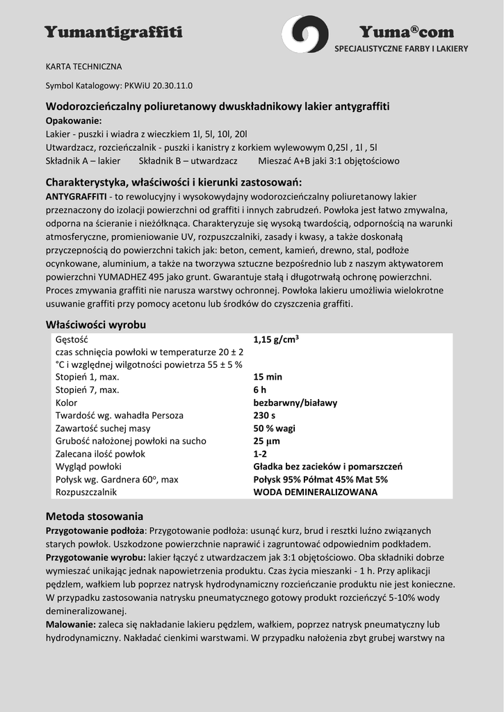 Yuma®com Yumantigraffiti SPECJALISTYCZNE FARBY I LAKIERY KARTA TECHNICZNA Symbol Katalogowy: PKWiU 20.30.11.0 Wodorozcieńczalny poliuretanowy dwuskładnikowy lakier antygraffiti Opakowanie: Lakier - puszki i wiadra z wieczkiem 1l, 5l, 10l, 20l Utwardzacz, rozcieńczalnik - puszki i kanistry z korkiem wylewowym 0,25l , 1l , 5l Składnik A – lakier Składnik B – utwardzacz Mieszać A+B jaki 3:1 objętościowo Charakterystyka, właściwości i kierunki zastosowań: ANTYGRAFFITI - to rewolucyjny i wysokowydajny wodorozcieńczalny poliuretanowy lakier przeznaczony do izolacji powierzchni od graffiti i innych zabrudzeń. Powłoka jest łatwo zmywalna, odporna na ścieranie i nieżółknąca. Charakteryzuje się wysoką twardością, odpornością na warunki atmosferyczne, promieniowanie UV, rozpuszczalniki, zasady i kwasy, a także doskonałą przyczepnością do powierzchni takich jak: beton, cement, kamień, drewno, stal, podłoże ocynkowane, aluminium, a także na tworzywa sztuczne bezpośrednio lub z naszym aktywatorem powierzchni YUMADHEZ 495 jako grunt. Gwarantuje stałą i długotrwałą ochronę powierzchni. Proces zmywania graffiti nie narusza warstwy ochronnej. Powłoka lakieru umożliwia wielokrotne usuwanie graffiti przy pomocy acetonu lub środków do czyszczenia graffiti. Właściwości wyrobu Gęstość czas schnięcia powłoki w temperaturze 20 ± 2 °C i względnej wilgotności powietrza 55 ± 5 % Stopień 1, max. Stopień 7, max. Kolor Twardość wg. wahadła Persoza Zawartość suchej masy Grubość nałożonej powłoki na sucho Zalecana ilość powłok Wygląd powłoki Połysk wg. Gardnera 60o, max Rozpuszczalnik 1,15 g/cm3 15 min 6h bezbarwny/białawy 230 s 50 % wagi 25 μm 1-2 Gładka bez zacieków i pomarszczeń Połysk 95% Półmat 45% Mat 5% WODA DEMINERALIZOWANA Metoda stosowania Przygotowanie podłoża: Przygotowanie podłoża: usunąć kurz, brud i resztki luźno związanych starych powłok. Uszkodzone powierzchnie naprawić i zagruntować odpowiednim podkładem. Przygotowanie wyrobu: lakier łączyć z utwardzaczem jak 3:1 objętościowo. Oba składniki dobrze wymieszać unikając jednak napowietrzenia produktu. Czas życia mieszanki - 1 h. Przy aplikacji pędzlem, wałkiem lub poprzez natrysk hydrodynamiczny rozcieńczanie produktu nie jest konieczne. W przypadku zastosowania natrysku pneumatycznego gotowy produkt rozcieńczyć 5-10% wody demineralizowanej. Malowanie: zaleca się nakładanie lakieru pędzlem, wałkiem, poprzez natrysk pneumatyczny lub hydrodynamiczny. Nakładać cienkimi warstwami. W przypadku nałożenia zbyt grubej warstwy na powierzchni mogą pojawić się pęcherzyki powietrza. Nanosić dwie warstwy o grubości 25 μm na sucho każda. Kolejną warstwę aplikować po 4-6 h. Przy natrysku na linii lakierniczej, możliwe zastosowanie techniki "mokre na mokre". Powłoka uzyskuje pełne właściwości wytrzymałościowe i ochronne po upływie 7 dni. Mycie narzędzi: narzędzia po zakończeniu prac malarskich umyć w wodzie. 20 m2/l. przy grubości warstwy 25 μm na sucho. Okres przydatności: 12 miesięcy od daty produkcji. Zalecenia bhp i p.poż. Produkt niepalny. Nie klasyfikowany jako materiał niebezpieczny. W trakcie prac malarskich i po ich zakończeniu pomieszczenie należy wietrzyć do zaniku charakterystycznego zapachu i po tym czasie nadaje się do użytkowania. Wyrób przechowywać w miejscu niedostępnym dla dzieci. Produkt wodorozcieńczalny, chronić przed mrozem i nasłonecznieniem. YUMACOM Zbigniew Kreczko jest gwarantem właściwej jakości produktu, pozostaje jednak bez wpływu na sposób i warunki jego stosowania. Informacje zawarte w karcie mają na celu zapewnienie optymalnego wykorzystania produktu, jednak nie są podstawą do odpowiedzialności prawnej producenta, gdyż warunki wykonawstwa pozostają poza jego kontrolą. Wszelka ingerencja w skład produktu jest niedopuszczalna i może w znaczny sposób obniżyć jakość produktu. W przypadku połączenia z wyrobami z innych firm producent nie ponosi żadnej odpowiedzialności za powstałe wady i szkody. Przedstawione powyżej informacje podane zostały w dobrej wierze, wg aktualnego stanu naszej wiedzy i doświadczenia praktycznego. Yumacom zastrzega sobie prawo do zmiany treści w kolejnych edycjach karty technicznej bez wcześniejszego informowania o tym fakcie odbiorców. Producent zastrzega sobie również pełne prawo do modyfikacji swoich produktów w ramach ich rozwoju technologicznego. Prosimy o weryfikację produktu pod kątem Państwa konkretnych zastosowań. YUMACOM Zbigniew Kreczko 43-440 Goleszów, ul. Przemysłowa 1A tel. +48 33 8513 425 tel. kom. +48 515 286 509 [email protected] www.yumacom.pl Yuma®com SPECJALISTYCZNE FARBY I LAKIERY